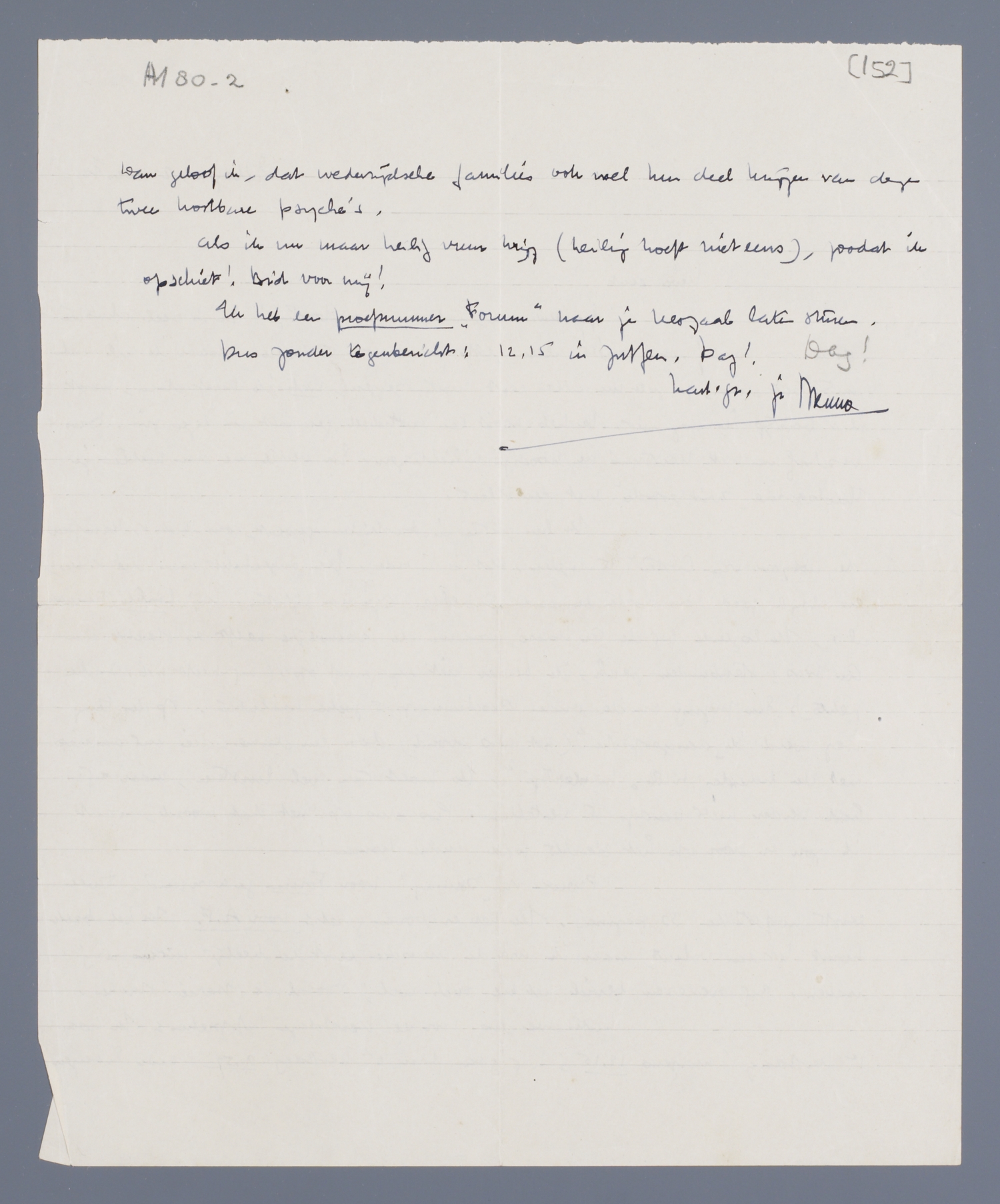 Proeven van ‘Dumay’ voor Forum gecorrigeerd, twee eerste hoofdstukken 33 pagina's. Ik heb er boven gezet: voor A.F. In het boek komt het dan voluit, maar ik wil de menschen eerst een beetje nieuwsgierig maken. Bij overlezen beviel het me toch wel; vooral de Marie-stukken.