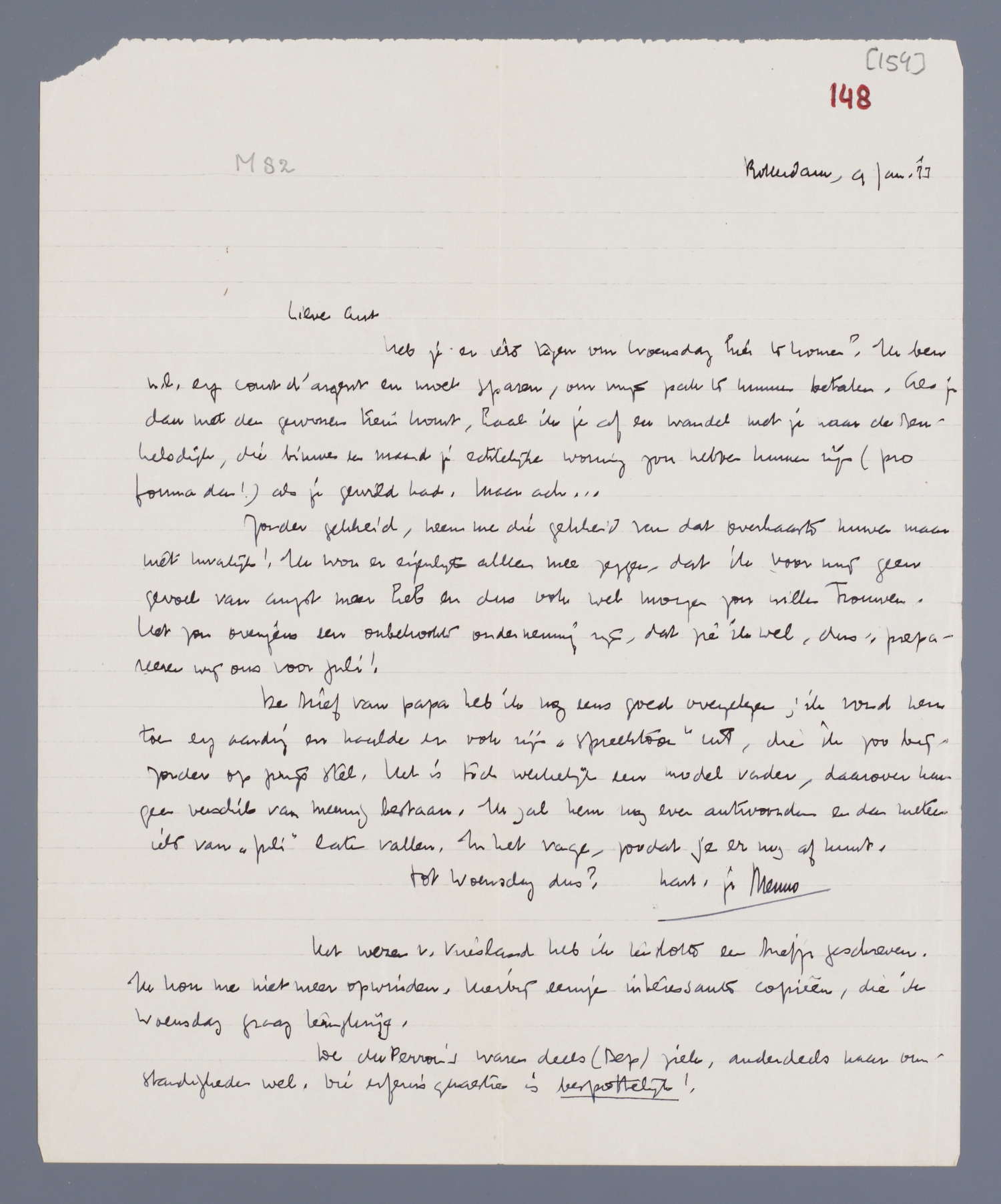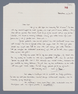 Heb je er iets tegen om Woensdag hier te komen? Ik ben n.l. erg court d'argent en moet sparen, om mijn pak te kunnen betalen. Als je dan met den gewonen trein komt, haal ik je af en wandel met je naar de Beukelsdijk, die binnen een maand je echtelijke woning zou hebben kunnen zijn (pro forma dan!) als je gewild had. Maar ach...