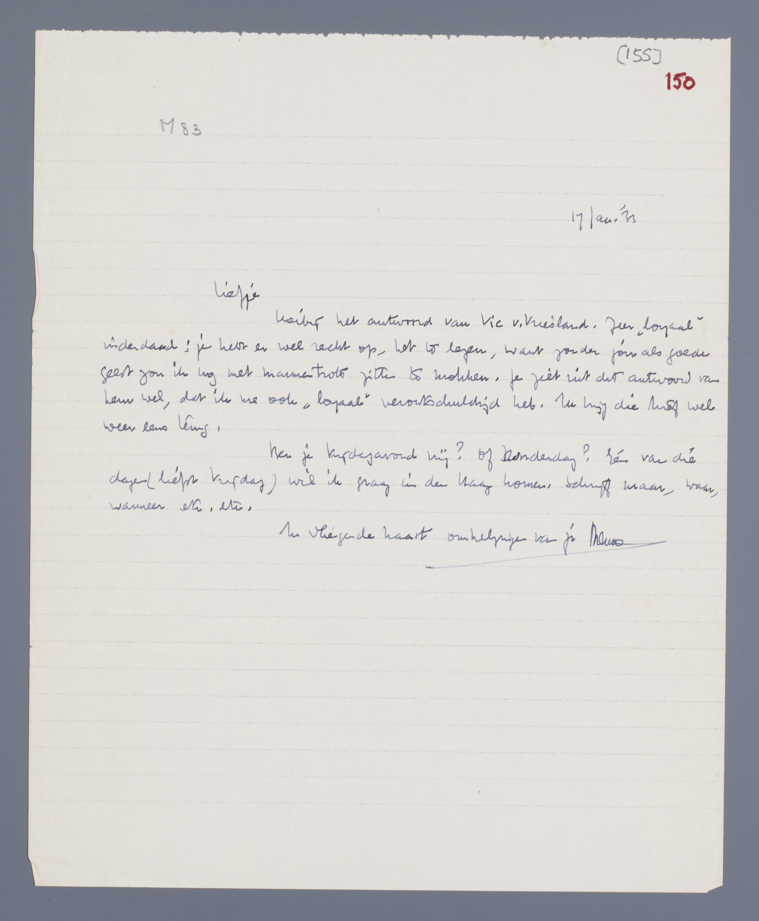 Hierbij het antwoord van Vic v. Vriesland. Zeer ‘loyaal’ inderdaad; je hebt er wel recht op, het te lezen, want zonder jou als goede geest zou ik met mannentrots zitten te mokken. Je ziet uit dit antwoord van hem wel, dat ik me ook ‘loyaal’ verontschuldigd heb. Ik krijg die brief wel weer eens terug.