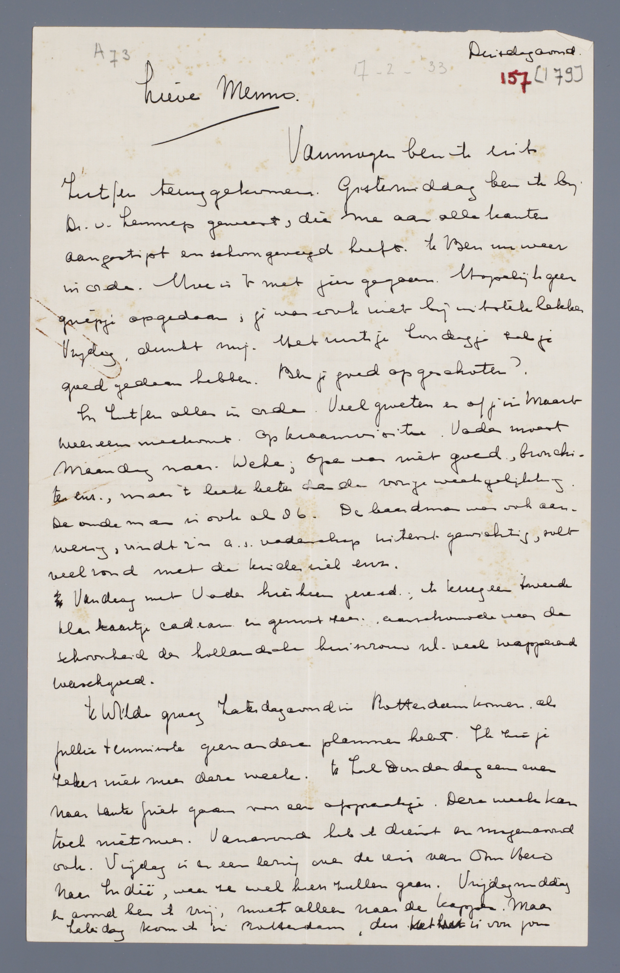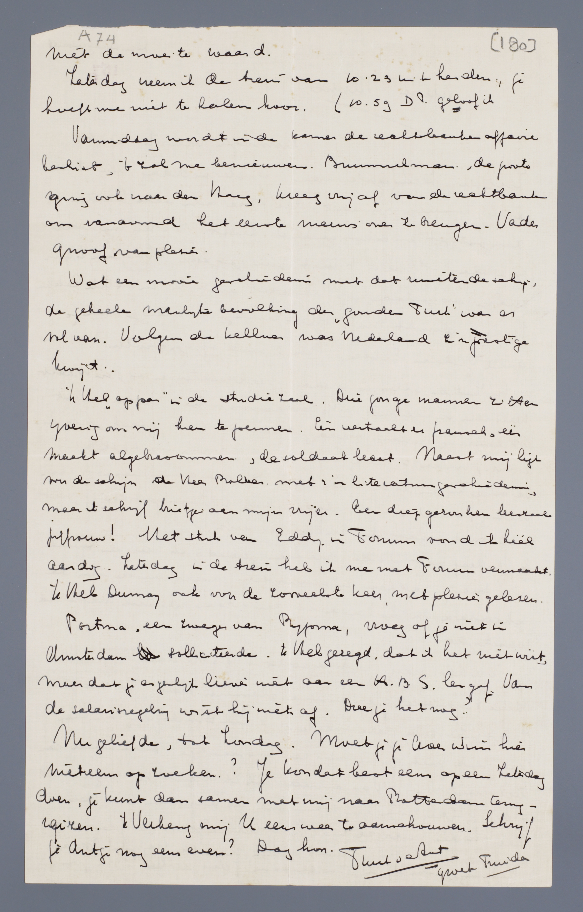 'k Wilde graag Zaterdagavond in Rotterdam komen, als jullie tenminste geen andere plannen hebt. Ik zie je zeker niet meer deze week. 'k Zal Donderdag eens even naar tante Griet gaan voor een afspraakje. Deze week kan toch niet meer. Vanavond heb ik dienst en morgenavond ook. Vrijdag is er een lezing over de reis van Oom Hero naar Indië, waar ze wel heen zullen gaan. Vrijdagmiddag en avond ben ik vrij, moet alleen naar de kapper. Maar Zaterdag kom ik in Rotterdam, dus het is voor jou niet de moeite waard.