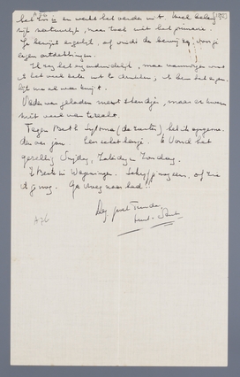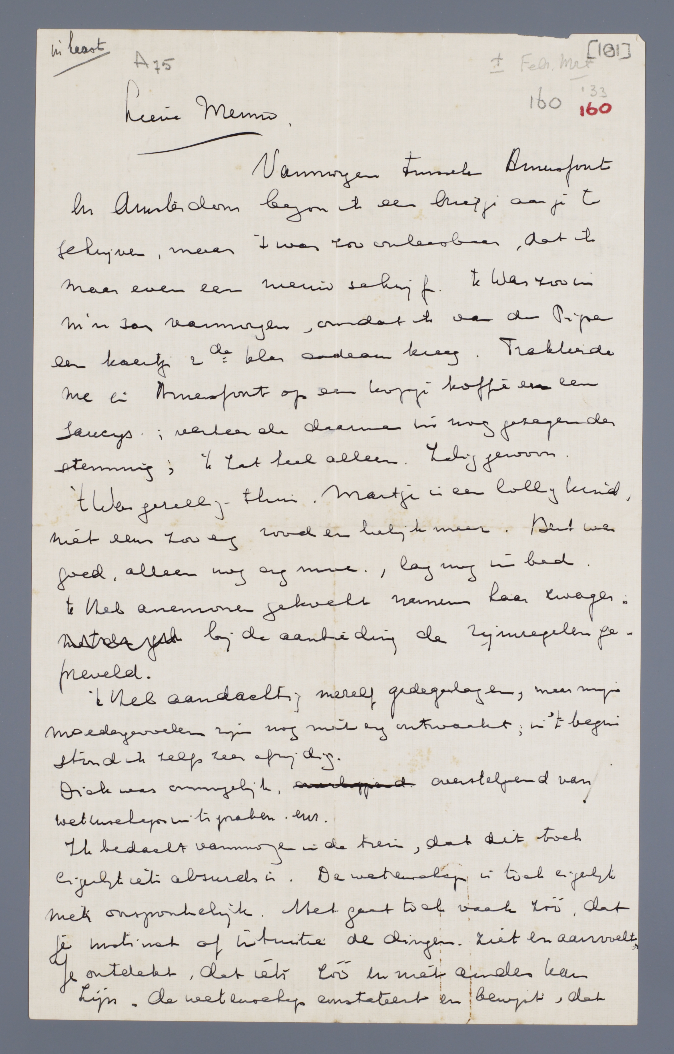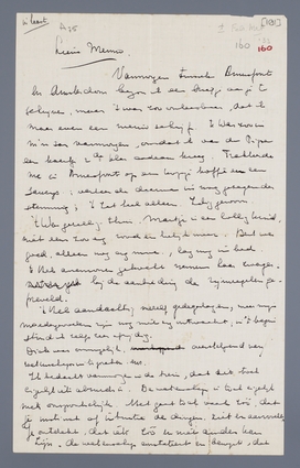 Vanmorgen tusschen Amersfoort en Amsterdam begon ik een briefje aan je te schrijven, maar 't was zoo onleesbaar, dat ik maar even een nieuw schrijf. 'k Was zoo in m'n sas vanmorgen, omdat ik van den Pipa een kaartje 2de klas cadeau kreeg. Trakteerde me in Amersfoort op een kopje koffie en een saucijs; verkeerde daarna in nog gezegender stemming; 'k zat heel alleen. Zalig gewoon.