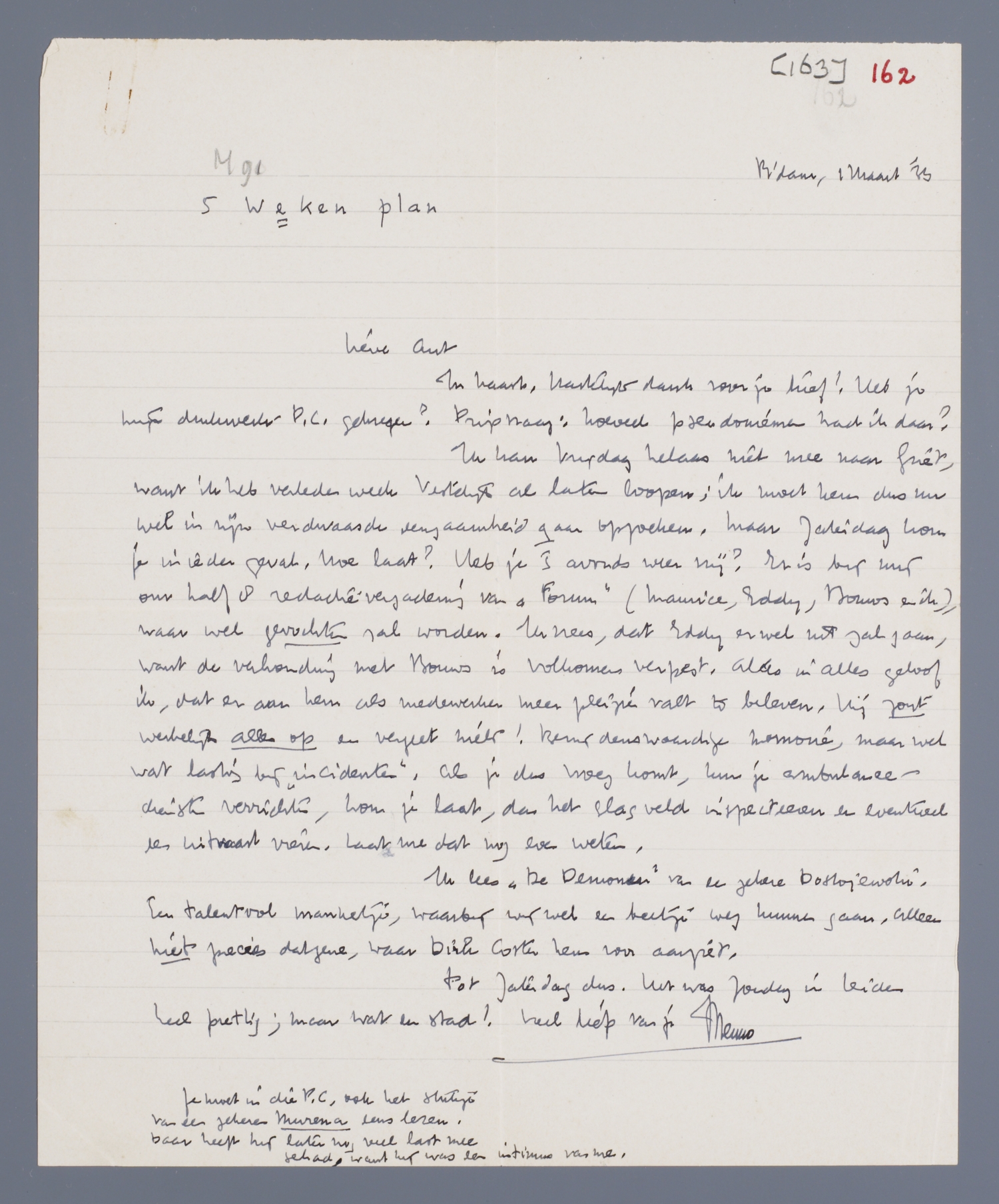 Ik kan Vrijdag helaas niet mee naar Griet, want ik heb verleden week Vestdijk al laten loopen; ik moet hem dus nu wel in zijn verdwaasde eenzaamheid gaan opzoeken. Maar Zaterdag kom je in ieder geval. Hoe laat? Heb je 's avonds weer vrij? Er is bij mij om half 8 redactievergadering van ‘Forum’ (Maurice, Eddy, Bouws en ik), waar wel gevochten zal worden. Ik vrees, dat Eddy er wel uit zal gaan, want de verhouding met Bouws is volkomen verpest. Alles in alles geloof ik, dat er aan hem als medewerker meer pleizier valt te beleven. Hij zout werkelijk alles op en vergeet niets! Benijdenswaardige memorie, maar wel wat lastig bij ‘incidenten’. Als je dus vroeg komt, kun je ambulance-diensten verrichten, kom je laat, dan het slagveld inspecteeren en eventueel een uitvaart vieren. Laat me dat nog even weten.