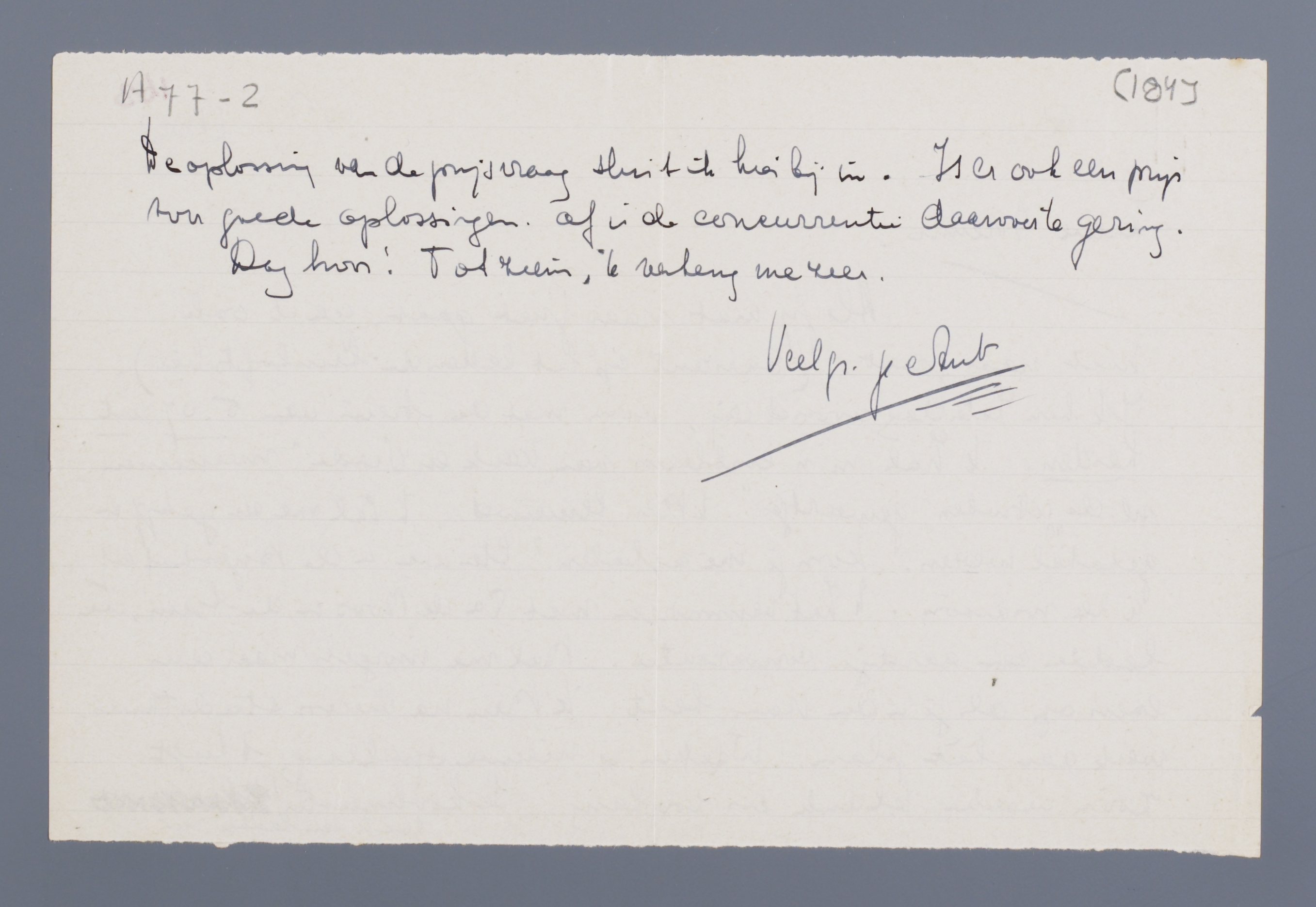 Als jij niet naar Griet gaat, ga ik ook niet naar Griet. (variant op het bekende bruiloftslied) Ik ben Zaterdagavond vrij, kom met de trein van 5.07 uit Leiden. 'k Zal m'n embleem van ‘Kerk en Vrede’ meenemen, nl. de ‘gebroken geweertjes’. 'k Ben benieuwd, 't zal me een gekijf en gekakel wezen. Kom je me afhalen? Eten we in de Bijenkorf of à la maison. 'k Zat vanmorgen met Pa de Roos in de tram, we hadden een aardige conversatie. Bel me morgen maar eens even op als je in den Haag bent. 'k Ben na vieren steeds thuis, werk aan hèt plan. We(e)ken is nieuwe spelling, 't heeft zoo'n weeke klank en zoo lang. Schoolmeester! toch een leuke vent.