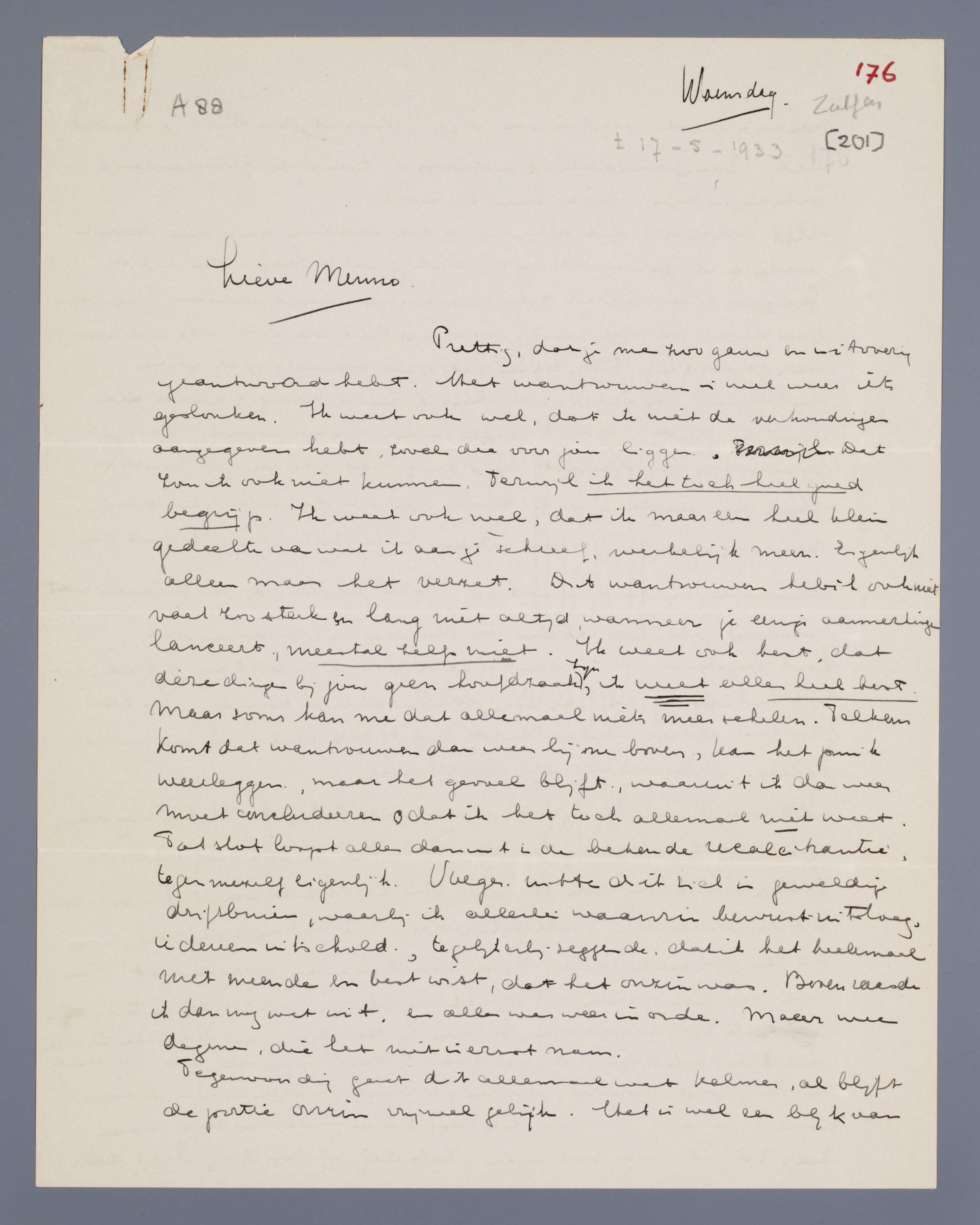 Prettig, dat je me zoo gauw en uitvoerig geantwoord hebt. Het wantrouwen is wel weer iets geslonken. Ik weet ook wel, dat ik niet de verhoudingen aangegeven hebt, zooals die voor jou liggen. Dat zou ik ook niet kunnen. Terwijl ik het toch heel goed begrijp. Ik weet ook wel, dat ik maar een heel klein gedeelte van wat ik aan je schreef, werkelijk meen. Eigenlijk alleen maar het verzet. Dat wantrouwen heb ik ook niet vaak zoo sterk en lang niet altijd, wanneer je eenige aanmerkingen lanceert, meestal zelfs niet. Ik weet ook best, dat deze dingen bij jou geen hoofdzaak zijn, ik weet alles heel best. Maar soms kan me dat allemaal niets meer schelen. Telkens komt dat wantrouwen dan weer bij me boven, kan het puik weerleggen, maar het gevoel blijft, waaruit ik dan weer moet concludeeren dat ik het toch allemaal niet weet. Tot slot loopt alles dan uit in de bekende recalcitrantie, tegen mezelf eigenlijk. Vroeger uitte dit zich in geweldige driftbuien, waarbij ik allerlei waanzin bewust uitsloeg, iedereen uitschold, tegelijk erbij zeggende dat ik het heelemaal niet meende en best wist, dat het onzin was. Boven raasde ik dan nog wat uit, en alles was weer in orde. Maar wee degene, die het niet in ernst nam.