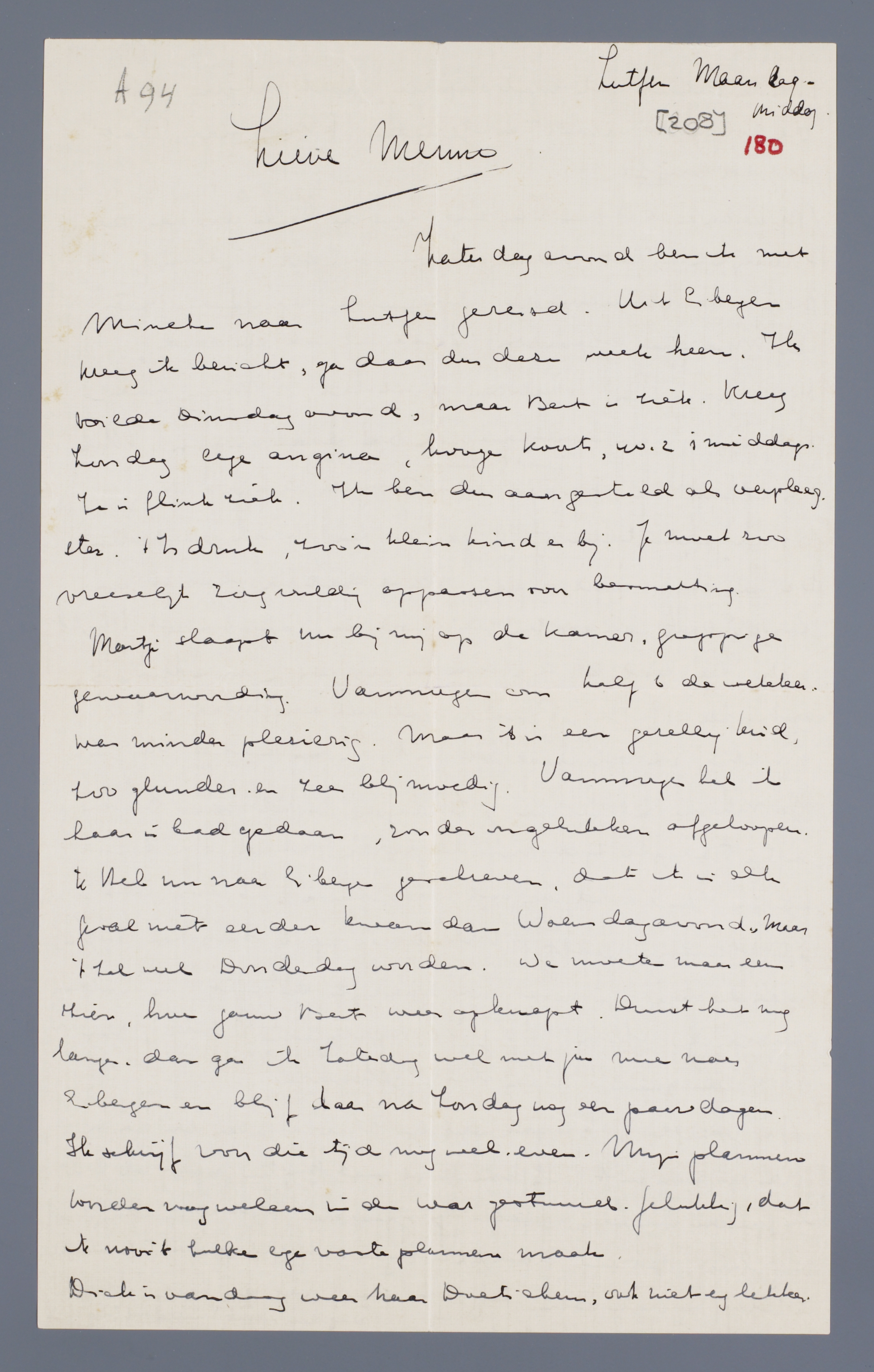 Zaterdagavond ben ik met Mineke naar Zutfen gereisd. Uit Eibergen kreeg ik bericht, ga daar dus deze week heen. Ik wilde Dinsdagavond, maar Bert is ziek. Kreeg Zondag erge angina, hooge koorts, 40.2 's middags. Ze is flink ziek. Ik ben dus aangesteld als verpleegster. 't Is druk, zoo'n klein kind er bij. Je moet zoo vreeselijk zorgvuldig oppassen voor besmetting.