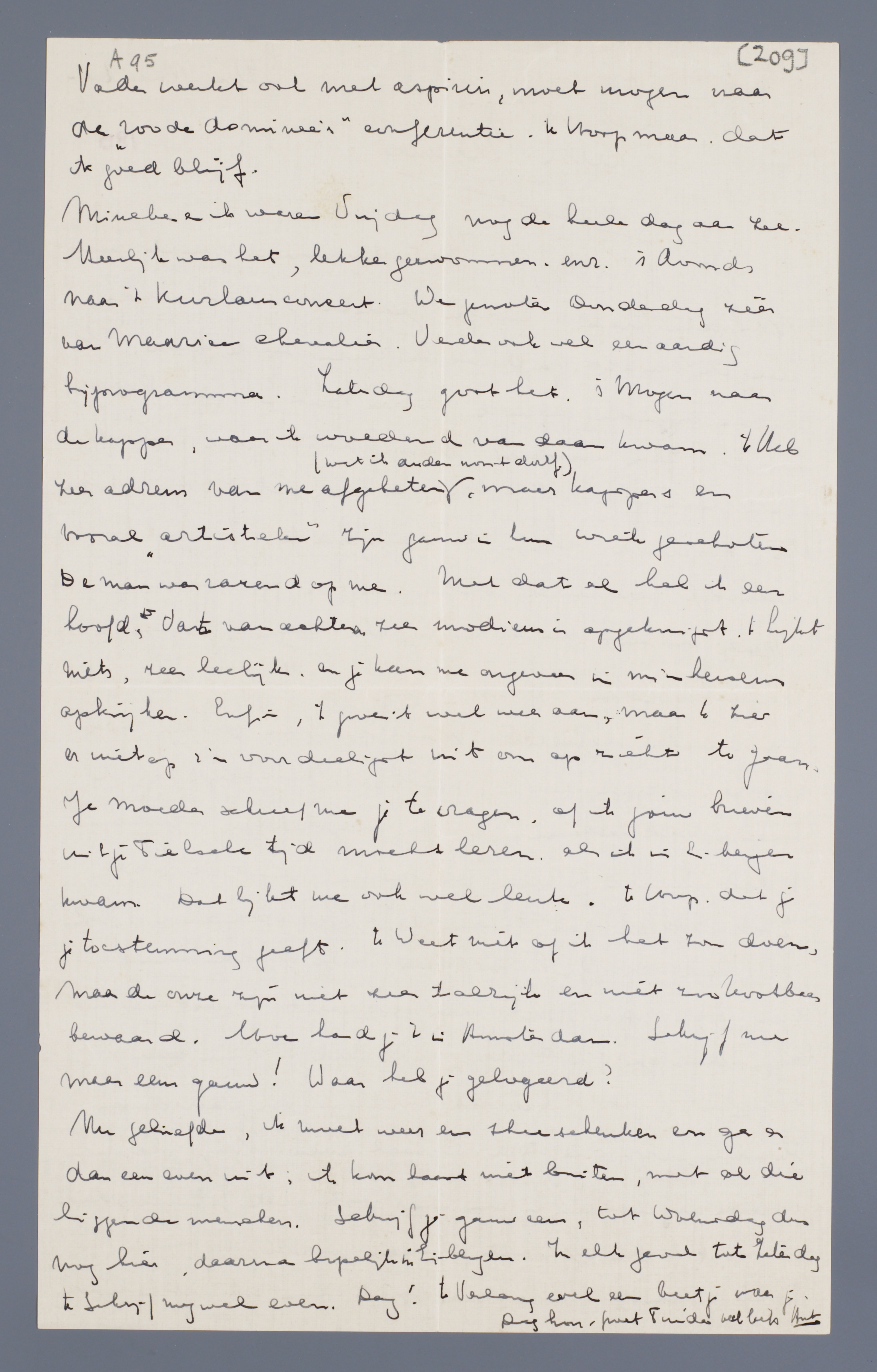 Mineke en ik waren Vrijdag nog de heele dag aan zee. Heerlijk was het, lekker gezwommen, enz. 's Avonds naar het Kurhausconcert. We genoten Donderdag zéér van Maurice Chevalier. Verder ook wel een aardig bijprogramma. Zaterdag goot het. 's Morgens naar de kapper, waar ik woedend vandaan kwam. 'k Heb zeer adrem van me afgebeten (wat ik anders nooit durf), maar kappers en vooral ‘artistieke’ zijn gauw in hun wiek geschoten. De man was razend op me. Met dat al heb ik een hoofd, dat van achteren zeer modieus is opgeknipt. 't Lijkt niets, zeer leelijk, en je kan me ongeveer in m'n hersens opkijken. Enfin, 't groeit wel weer aan, maar 'k zie er niet op z'n voordeeligst uit om op zicht te gaan.