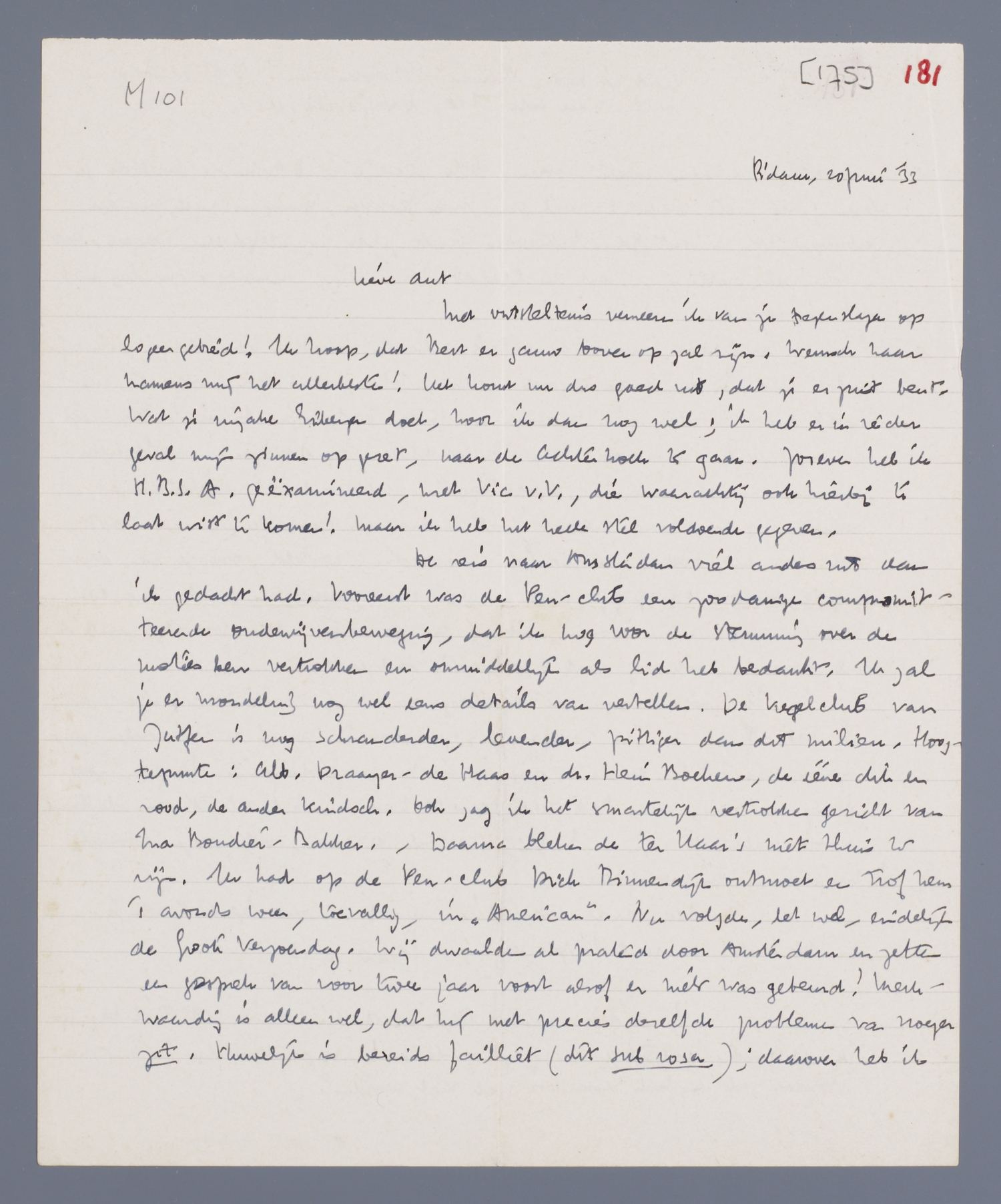 De reis naar Amsterdam viel anders uit dan ik gedacht had. Vooreerst was de Pen-club een zoodanige compromitteerende oudewijvenbeweging, dat ik nog voor de stemming over de moties ben vertrokken en onmiddellijk als lid heb bedankt. Ik zal je er mondeling nog wel eens details van vertellen. De kegelclub van Zutfen is nog schranderder, levender, pittiger dan dit milieu. Hoogtepunten: Alb. Draayer-de Haas en dr. Hein Boeken, de ééne dik en rood, de ander kindsch. Ook zag ik het smartelijk vertrokken gezicht van Ina Boudier-Bakker. - Daarna bleken de ter Haar's niet thuis te zijn. Ik had op de Pen-club Dick Binnendijk ontmoet en trof hem 's avonds weer, toevallig, in ‘American’. Nu volgde, let wel, eindelijk de Groote Verzoendag. Wij dwaalden al pratend door Amsterdam en zetten een gesprek van voor twee jaar voort alsof er niets was gebeurd! Merkwaardig is alleen wel, dat hij met precies dezelfde problemen van vroeger zit. Huwelijk is bereids failliet (dit sub rosa); daarover heb ik naargeestige verhalen moeten hooren. Ook uiterlijk is D.A.M. B. dezelfde gebleven; hij heeft werkelijk veel van Max Donner, maar is veelminder verburgerlijkt en verstijfd. Intusschen houdt Z. Ed. nog altijd een wagen. Dat is toch wel prettig. - Met de laatste trein terug Zaterdag. Zondag met Wim gepasseerd.