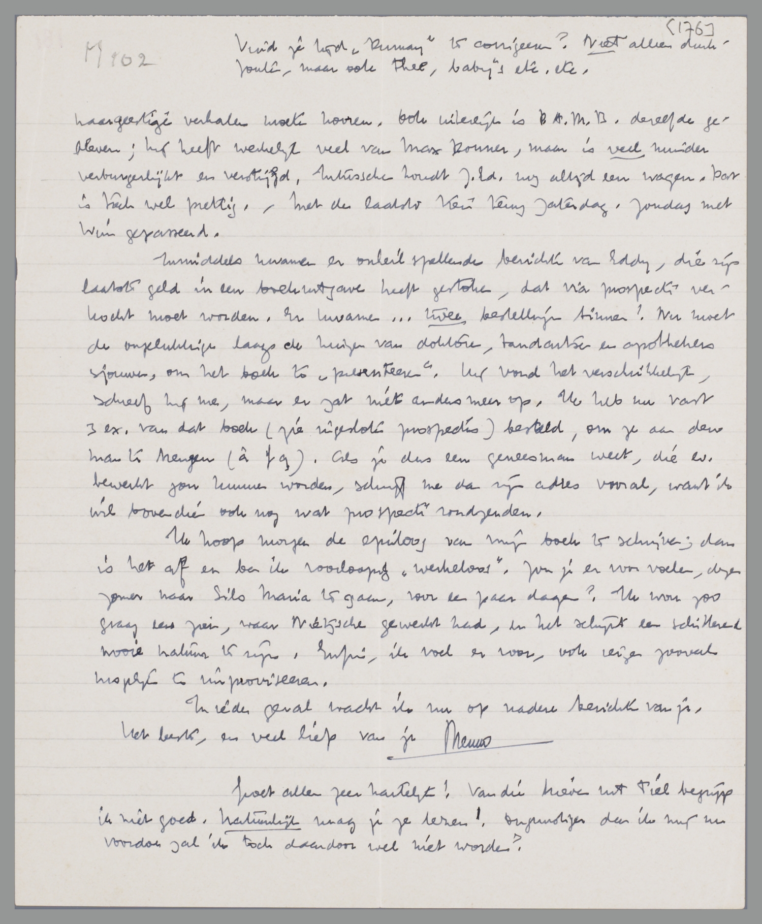 Ik hoop morgen de epiloog van mijn boek te schrijven; dan is het af en ben ik voorloopig ‘werkeloos’. Zou je er voor voelen, dezen zomer naar Sils Maria te gaan, voor een paar dagen? Ik wou zoo graag eens zien, waar Nietzsche gewerkt had, en het schijnt een schitterend mooie natuur te zijn. Enfin, ik voel er voor, ook reizen zooveel mogelijk te improviseeren.