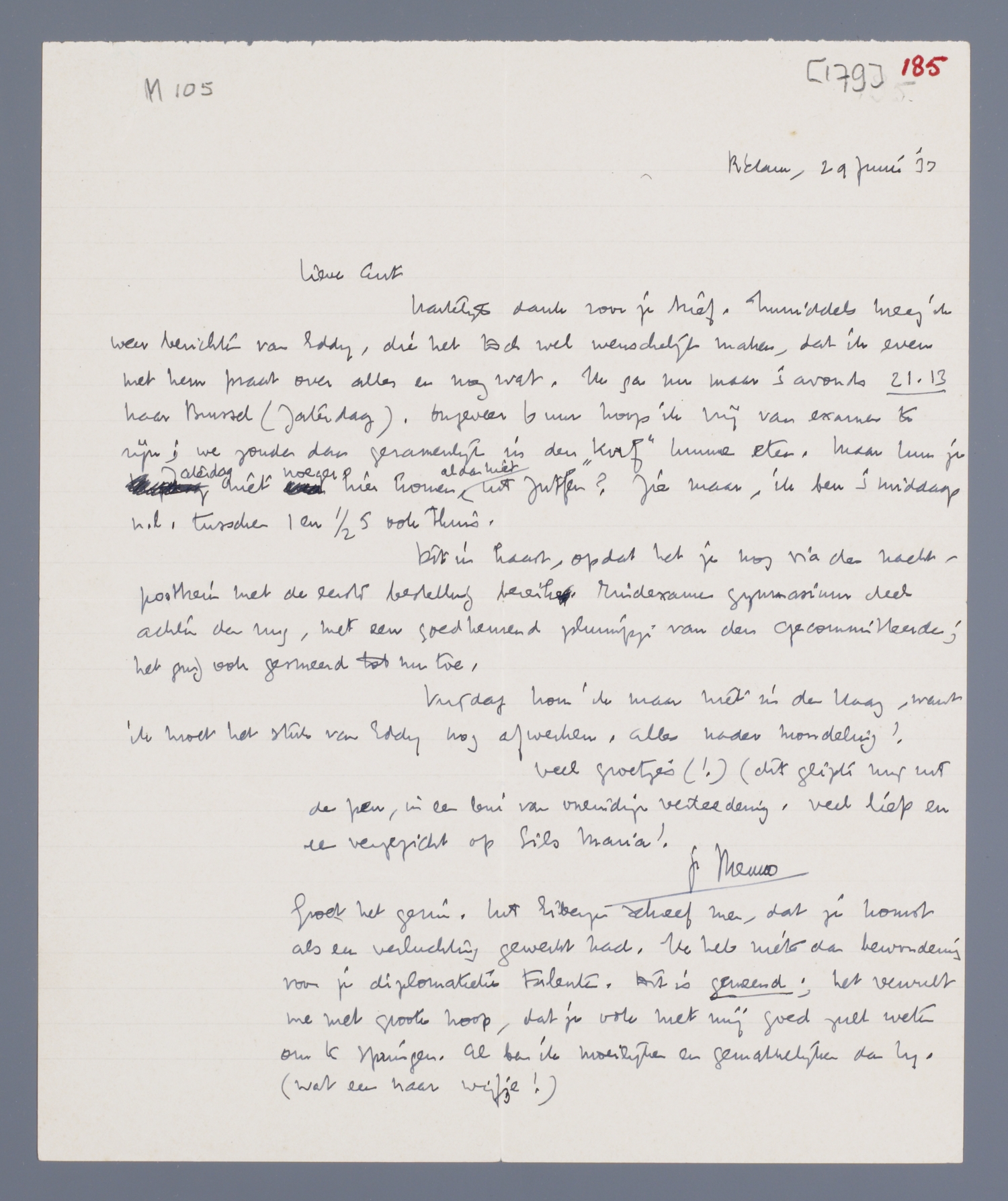 Hartelijk dank voor je brief. Inmiddels kreeg ik weer berichten van Eddy, die het toch wel wenschelijk maken, dat ik even met hem praat over alles en nog wat. Ik ga nu maar 's avonds 21.13 naar Brussel (Zaterdag). Ongeveer 6 uur hoop ik vrij van examens te zijn; we zouden dan gezamenlijk in den ‘Korf’ kunnen eten. Maar kun je Zaterdag niet vroeger hier komen, al dan niet uit Zutfen? Zie maar, ik ben 's middags n.l. tusschen 1 en ½5 ook thuis.