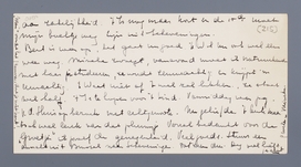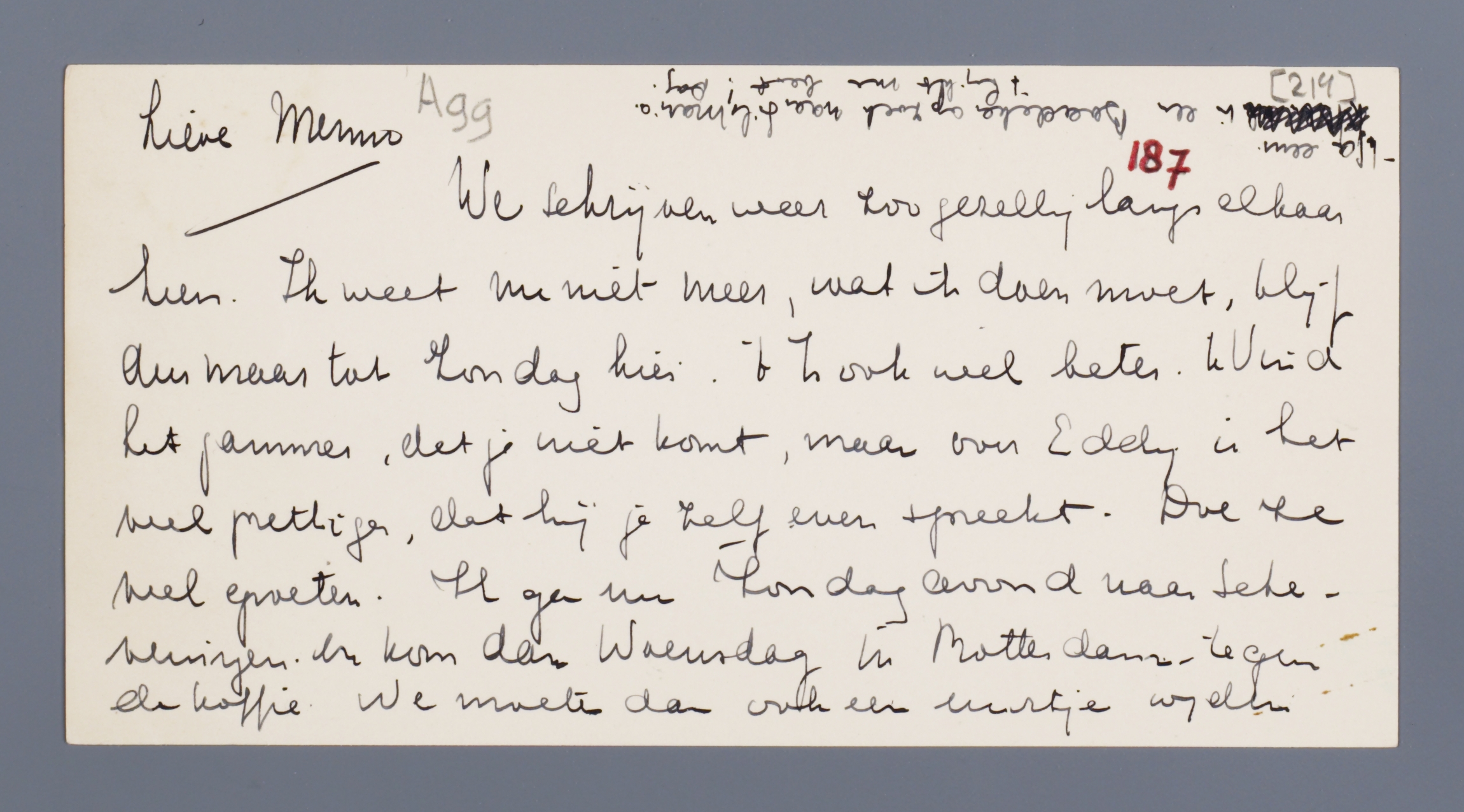 We schrijven weer zoo gezellig langs elkaar heen. Ik weet nu niet meer, wat ik doen moet, blijf dus maar tot Zondag hier. 't Is ook wel beter. 'k Vind het jammer, dat je niet komt, maar voor Eddy is het veel prettiger, dat hij je zelf even spreekt. Doe ze veel groeten. Ik ga nu Zondagavond naar Scheveningen en kom dan Woensdag in Rotterdam, tegen de koffie. We moeten dan ook een uurtje wijden aan zakelijkheid. 't Is nog maar kort en de 15de moet mijn boeltje weg zijn uit Scheveningen.