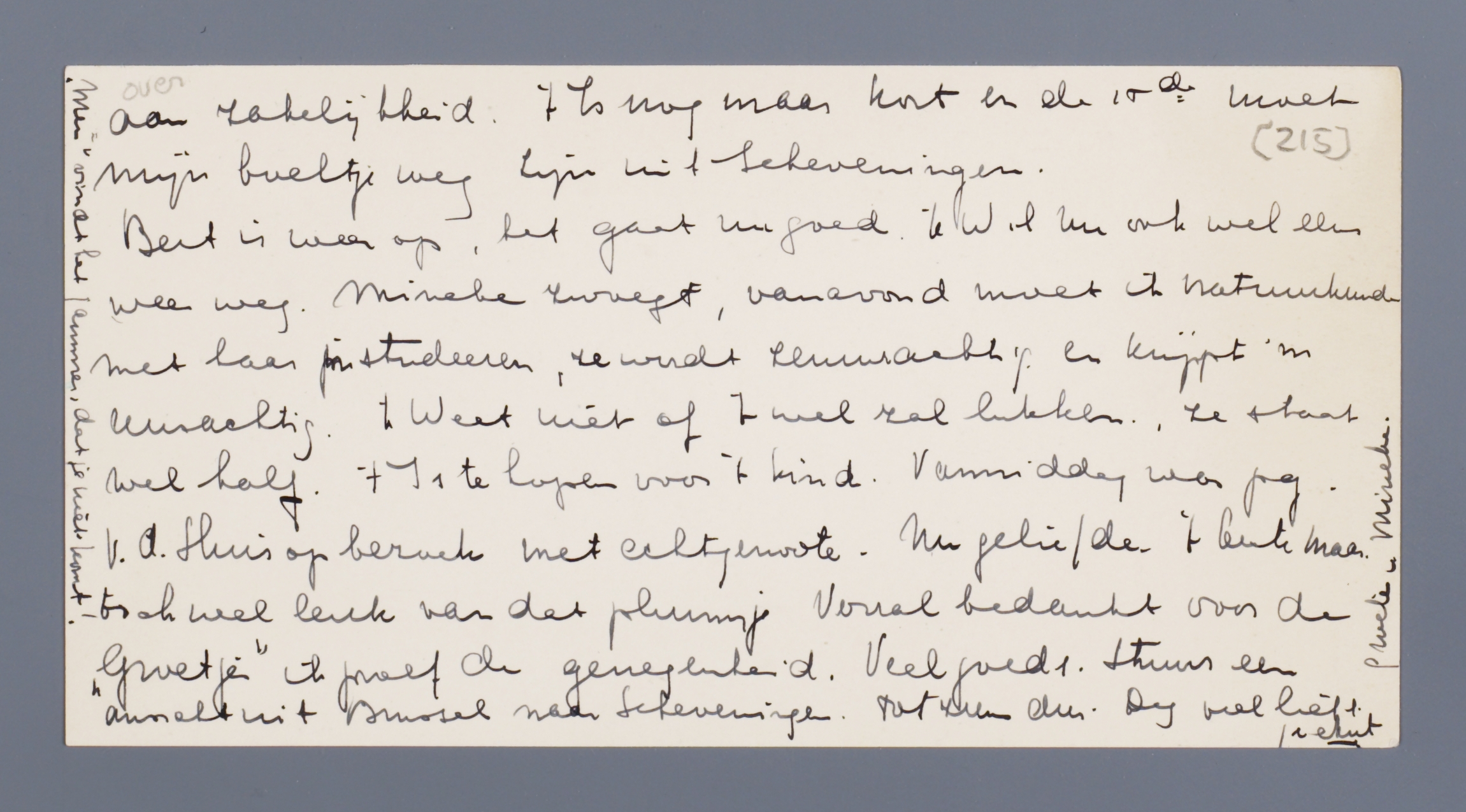 Nu geliefde, 't beste maar, toch wel leuk van dat pluimpje. Vooral bedankt voor de ‘Groetjes’ ik proef de genegenheid. Veel goeds. Stuur een ansicht uit Brussel naar Scheveningen.