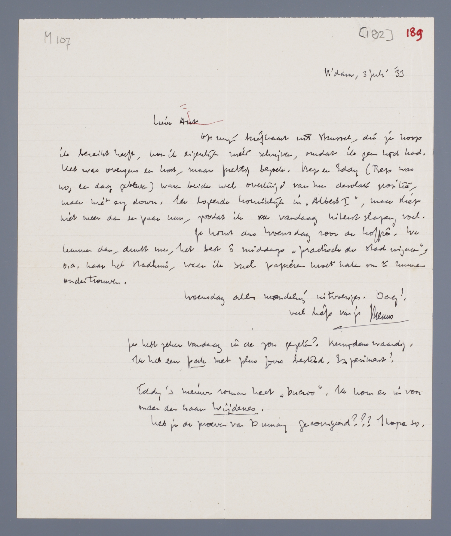Op mijn briefkaart uit Brussel, die je hoop ik bereikt heeft, wou ik eigenlijk niets schrijven, omdat ik geen tijd had. Het was overigens een kort, maar prettig bezoek. Bep en Eddy (Bep was nog een dag gebleven) waren beiden wel overtuigd van hun desolate positie, maar niet erg down. Ik logeerde koninklijk in ‘Albert I’, maar sliep niet meer dan een paar uur, zoodat ik me vandaag uiterst slaperig voel.