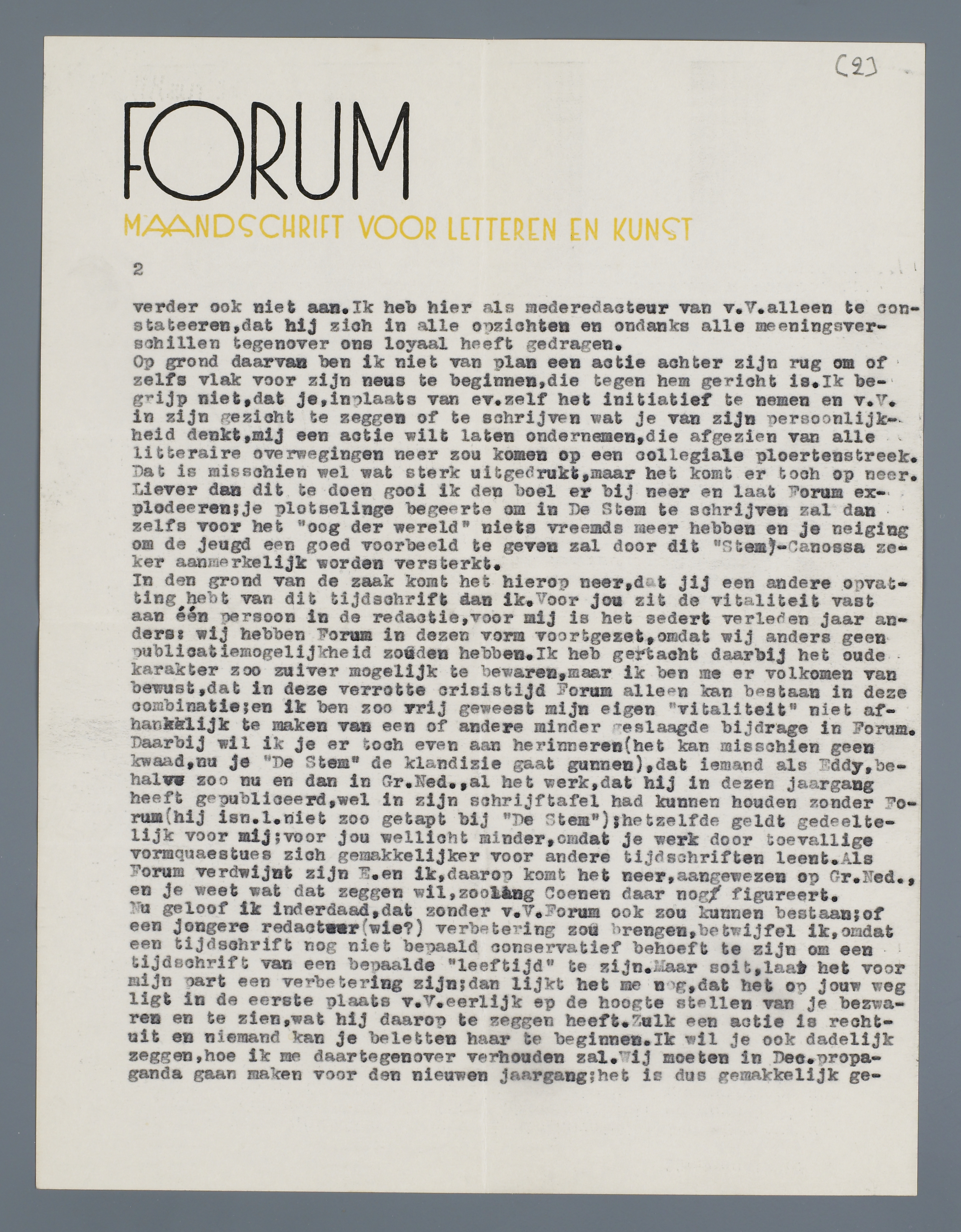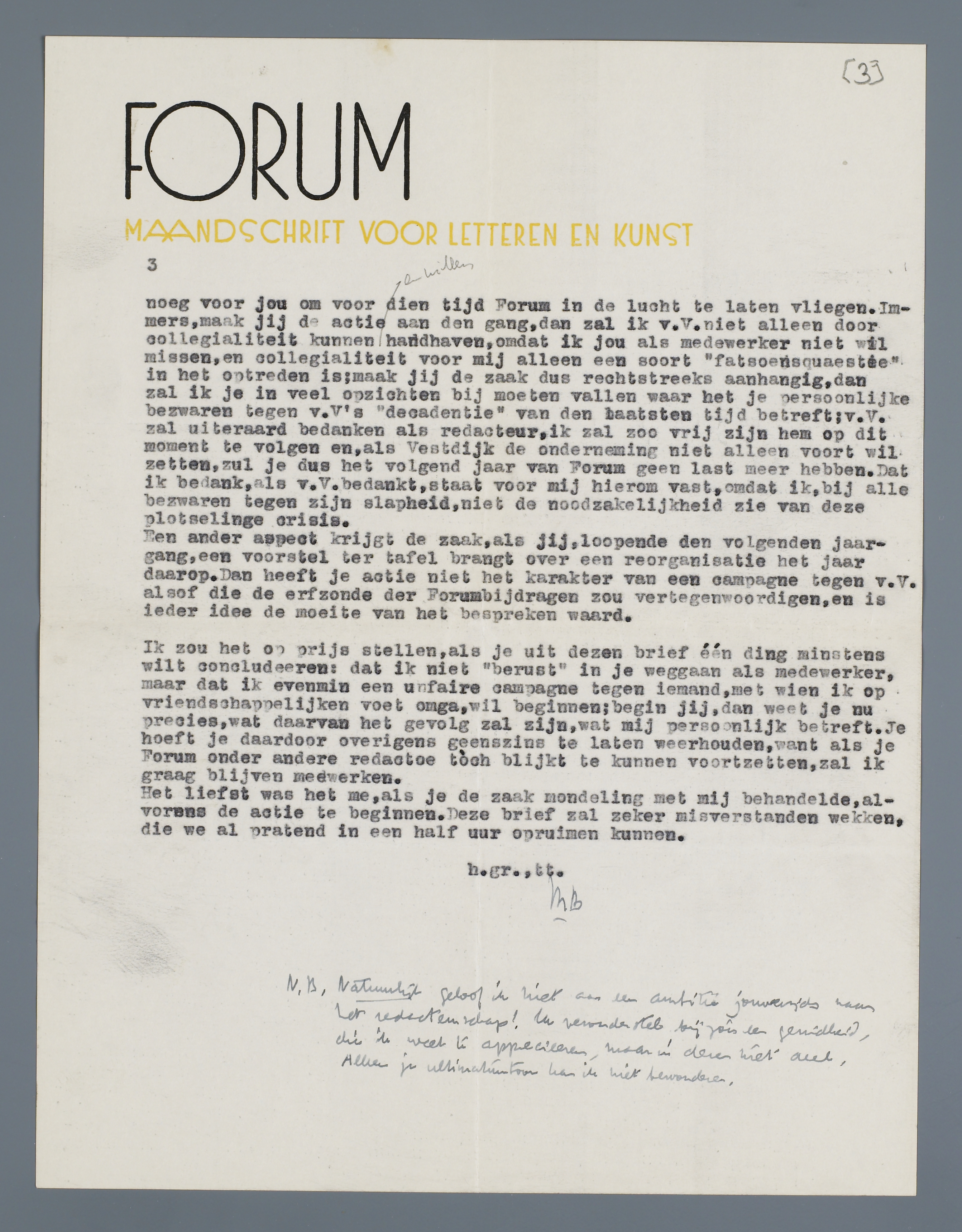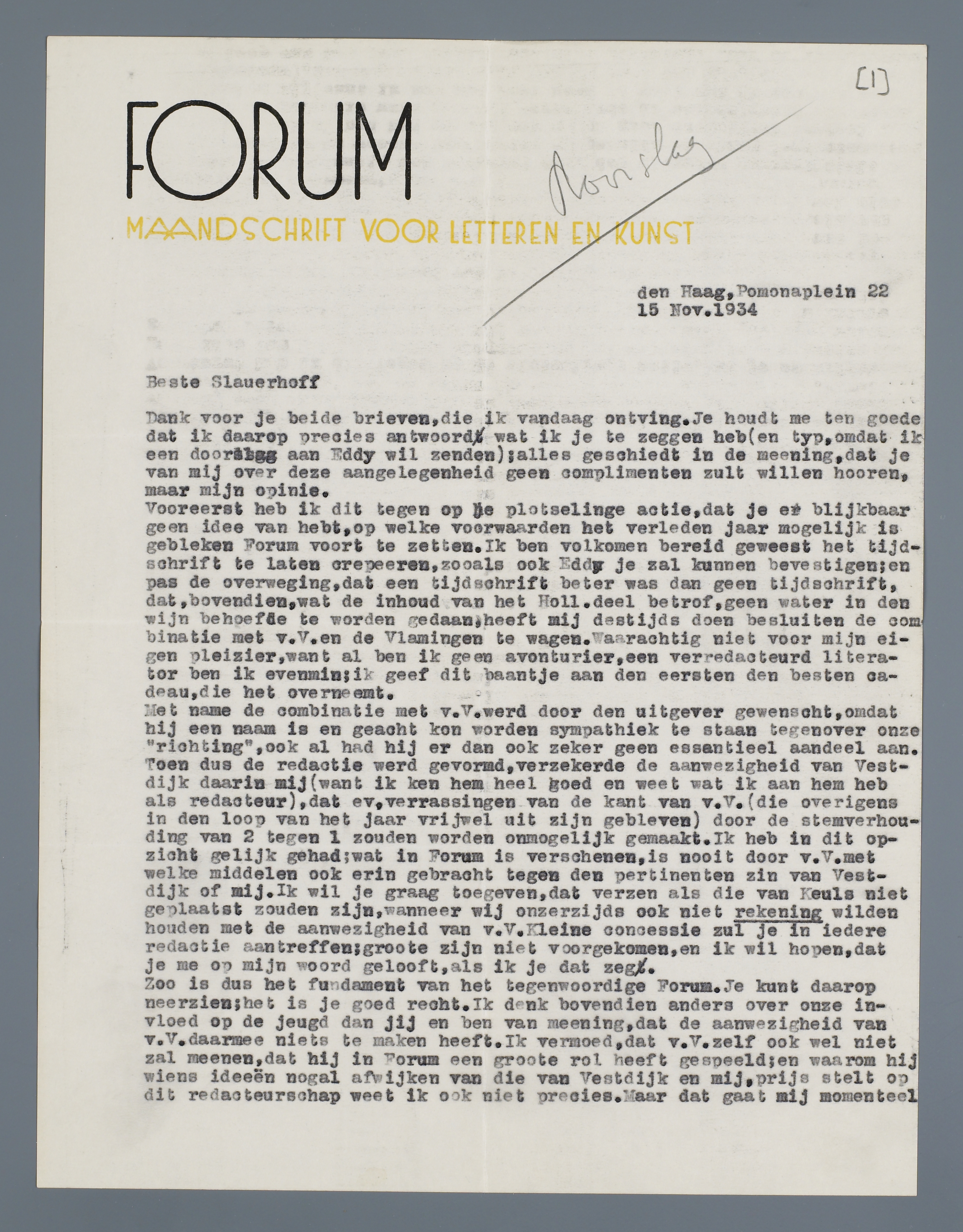 Vooreerst heb ik dit tegen op je plotselinge actie, dat je er blijkbaar geen idee van hebt, op welke voorwaarden het verleden jaar mogelijk is gebleken Forum voort te zetten. Ik ben volkomen bereid geweest het tijdschrift te laten crepeeren, zooals ook Eddy je zal bevestigen; en pas de overweging, dat een tijdschrift beter was dan geen tijdschrift, dat, bovendien, wat de inhoud van het Holl. deel betrof, geen water in den wijn behoefde te worden gedaan, heeft mij destijds doen besluiten de combinatie met v.V. en de Vlamingen te wagen. Waarachtig niet voor mijn eigen pleizier, want al ben ik geen avonturier, een verredacteurd literator ben ik evenmin; ik geef dit baantje aan de eersten den besten cadeau, die het overneemt.