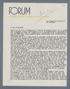 In den grond van den zaak komt het hier op neer, dat jij een andere opvatting hebt van dit tijdschrift dan ik. Voor jou zit de vitaliteit vast aan een persoon in de redactie, voor mij is het sedert verleden jaar anders: wij hebben Forum in dezen vorm voortgezet, omdat wij anders geen publicatiemogelijkheid zouden hebben. Ik heb getracht daarbij het oude karakter zoo zuiver mogelijk te bewaren, maar ik ben me er volkomen van bewust, dat in deze verrotte crisistijd Forum alleen kan bestaan in deze combinatie; en ik ben zoo vrij geweest mijn eigen ‘vitaliteit’ niet afhankelijk te maken van een of andere minder geslaagde bijdrage in Forum. Daarbij wil ik je er toch even aan herinneren (het kan misschien geen kwaad, nu je de ‘Stem’ de klandizie gaat gunnen), dat iemand als Eddy, behalve zoo nu en dan in Gr. Ned., al zijn werk, dat hij in dezen jaargang heeft gepubliceerd, wel in zijn schrijftafel had kunnen houden zonder Forum (hij is n.l. niet zoo getapt bij ‘De Stem’); hetzelfde geldt gedeeltelijk voor mij; voor jou wellicht minder, omdat je werk door toevallige vormquaesties zich gemakkelijker voor andere tijdschriften leent. Als Forum verdwijnt zijn E. en ik, daarop komt het neer, aangewezen op Gr. Ned., en je weet wat dat zeggen wil, zoolang Coenen daar nog figureert.