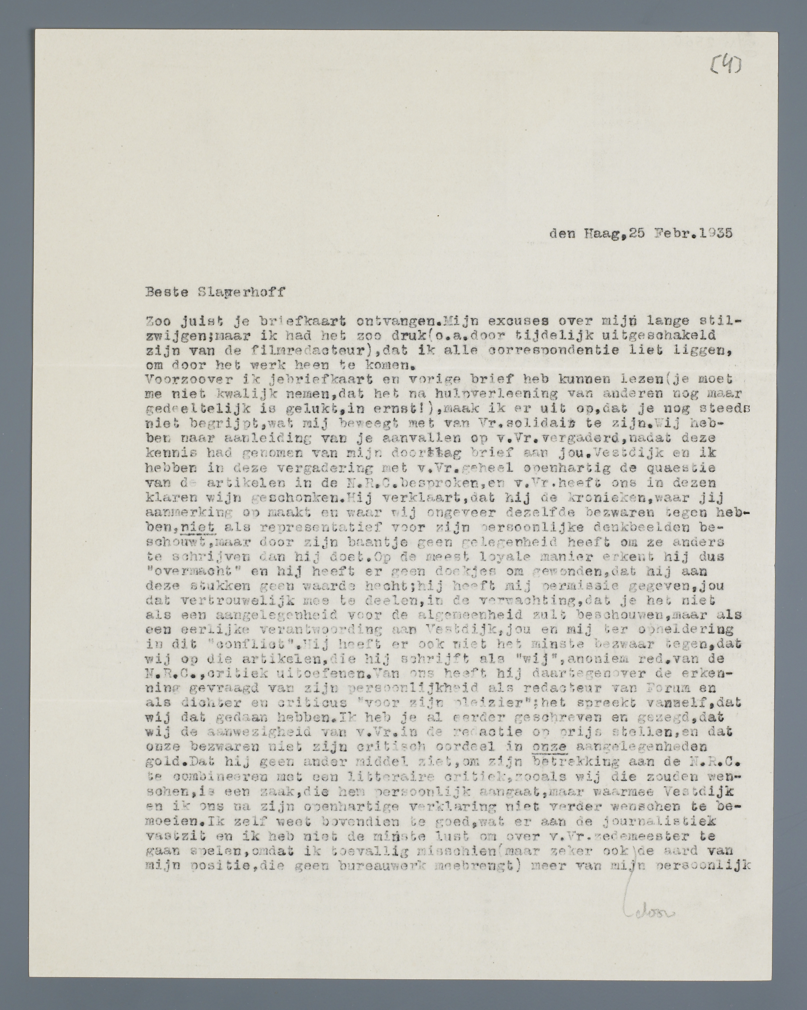 Voorzoover ik je briefkaart en vorige brief heb kunnen lezen (je moet me niet kwalijk nemen, dat het na hulpverleening van anderen nog maar gedeeltelijk is gelukt, in ernst!), maak ik er uit op, dat je nog steeds niet begrijpt, wat mij beweegt met van Vr. solidair te zijn. Wij hebben naar aanleiding van je aanvallen op v.Vr. vergaderd, nadat deze kennis had genomen van mijn doorslag brief aan jou. Vestdijk en ik hebben in deze vergadering met v.Vr. geheel openhartige de quaestie van de artikelen in de N.R.C. besproken, en v.V. heeft ons in dezen klaren wijn geschonken. Hij verklaart, dat hij de kronieken, waar jij aanmerking op maakt en waar wij ongeveer dezelfde bezwaren tegen hebben, niet als representatief voor zijn persoonlijke denkbeelden beschouwt, maar door zijn baantje geen gelegenheid heeft om ze anders te schrijven dan hij doet. Op de meest loyale manier erkent hij dus ‘overmacht’ en hij heeft er geen doekjes om gewonden, dat hij aan deze stukken geen waarde hecht; hij heeft mij permissie gegeven, jou dat vertrouwelijk mee te deelen, in de verwachting, dat je het niet als een aangelegenheid voor de algemeenheid zult beschouwen, maar als een eerlijke verantwoording aan Vestdijk, jou en mij ter opheldering in dit ‘conflict’. Hij heeft er ook niet het minste bezwaar tegen, dat wij op die artikelen, die hij schrijft als ‘wij’, anoniem red. van de N.R.C., critiek uitoefenen. Van ons heeft hij daartegenover de erkenning gevraagd van zijn persoonlijkheid als redacteur van Forum en als dichter en criticus ‘voor zijn pleizier’; het spreekt vanzelf, dat wij dat gedaan hebben. Ik heb je al eerder geschreven en gezegd, dat wij de aanwezigheid van v.Vr. in de redactie op prijs stellen, en dat onze bezwaren niet zijn critisch oordeel in onze aangelegenheden gold. Dat hij geen ander middel ziet, om zijn betrekking aan de N.R.C. te combineeren met een litterair critiek, zooals wij die zouden wenschen, is een zaak, die hem persoonlijk aangaat, maar waarmee Vestdijk en ik ons na zijn openhartige verklaring niet verder wenschen te bemoeien. Ik zelf weet bovendien te goed, wat er aan de journalistiek vastzit en ik heb niet de minste lust om over v.Vr. zedemeester te gaan spelen, omdat ik toevallig misschien (maar zeker ook door de aard van mijn positie, die geen bureauwerk meebrengt) meer van mijn persoonlijkheid in mijn artikelen kan onderbrengen.