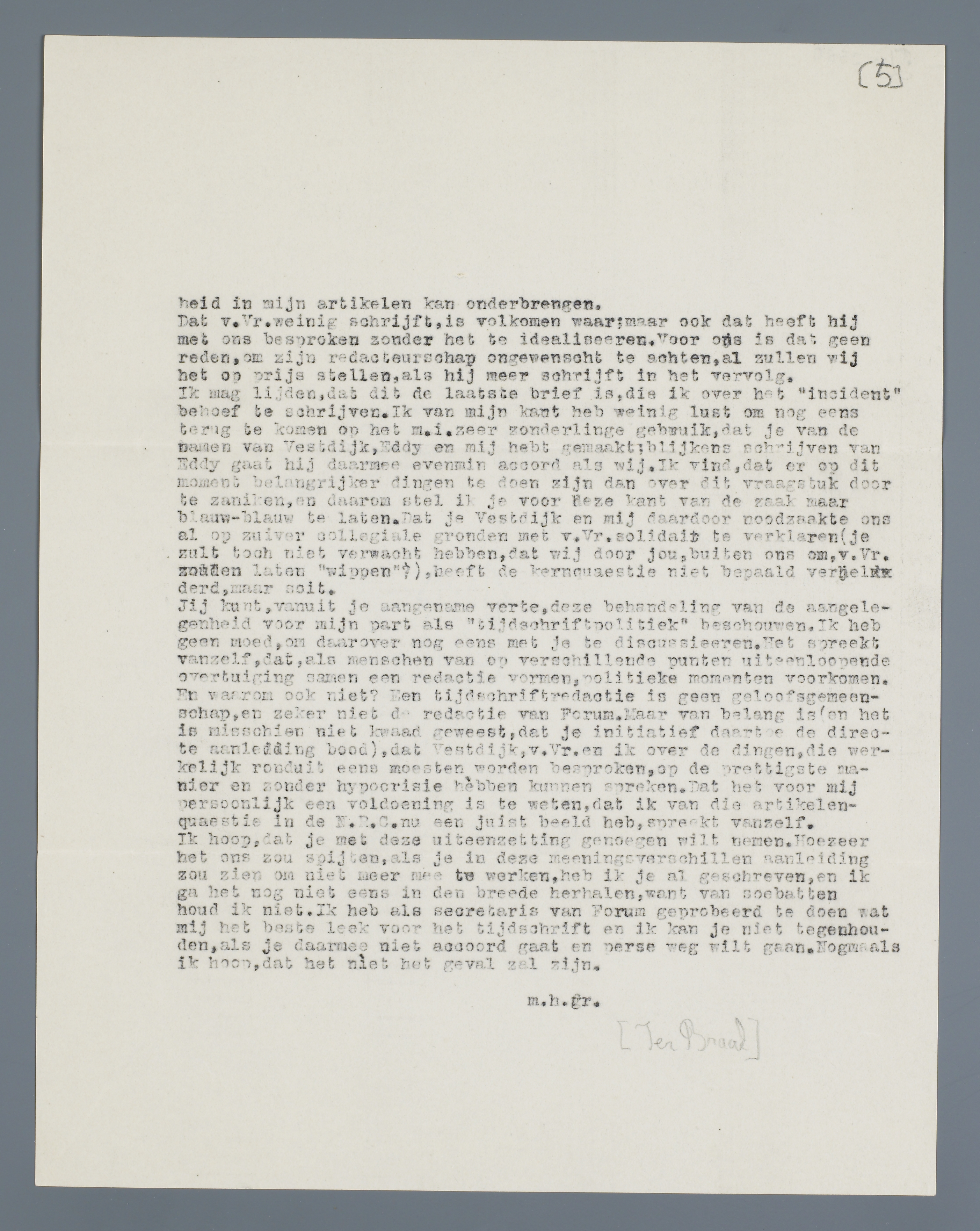 Ik hoop, dat je met deze uiteenzetting genoegen wilt nemen. Hoezeer het ons zou spijten, als je in deze meeningsverschillen aanleiding zou zien om niet meer mee te werken, heb ik je al geschreven, en ik ga het niet nog eens in den breede herhalen, want van soebatten houd ik niet. Ik heb als secretaris van Forum geprobeerd te doen wat mij het beste leek voor het tijdschrift en ik kan je niet tegenhouden, als je daarmee niet accoord gaat en perse weg wilt gaan. Nogmaals ik hoop, dat het niet het geval zal zijn.