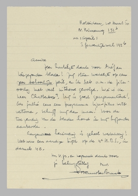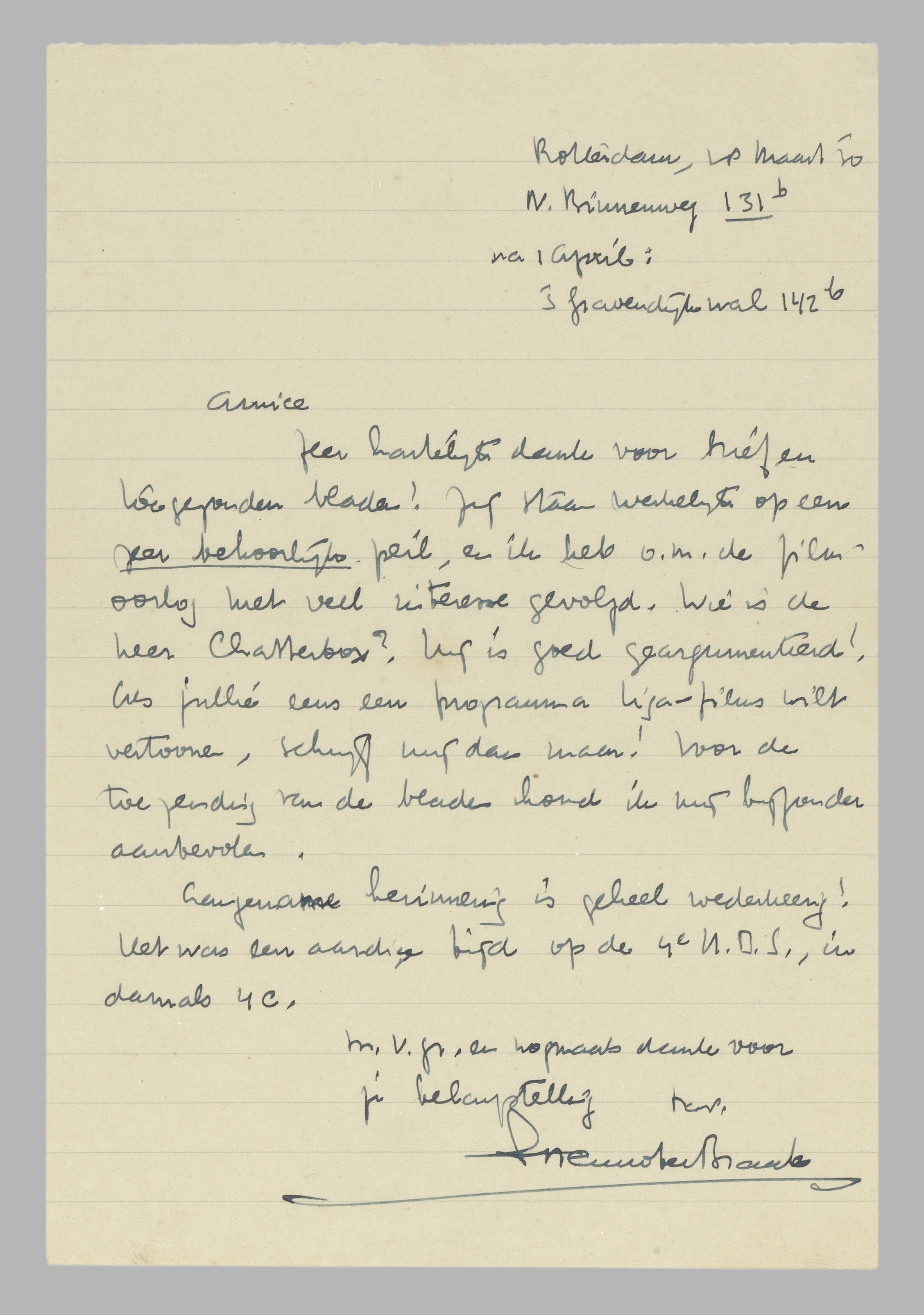 Zeer hartelijk dank voor brief en toegezonden bladen! Zij staan werkelijk op een zeer behoorlijk peil, en ik heb o.m. de film-oorlog met veel interesse gevolgd. Wie is de heer Chatterbey? Hij is goed geargumenteerd! Als jullie eens een programma liga-films wilt vertoonen, schrijf mij dan maar! Voor de toezending van de bladen houd ik mij bijzonder aanbevolen.