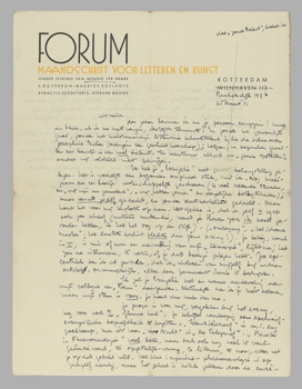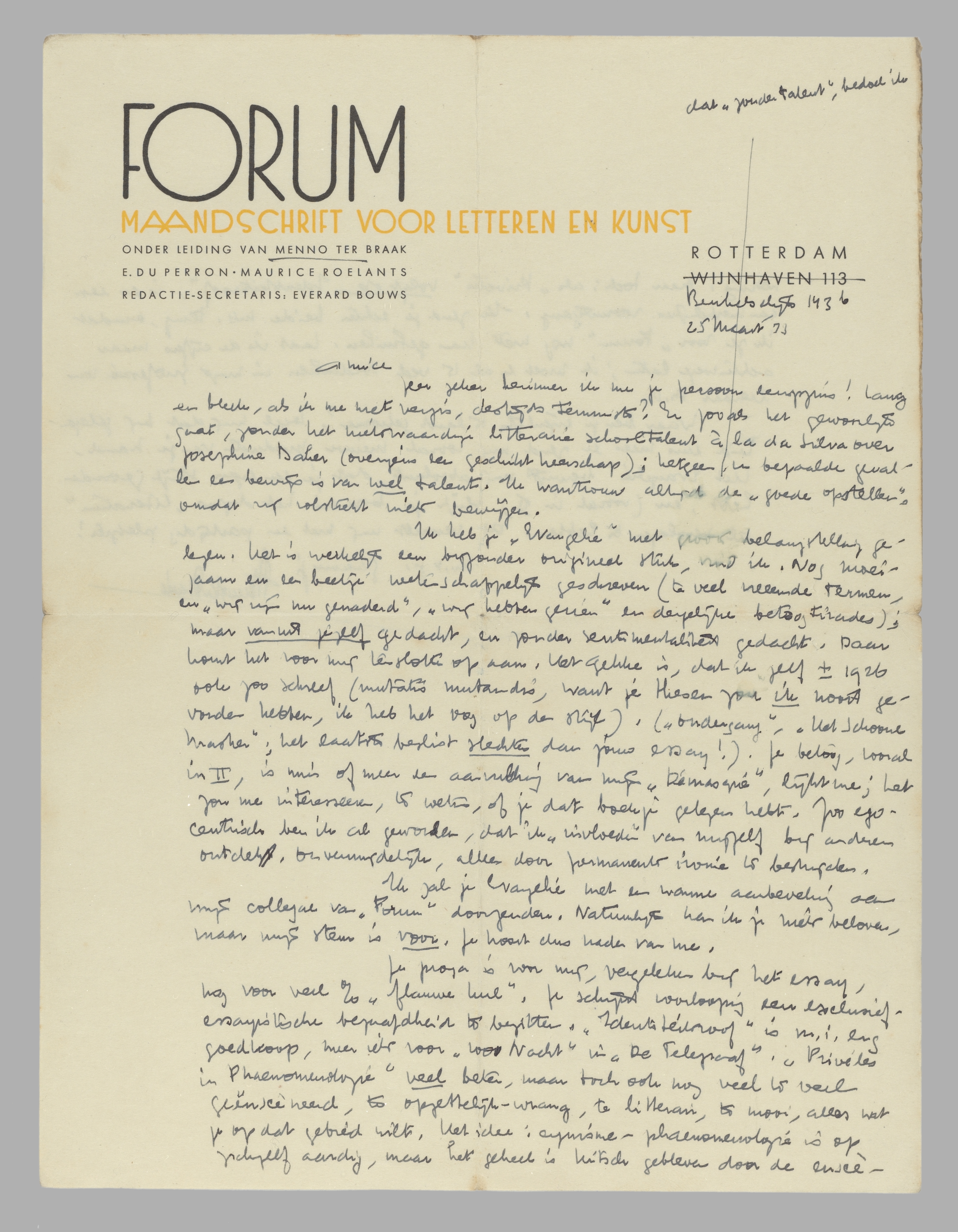 Ik heb je ‘Evangelie’ met groote belangstelling gelezen. Het is werkelijk een bijzonder origineel stuk, vind ik. Nog moeizaam en een beetje wetenschappelijk geschreven (te veel vreemde termen, en ‘wij zijn nu genaderd’, ‘wij hebben gezien’ en dergelijke betoogtirades); maar vanuit jezelf gedacht, en zonder sentimentaliteit gedacht. Daar komt het voor mij tenslotte op aan. Het gekke is, dat ik zelf ± 1926 ook zoo schreef (mutatis mutandis, want je [x] zou ik nooit gevonden hebben, ik heb het oog op de stijl), (‘ondergang’, ‘Het Schoone masker’; het laatste beslist slechter dan jouw essay!). Je betoog, vooral in II, is min of meer