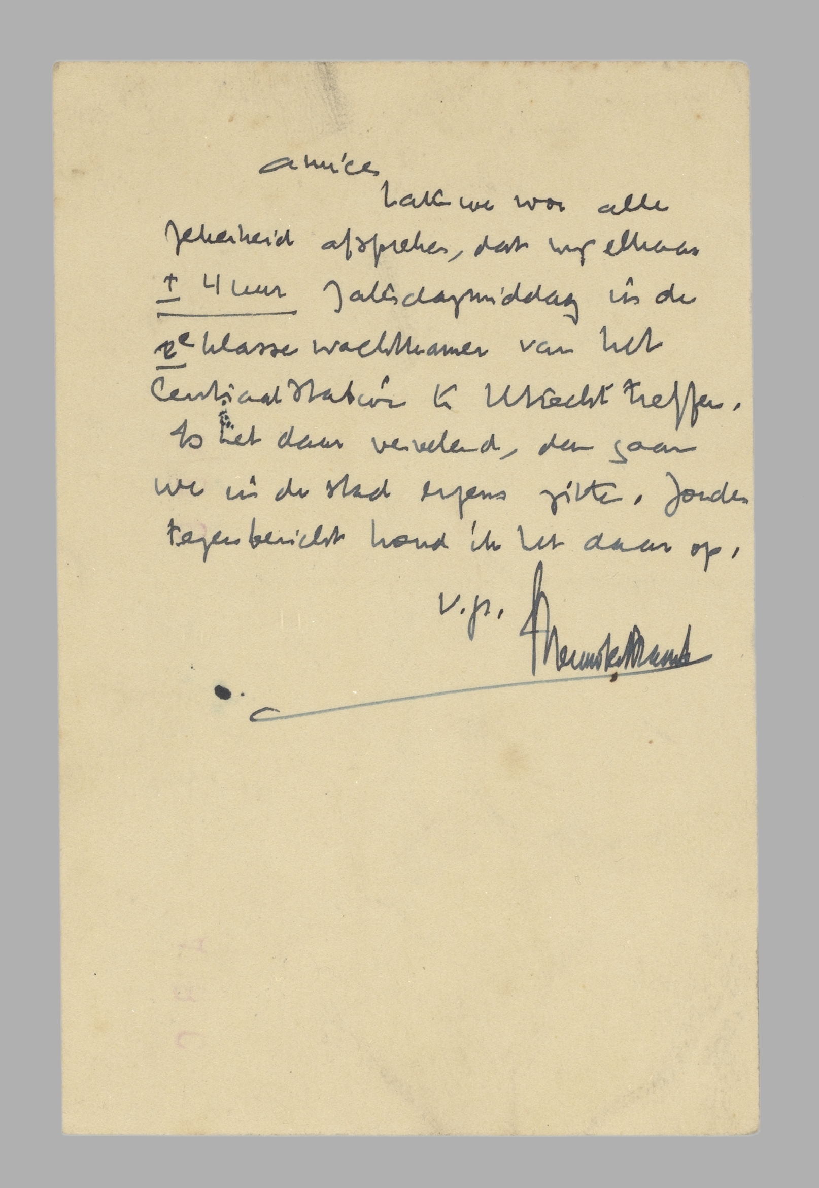 Laten we voor alle zekerheid afspreken, dat wij elkaar ± 4 uur Zaterdagmiddag in de 2e klasse wachtkamer van het Centraal Station te Utrecht treffen.