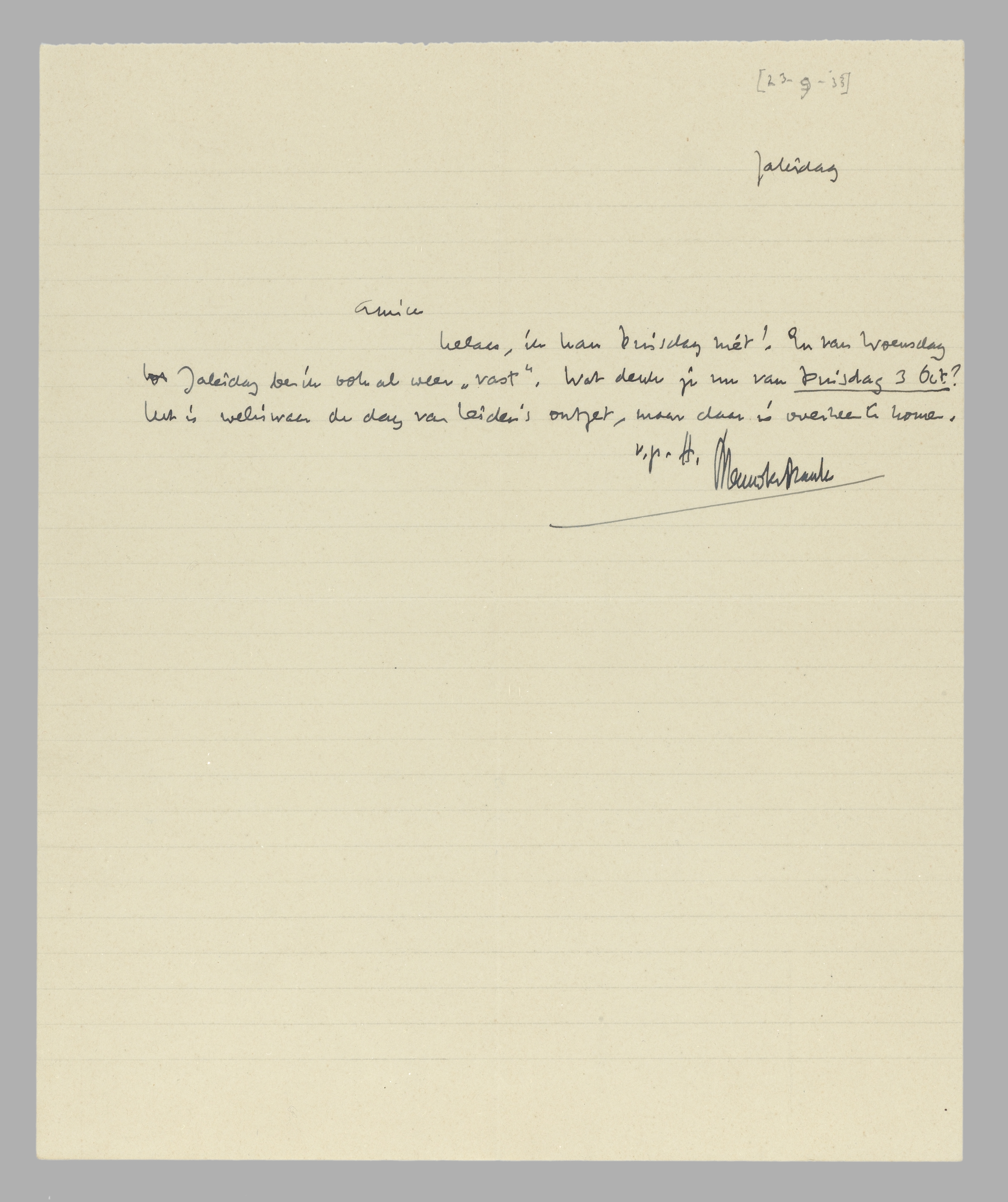 Helaas, ik kan Dinsdag niet! En van Woensdag tot Zaterdag ben ik ook al weer ‘vast’. Wat denk je nu van Dinsdag 3 Oct.? Het is weliswaar de dag van Leiden's ontzet, maar daar is overheen te komen.