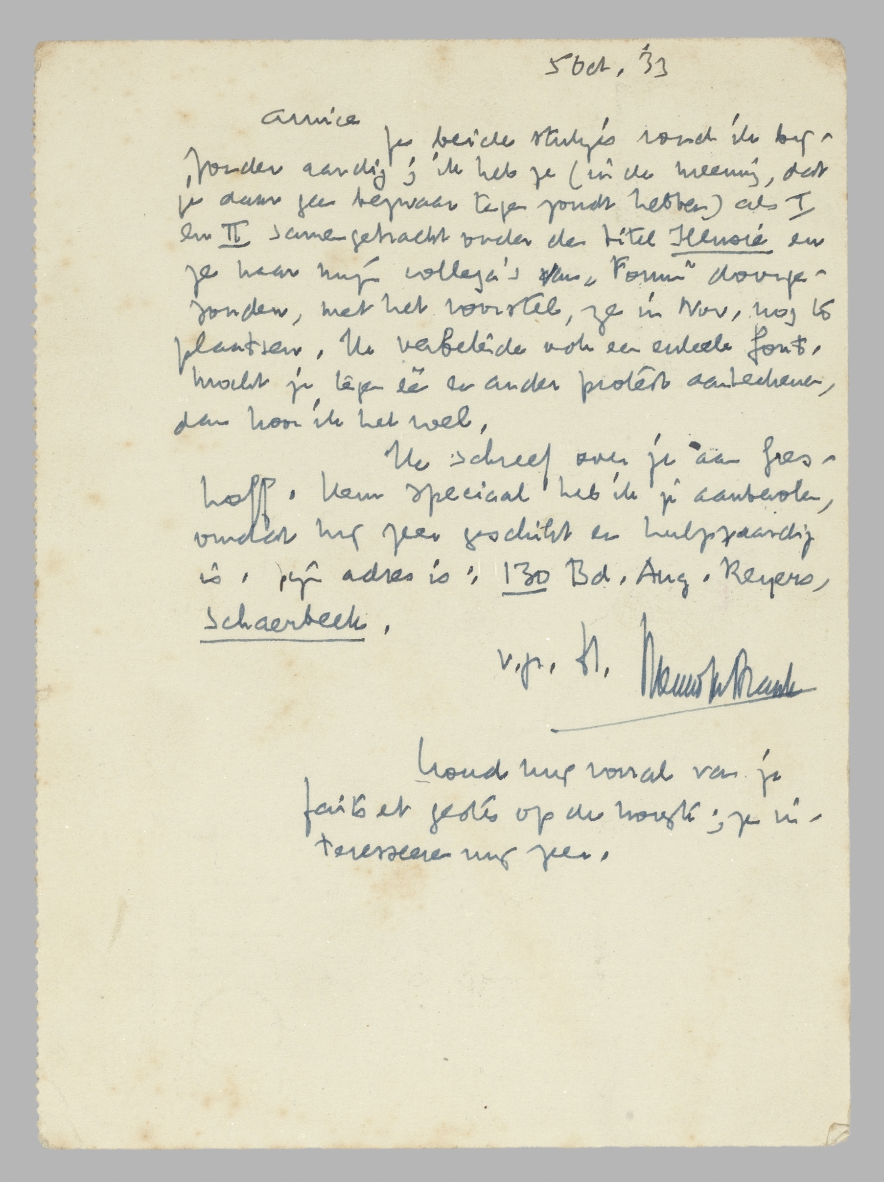 Ik schreef over je aan Greshoff, hem speciaal heb ik je aanbevolen, omdat hij zeer geschikt en hulpvaardig is, zijn adres is: 130 Bd. Aug. Reyers, Schaarbeek.