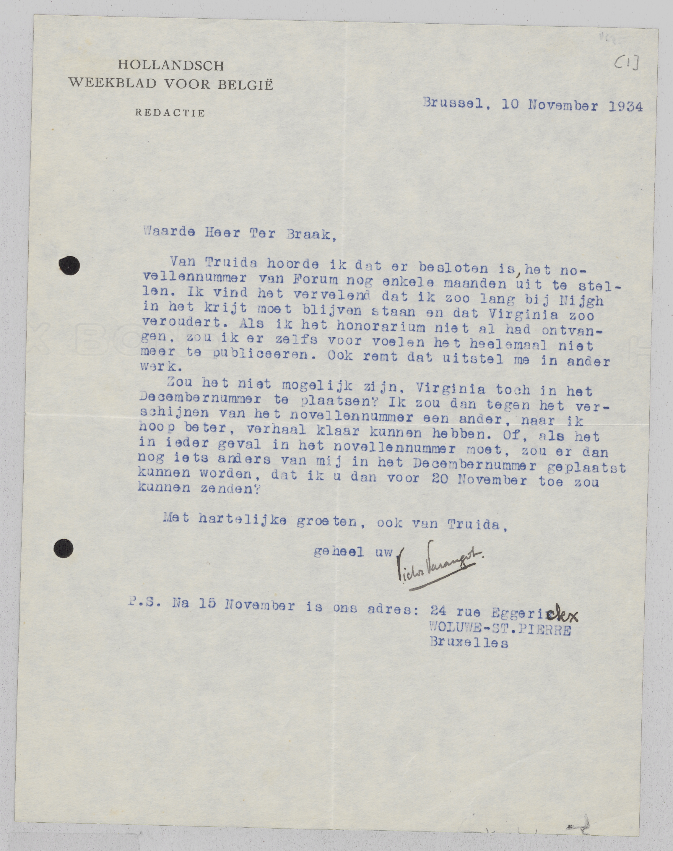 Zou het mogelijk zijn, Virginia toch in het Decembernummer op te nemen, dan schrijf ik nog wel een ander, beter hoop ik, verhaal tegen dat dat novellennummer werkelijk eens het licht zal zien. Of moet Virginia beslist daarin, dan zal ik er ook wel genoegen mee nemen, maar dan zou ik graag van u vernemen of er in het December-nummer nog voor iets anders plaats is van mijn hand, dat ik u dan voor 20 November toe zal zenden.