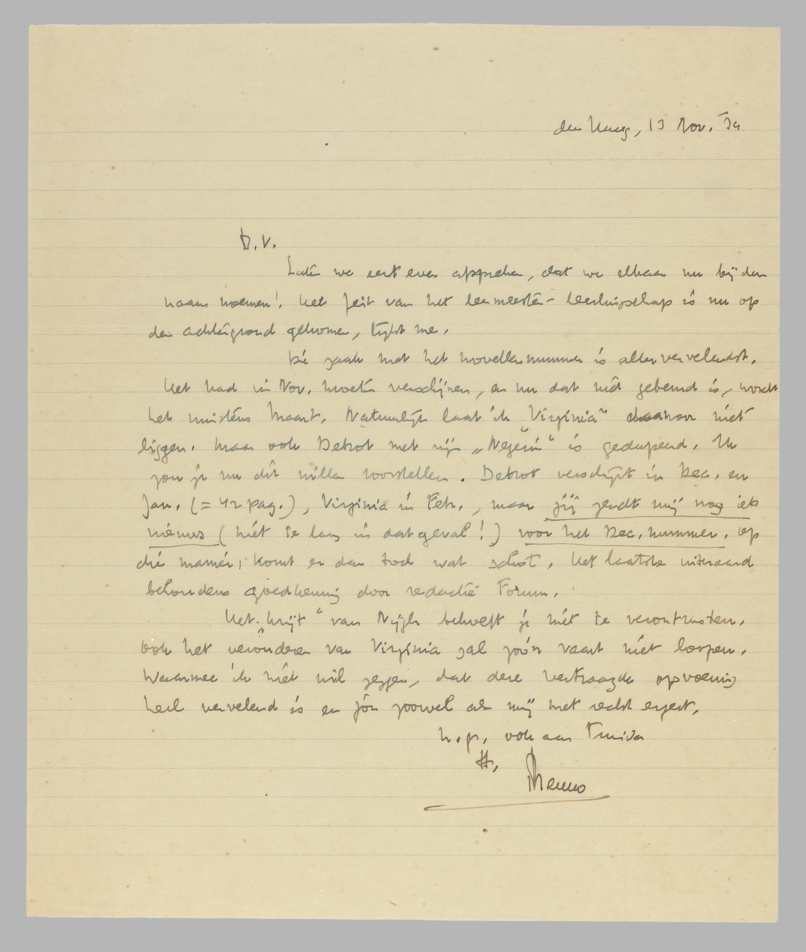 Die zaak met het novellennummer is allervervelendst. Het had in Nov. Moeten verschijnen, en nu dat niet gebeurd is, wordt het minstens Maart. Natuurlijk laat ik ‘Virginia’ nou niet liggen. Maar ook Debrot met zijn ‘Negerin’ is gedupeerd. Ik zou je nu dit willen voorstellen. Debrot verschijnt in Dec. en Jan. (= 42 pag.), Virginia in Febr, maar jij zendt mij nog iets nieuws (niet te lang in dat geval!) voor het Dec.nummer, op die manier komt er dan toch wat schot. Het laatste uiteraard behoudens goedkeuring door redactie Forum.