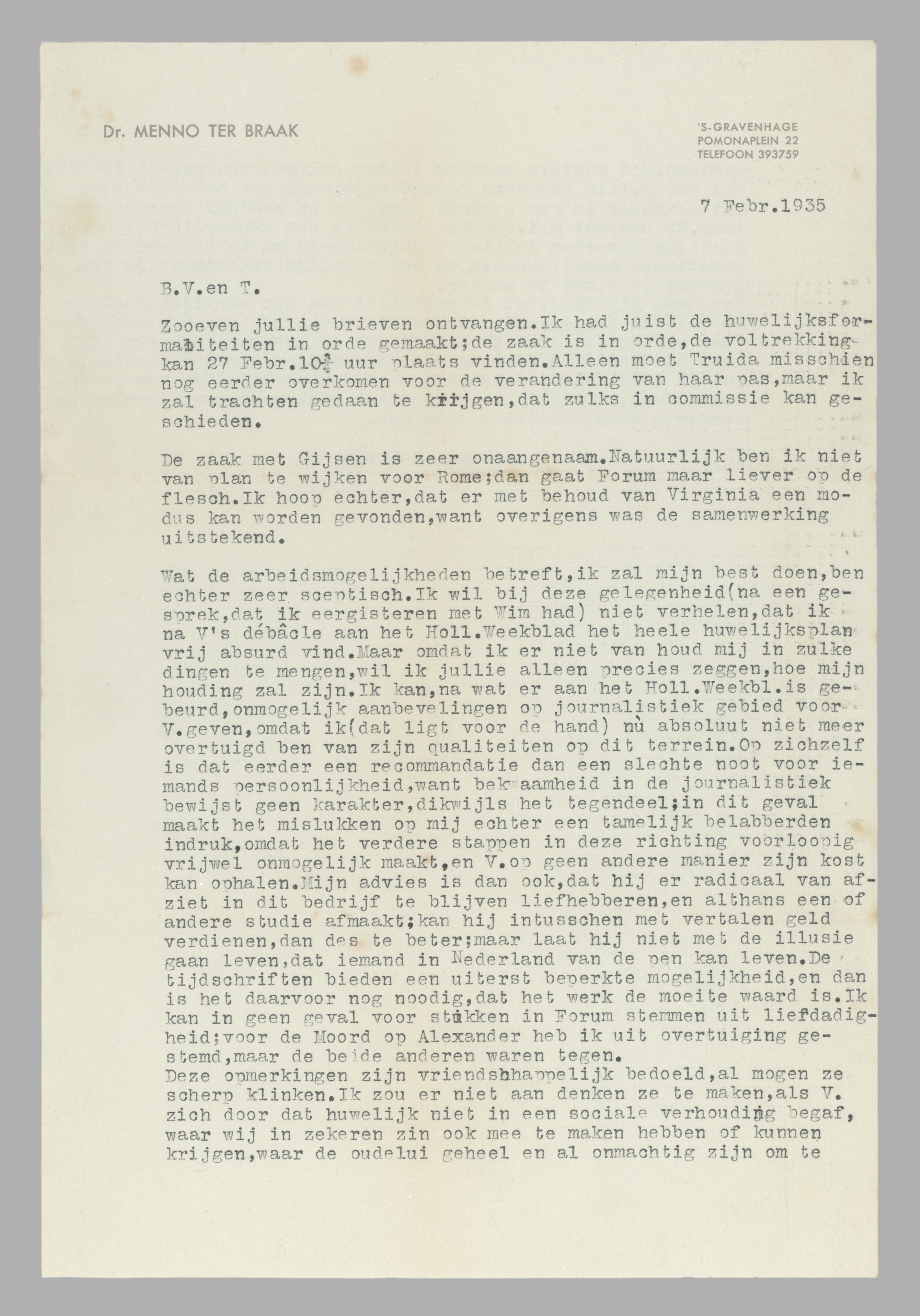 Wat de arbeidsmogelijkheden betreft, ik zal mijn best doen, ben echter zeer sceptisch. Ik wil bij deze gelegenheid (na een gesprek, dat ik eergisteren met Wim had) niet verhelen, dat ik na V's débâcle aan het Holl. Weekblad het heele huwelijksplan vrij absurd vind. Maar omdat ik er niet van houd mij in zulke dingen te mengen, wil ik jullie alleen precies zeggen, hoe mijn houding zal zijn. Ik kan, na wat er aan het Hol. Weekbl. is gebeurd onmogelijk aanbevelingen op journalistiek gebied voor V. geven, omdat ik (dat ligt voor de hand) nù absoluut niet meer overtuigd ben van zijn qualiteiten op dit terrein. Op zichzelf is dat eerder een recommandantie dan een slechte noot voor iemands persoonlijkheid, want bekwaamheid in de journalistiek bewijst geen karakter, dikwijls het tegendeel; in dit geval maakt het mislukken op mij echter een tamelijk belabberden indruk, omdat het verdere stappen in deze richting voorloopig vrijwel onmogelijk maakt, en V. op geen andere manier zijn kost kan ophalen. Mijn advies is dan ook, dat hij er radicaal van afziet in dit bedrijf te blijven liefhebberen, en althans een of andere studie afmaakt; kan hij intusschen met vertalen geld verdienen, dan des te beter; maar laat hij niet met de illusie gaan leven, dat iemand in Nederland van de pen kan leven. De tijdschriften bieden een uiterst beperkte mogelijkheid, en dan is het daarvoor nog noodig, dat het werk de moeite waard is. Ik kan in geen geval voor stukken in Forum stemmen uit liefdadigheid; voor de Moord op Alexander heb ik uit overtuiging gestemd, maar de beide anderen waren tegen.
