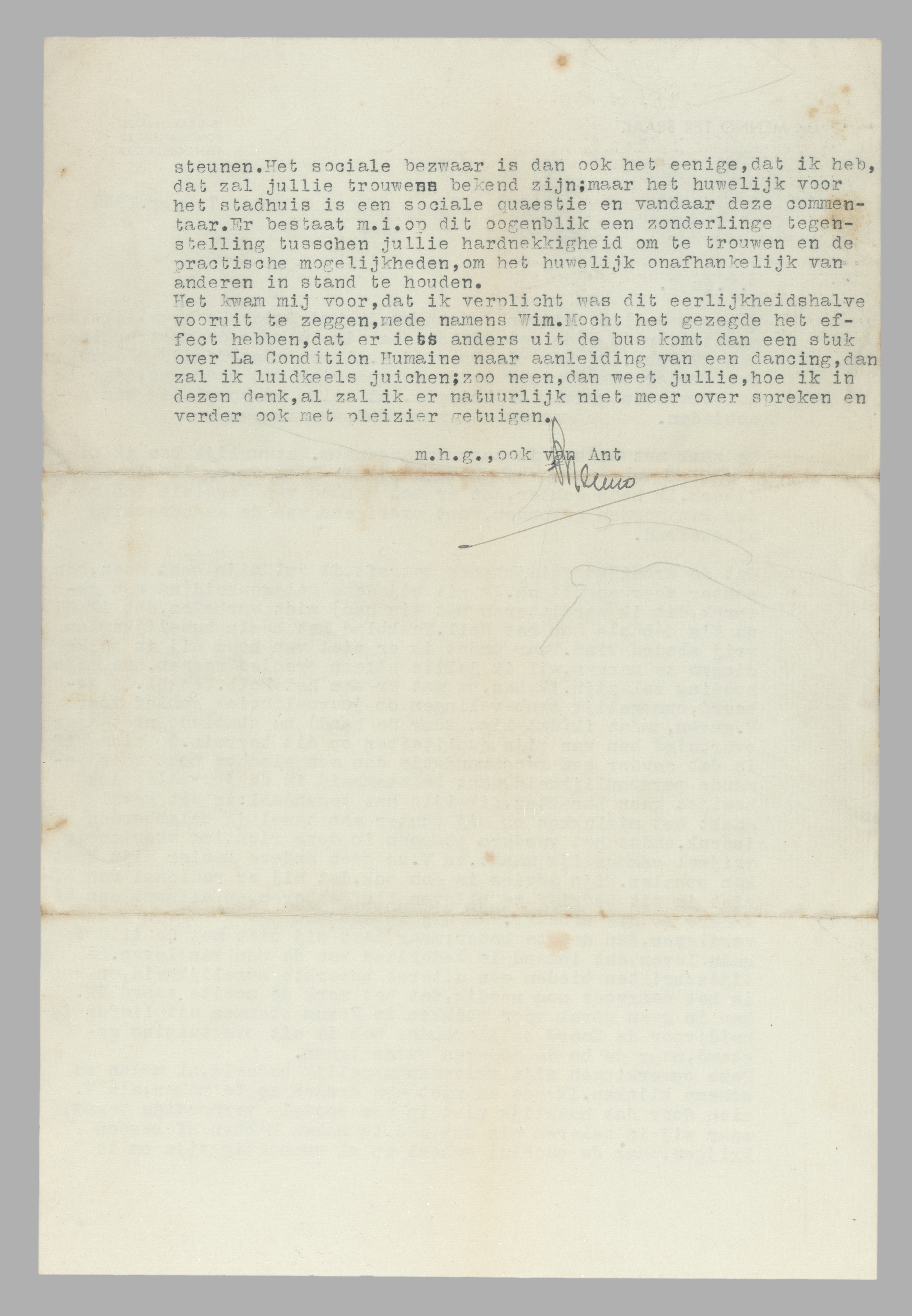 Het kwam mij voor, dat ik verplicht was dit eerlijkheidshalve vooruit te zeggen, mede namens Wim. Mocht het gezegde het effect hebben dat er iets anders uit de bus komt dan een stuk over La Condition Humaine naar aanleiding van een dancing, dan zal ik luidkeels juichen; zoo neen, dan weet jullie, hoe ik in dezen denk, al zal ik er natuurlijk niet meer over spreken en verder ook met pleizier getuigen.
