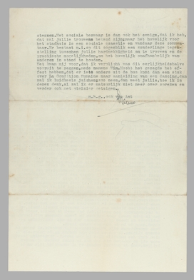 Deze opmerkingen zijn vriendschappelijk bedoeld, al mogen ze scherp klinken. Ik zou er niet aan denken ze te maken, als V. zich door dat huwelijk niet in een sociale verhouding begaf, waar wij in zekeren zin ook mee te maken hebben of kunnen krijgen, waar de oudelui geheel en al onmachtig zijn om te steunen. Het sociale bezwaar is dan ook het eenige, dat ik heb, dat zal jullie trouwens bekend zijn; maar het huwelijk voor het stadhuis is een sociale quaestie en vandaar deze commentaar. Er bestaat m.i. op dit oogenblik een zonderlinge tegenstelling tusschen jullie hardnekkigheid om te trouwen en de practische mogelijkheden, om het huwelijk onafhankelijk van anderen in stand te houden.