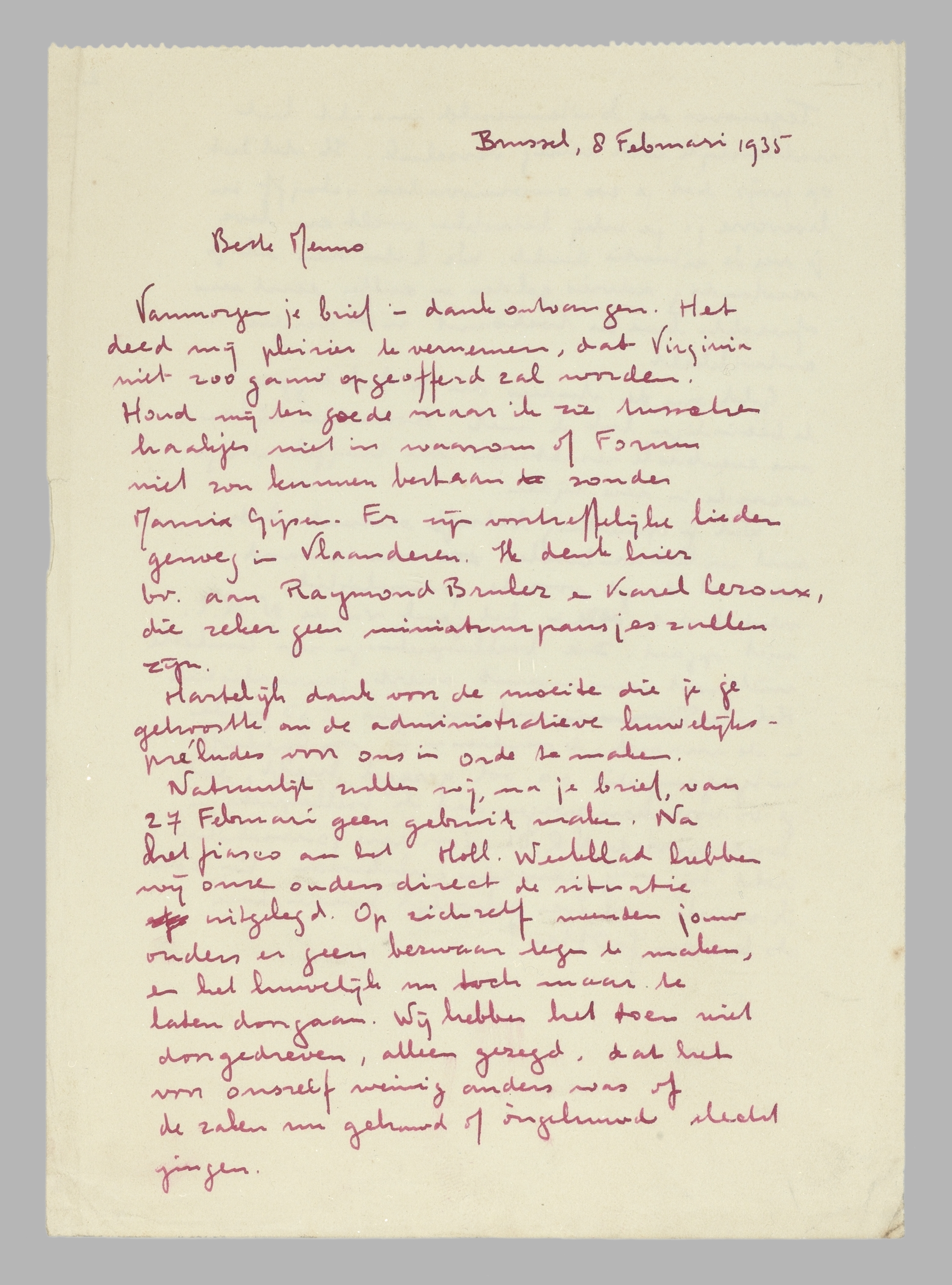 Vanmorgen je brief in dank ontvangen. Het deed mij pleizier te vernemen, dat Virginia niet zoo gauw opgeofferd zal worden. Houd mij ten goede maar ik zie tusschen haakjes niet in waarom of Forum niet zou kunnen bestaan zonder Marnix Gijsen. Er zijn voortreffelijke lieden genoeg in Vlaanderen. Ik denk hier bv. aan Raymond Brulez en Karel Leroux, die zeker geen miniatuurpausjes zullen zijn.