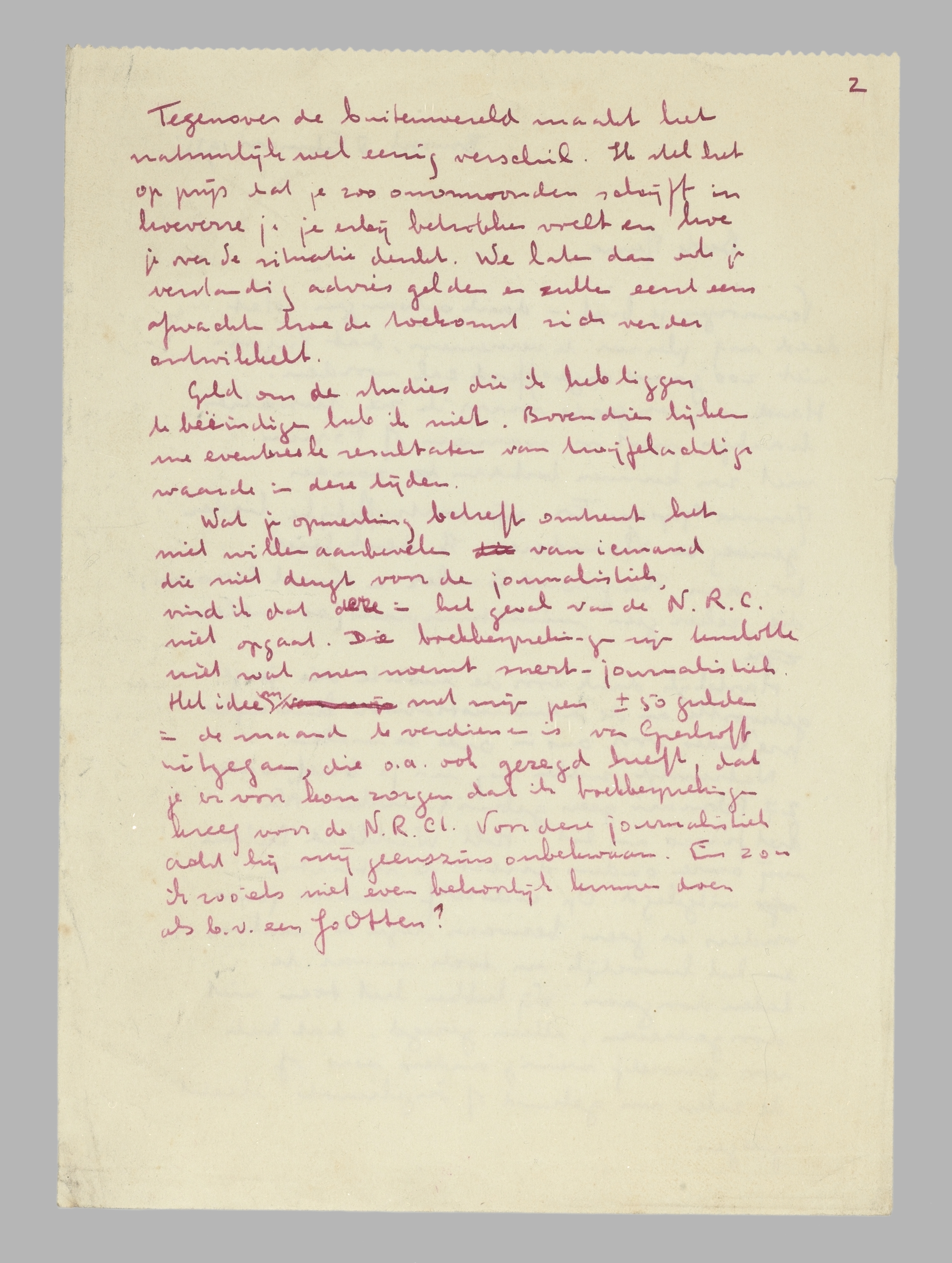 Die boekbesprekingen zijn tenslotte niet wat je noemt snert journalistiek. Het idee om met mijn pen ± 50 gulden in de maand te verdienen is van Greshoff uitgegaan, die o.a. ook gezegd heeft, dat je er voor kon zorgen dat ik boekbesprekingen kreeg voor de N.R.C. Voor deze journalistiek acht hij mij geenszins onbekwaam. En zou ik zooiets niet even behoorlijk kunnen doen als b.v. een Jo Otten?