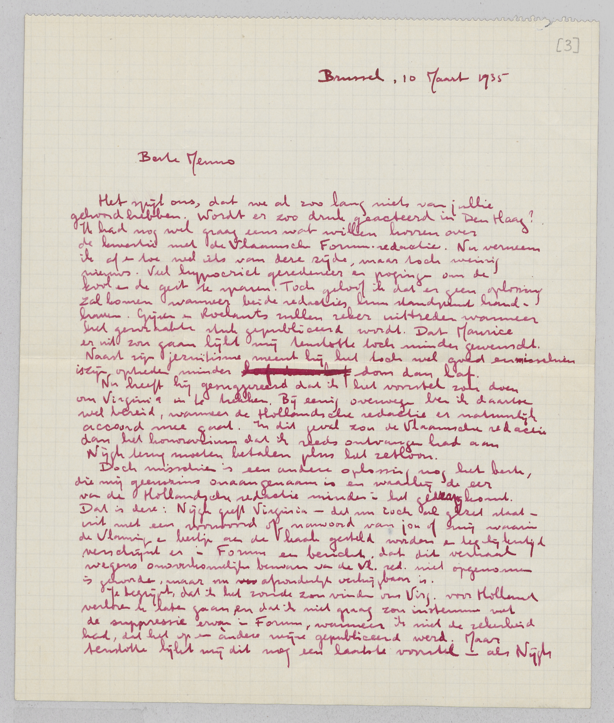 Doch misschien is een andere oplossing nog het beste, die mij geenszins onaangenaam is en waarbij de eer van Hollandsche redactie minder in het gedrang komt. Dat is deze: Nijgh geeft Virginia - dat nu toch al gezet staat - uit met een voorwoord of nawoord van jou of mij waarin de Vlamingen een beetje aan de kaak gesteld worden en tegelijkertijd verschijnt er in Forum een bericht, dat dit verhaal wegens onoverkomelijk bezwaar van de Vl. Red. niet opgenomen is geworden, maar nu afzonderlijk verkrijgbaar is.