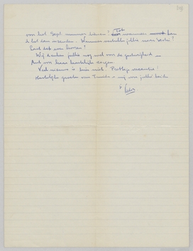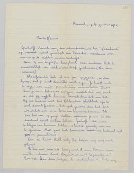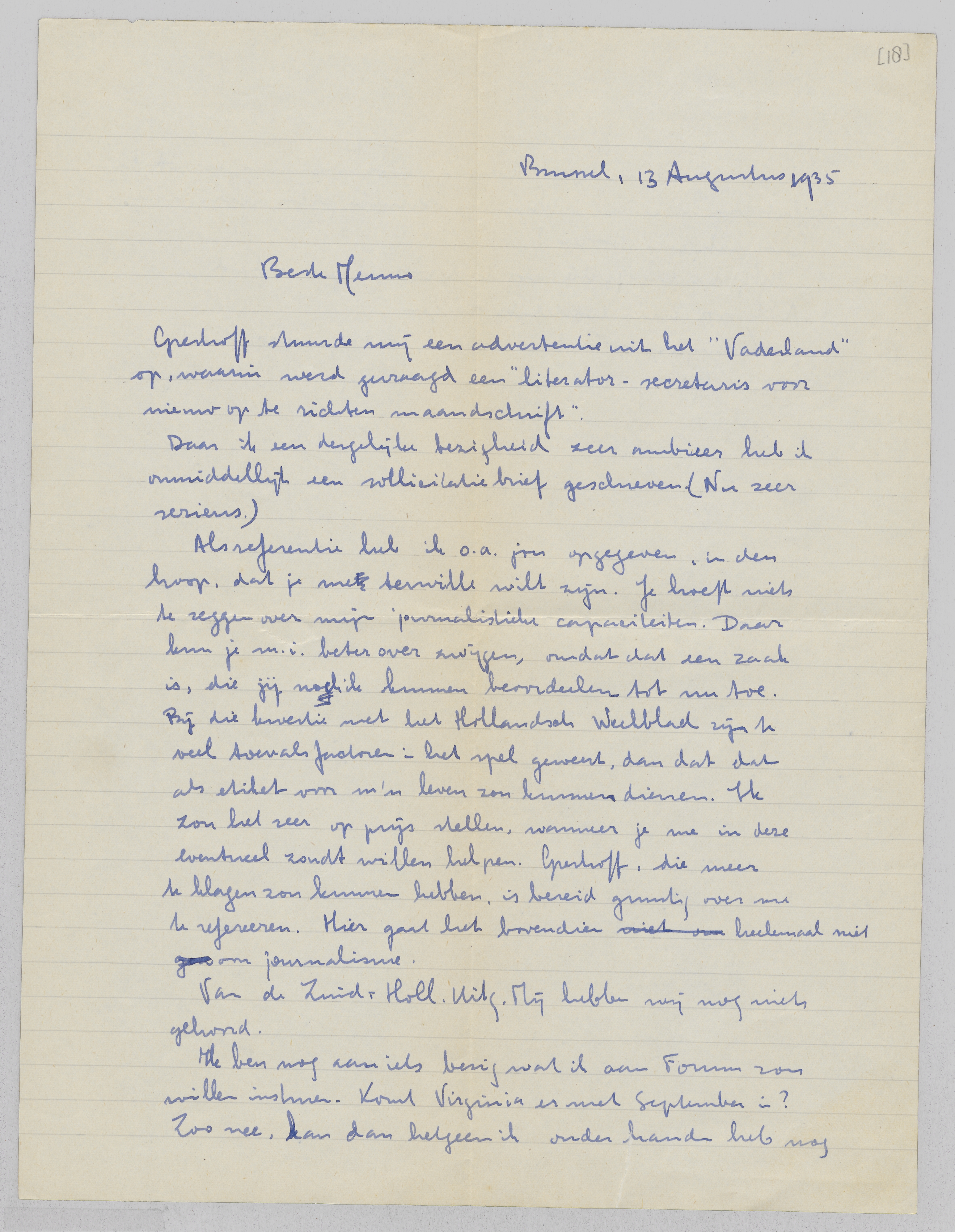 Als referentie heb ik o.a. jou opgegeven, in den hoop, dat je me terwille wilt zijn. Je hoeft niets te zeggen over mijn journalistieke capaciteiten. Daar kun je m.i. beter over zwijgen, omdat het een zaak is, die jij noch ik kunnen beoordeelen tot nu toe. Bij die kwestie met het Hollandsch Weekblad zijn te veel toevalsfactoren in het spel geweest, dan dat dat als etiket voor m'n leven zou kunnen dienen. Ik zou het zeer op prijs stellen, wanneer je me in deze eventueel zoudt willen helpen. Greshoff, die meer te klagen zou kunnen hebben, is bereid gunstig over me te refereeren. Hier gaat het bovendien heelemaal niet om journalisme.