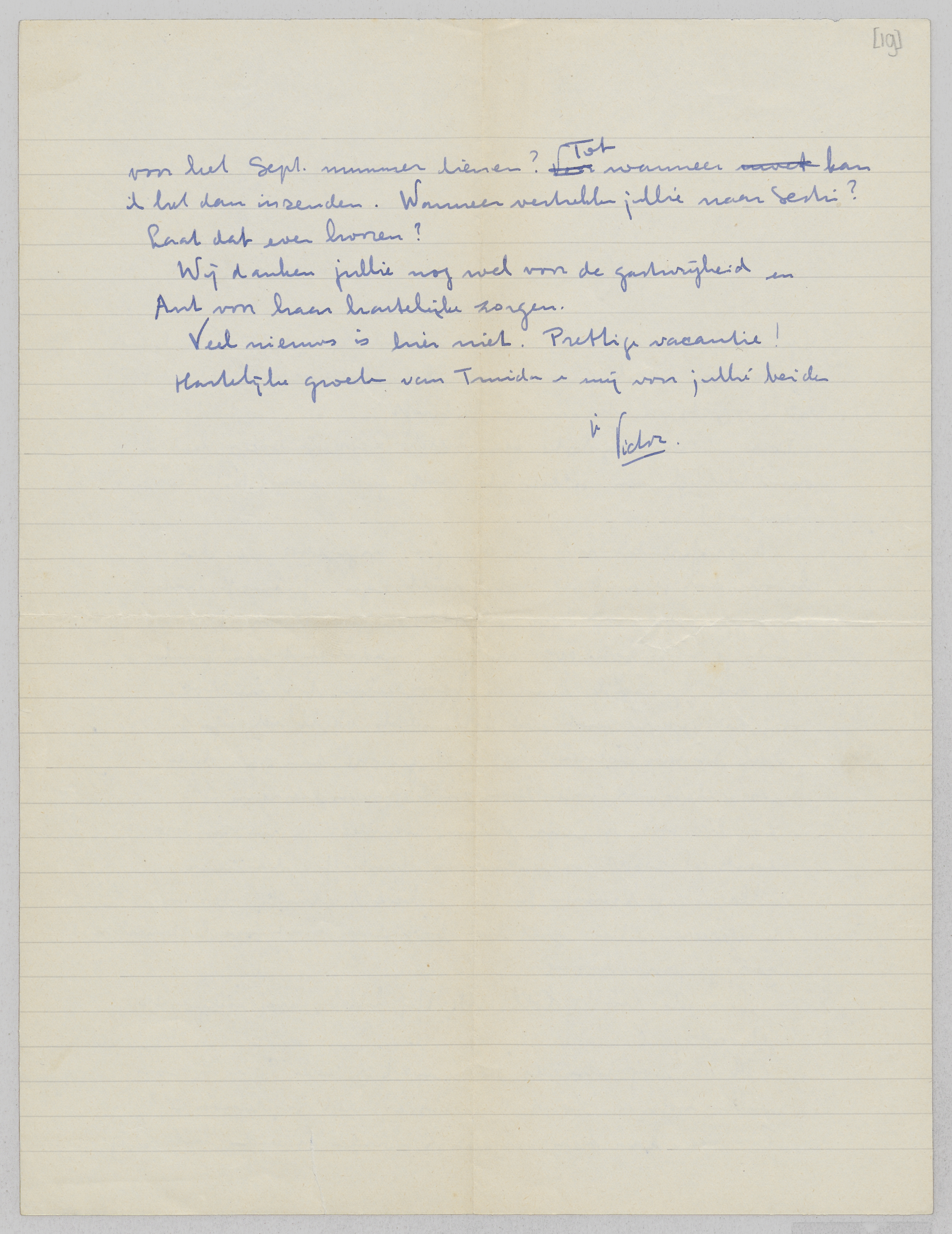 Ik ben nog aan iets bezig wat ik aan Forum zou willen insturen. Komt Virginia er met September in? Zoo nee, kan dan hetgeen ik onder handen heb nog voor het Sept. nummer dienen? Tot wanneer kan ik het dan inzenden? Wanneer vertrekken jullie naar Sestri? Laat dat even hooren?