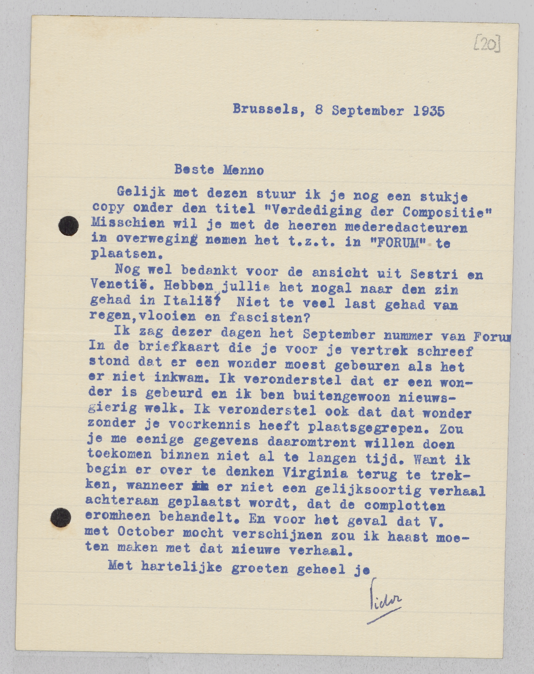 Gelijk met dezen stuur ik je nog een stukje copy onder den titel ‘Verdediging der Compositie’. Misschien wil je met den heeren mederedacteuren in overweging nemen het t.z.t. in ‘Forum’ te plaatsen.