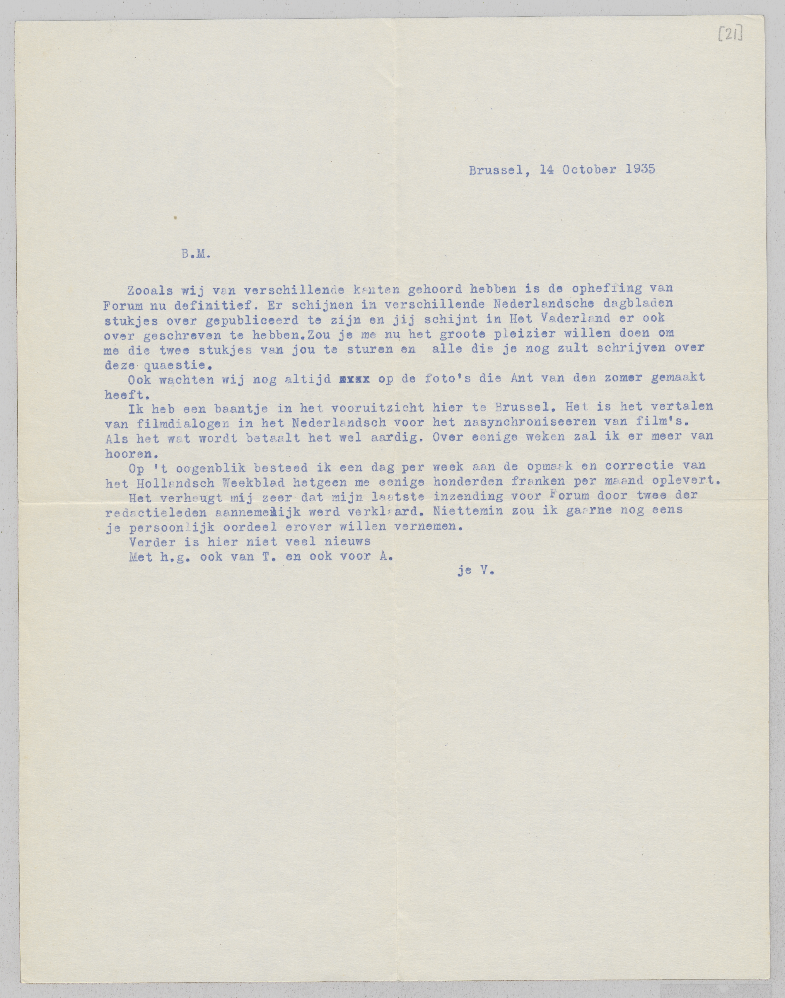 Ik heb een baantje in het vooruitzicht hier te Brussel. Het is het vertalen van filmdialogen in het Nederlandsch voor het nasynchroniseeren van film's. Als het wat wordt betaalt het wel aardig. Over eenige weken zal ik er meer van hooren.
