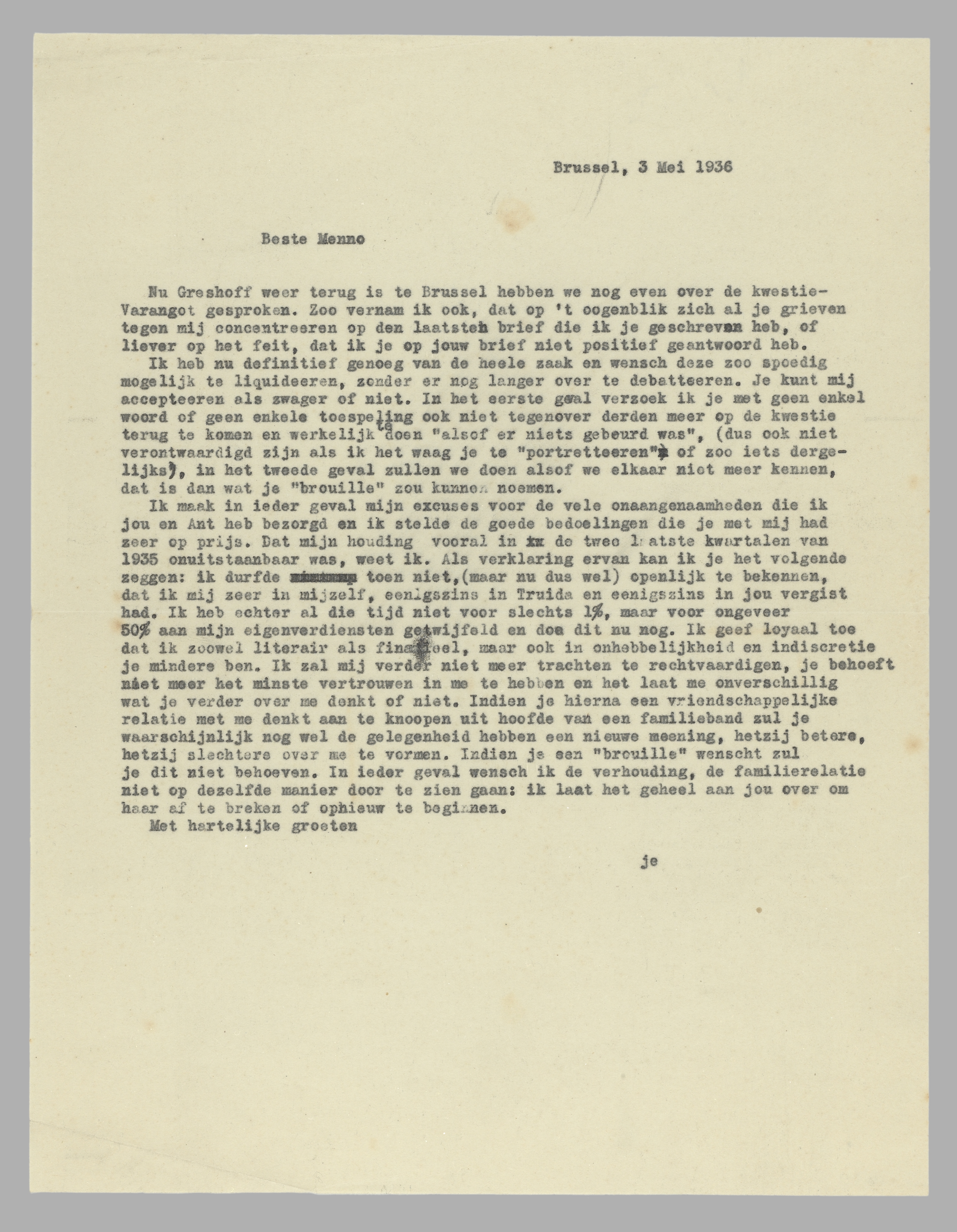 Ik maak in ieder geval mijn excuses voor de vele onaangenaamheden die ik jou en Ant heb bezorgd en ik stelde de goede bedoelingen die je met mij had zeer op prijs. Dat mijn houding vooral in de twee laatste kwartalen van 1935 onuitstaanbaar was, weet ik. Als verklaring ervan kan ik je het volgende zeggen: ik durfde toen niet, (maar nu dus wel) openlijk te bekennen, dat ik mij zeer in mijzelf, eenigszins in Truida en eenigszins in jou vergist had. Ik heb echter al die tijd niet voor slechts 1%, maar voor ongeveer 50% aan mijn eigen verdiensten getwijfeld en doe dit nu nog. Ik geef loyaal toe dat ik zoowel literair als financieel, maar ook in onhebbelijkheid en indiscretie je mindere ben. Ik zal mij verder niet trachten te rechtvaardigen, je behoeft niet meer het minste vertouwen in me te hebben en het laat me onverschillig wat je verder over me denkt of niet. Indien je hierna een vriendschappelijke relatie met me denkt aan te knoopen uit hoofde van een familieband zul je waarschijnlijk nog wel de gelegenheid hebben een nieuwe meening, hetzij betere, hetzij slechtere over me te vormen. Indien je een ‘brouille’ wenscht zul je dit niet behoeven. In ieder geval wensch ik de verhouding, de familierelatie niet op dezelfde manier door te zien gaan: ik laat het geheel aan jou over om haar af te breken of opnieuw te beginnen.