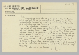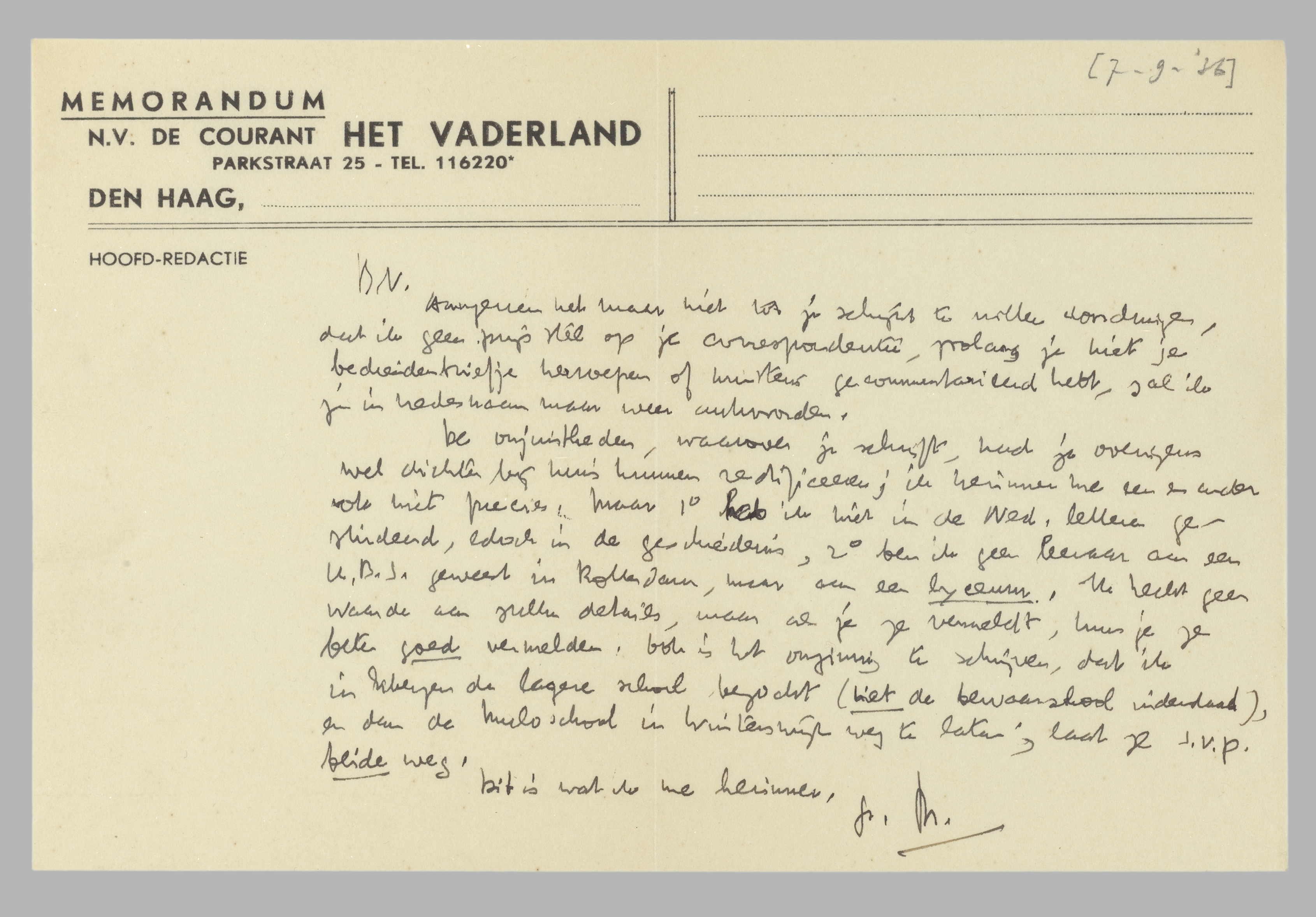 De onjuistheden, waarover je schrijft, had je overigens wel dichter bij huis kunnen rectificeeren; ik herinner me een en ander ook niet precies, maar 1o heb ik niet in de Ned. letteren gestudeerd, edoch in de geschiedenis, 2o ben ik geen leraar aan een H.B.S. geweest in Rotterdam, maar aan een lyceum. Ik hecht geen waarde aan zulke details, maar als je ze vermeldt, kun je ze beter goed vermelden. Ook is het onzinnig te schrijven, dat ik in Eibergen de lagere school bezocht (niet de bewaarschool inderdaad), en dan de Muloschool in Winterswijk weg te laten; laat ze s.v.p. beide weg.