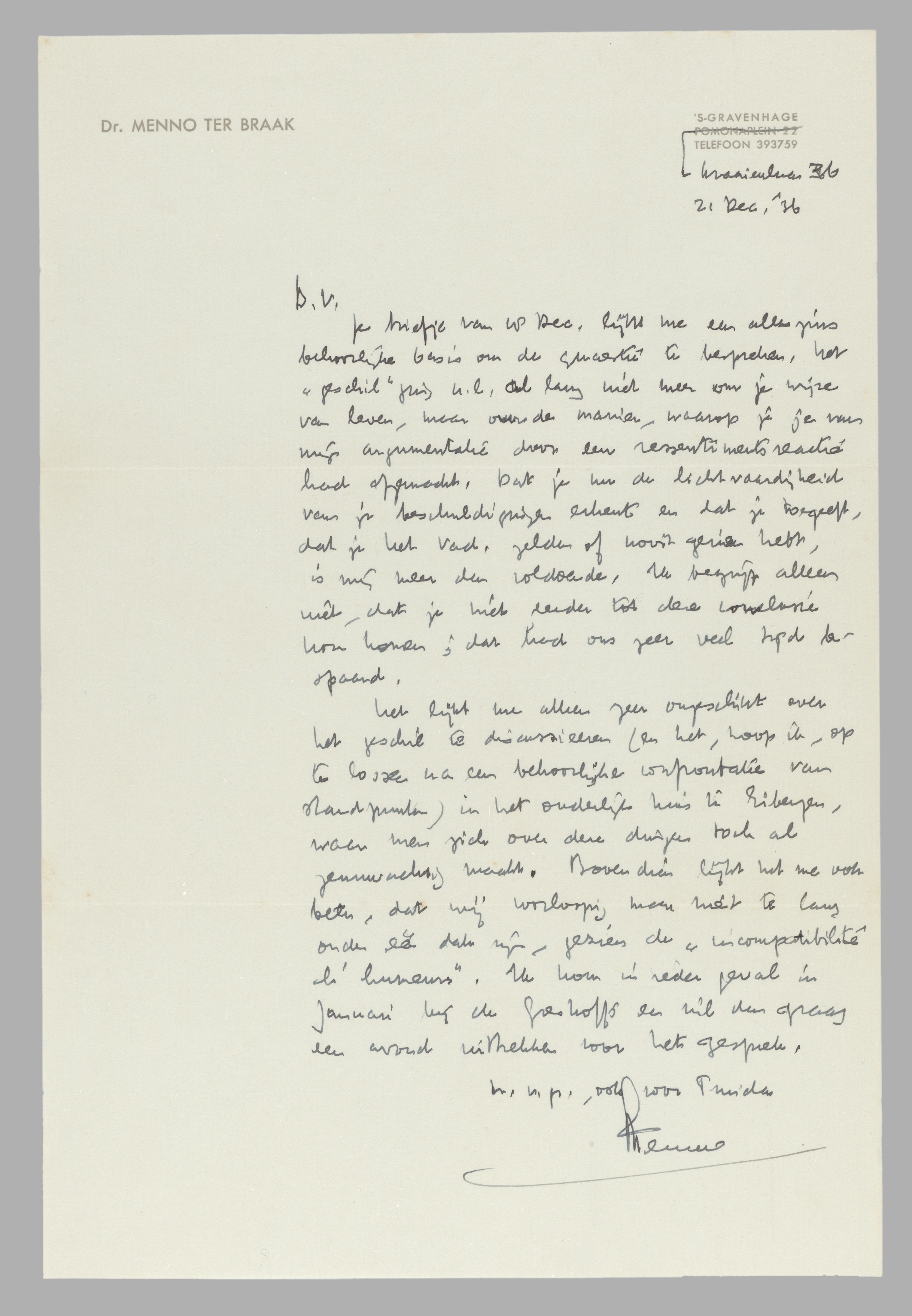 Je briefje van 18 Dec. lijkt me een alleszins behoorlijke basis om de questie te bespreken. Het ‘geschil’ ging n.l. al lang niet meer om je wijze van leven, maar over de manier, waarop je je van mijn argumentatie door een ressentiementsreactie had afgemaakt. Dat je nu de lichtvaardigheid van je beschuldigingen erkent en dat je toegeeft, dat je het vaak, zelden of nooit gezien hebt, is mij meer dan voldoende. Ik begrijp alleen niet, dat je niet eerder tot deze conclusie kon komen; dat had ons zeer veel tijd bespaard.
