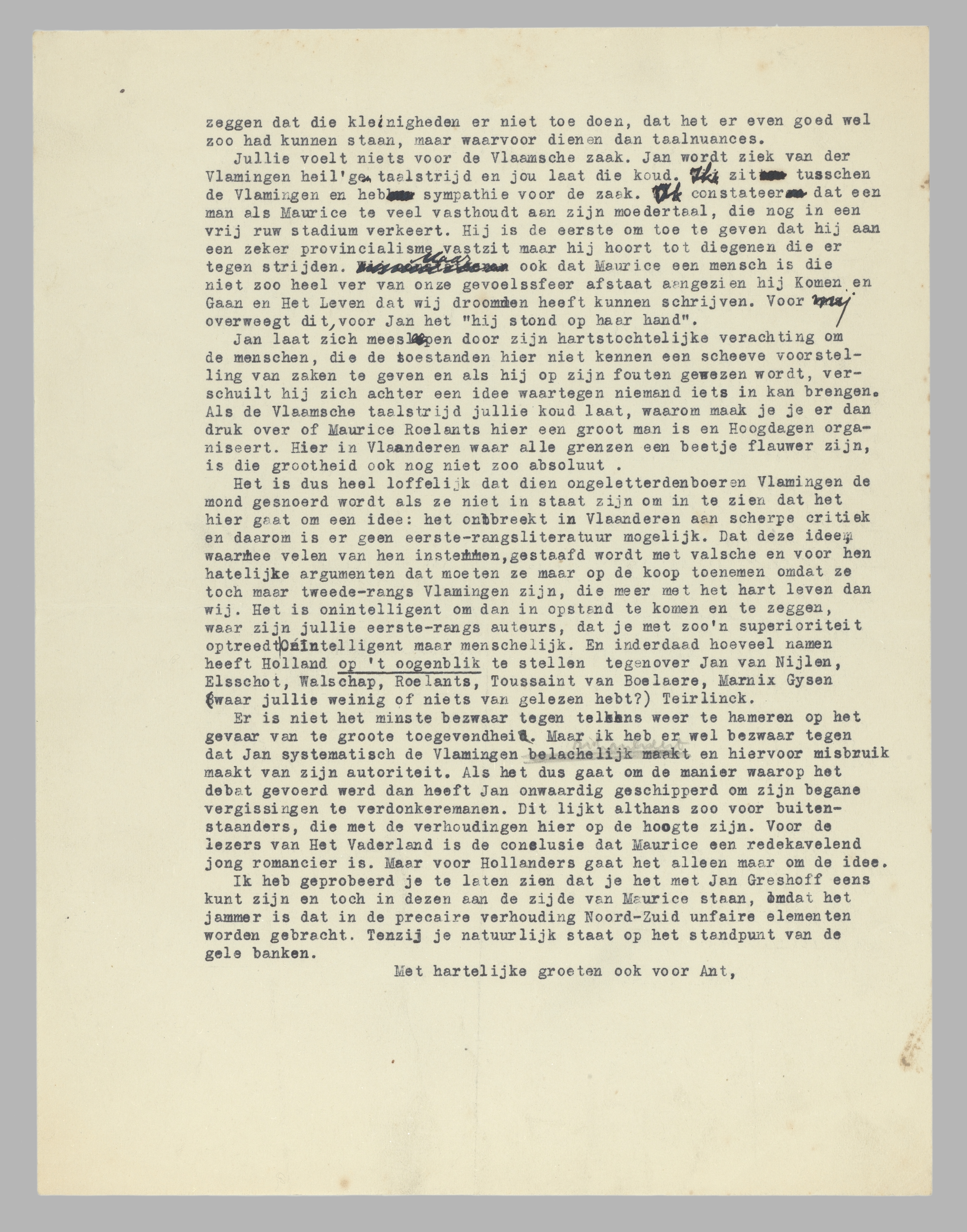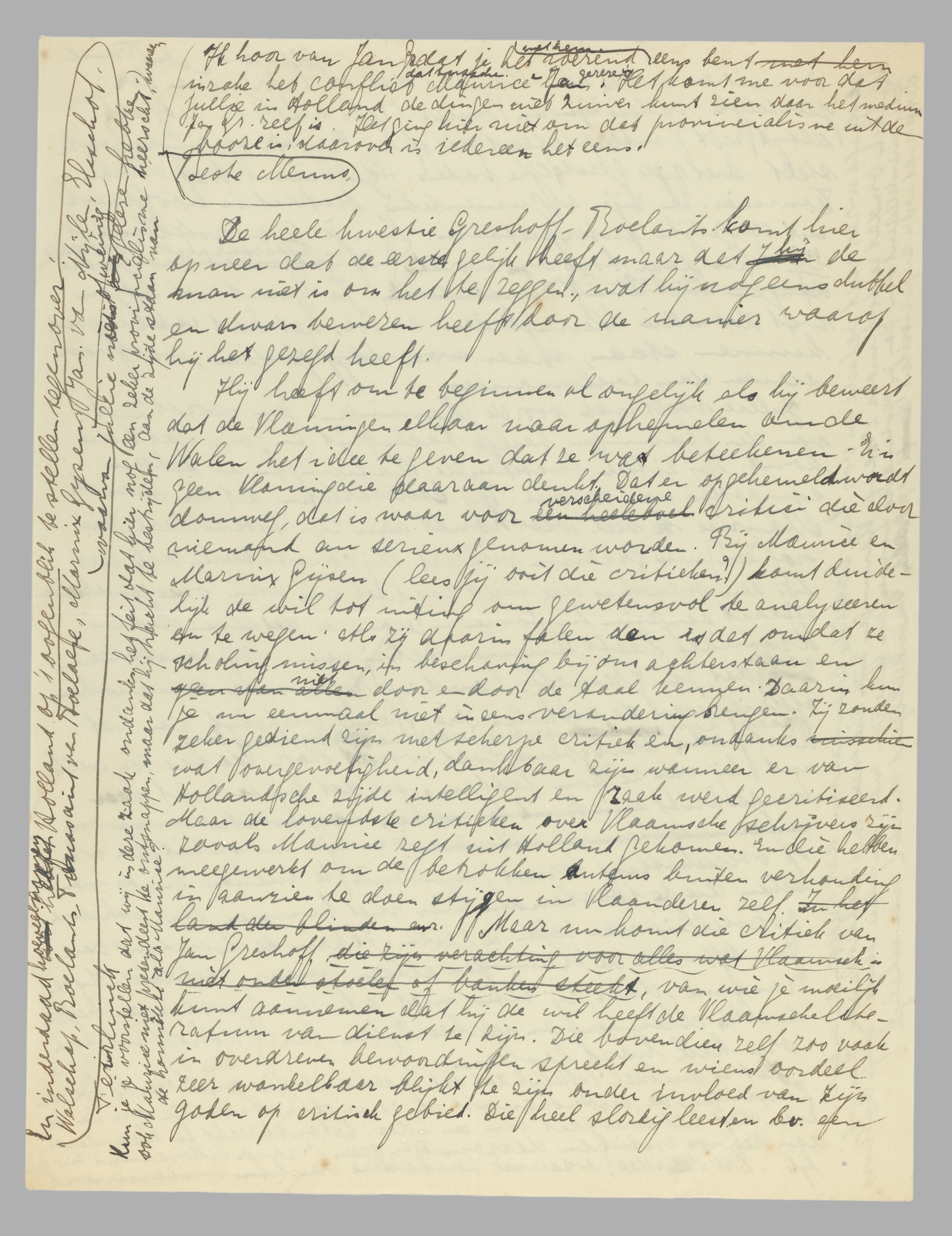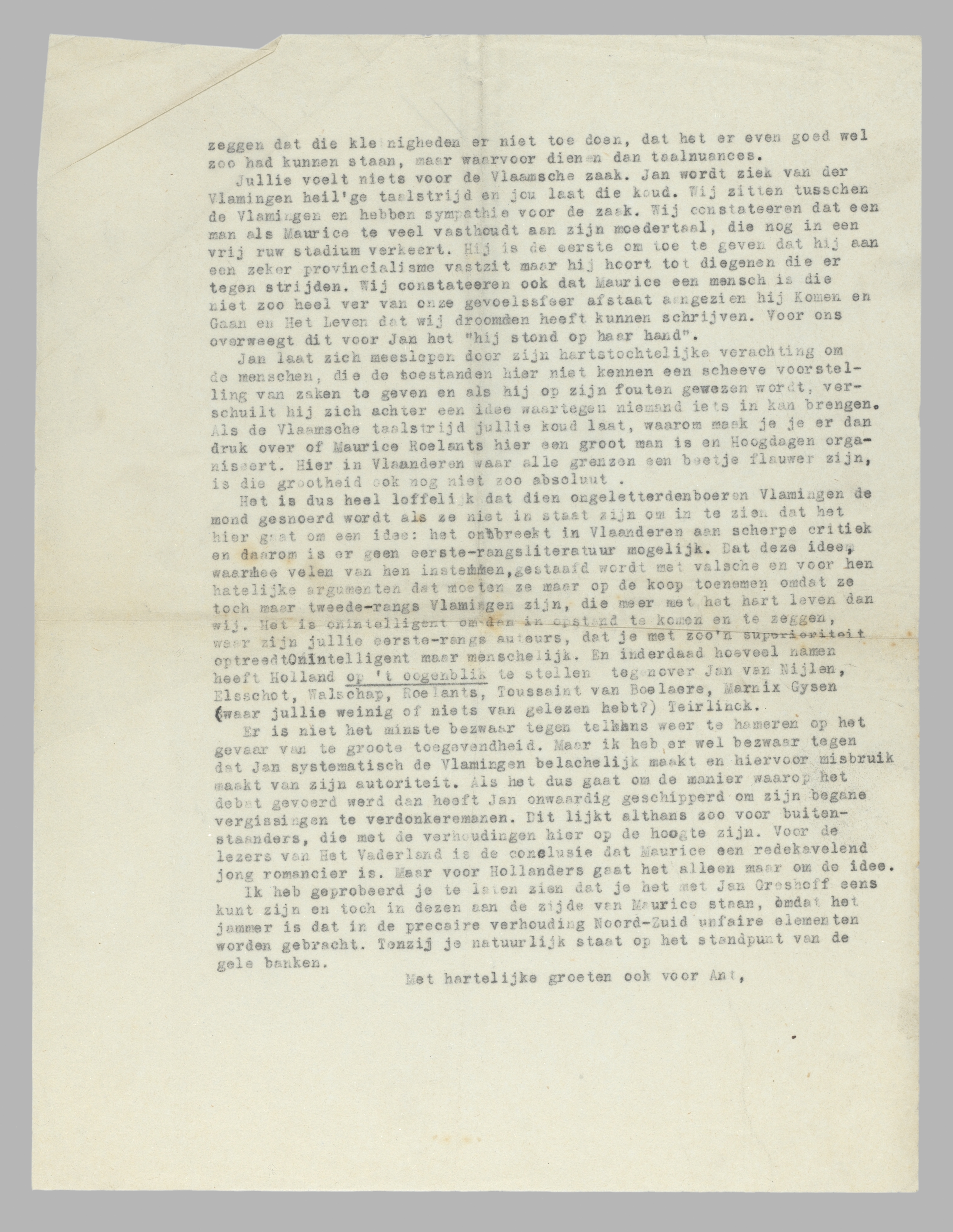Ik hoor van Jan Greshoff dat je het roerend met hem eens bent inzake het conflict dat tusschen Jan en Maurice gerezen is. Als het gaat om het hier heerschend provincialisme aan te klagen dan is dat alleszins toe te juichen en dan zijn verscheidene Vlamingen, waaronder Maurice, zeker bereid om Jan volmondig gelijk te geven. Maar aan dit debat zitten kanten, die in Holland heelemaal niet aan het licht komen en waardoor het geval op een heel ander plan komt en voor discussie in Het Vaderland ongeschikt wordt.
