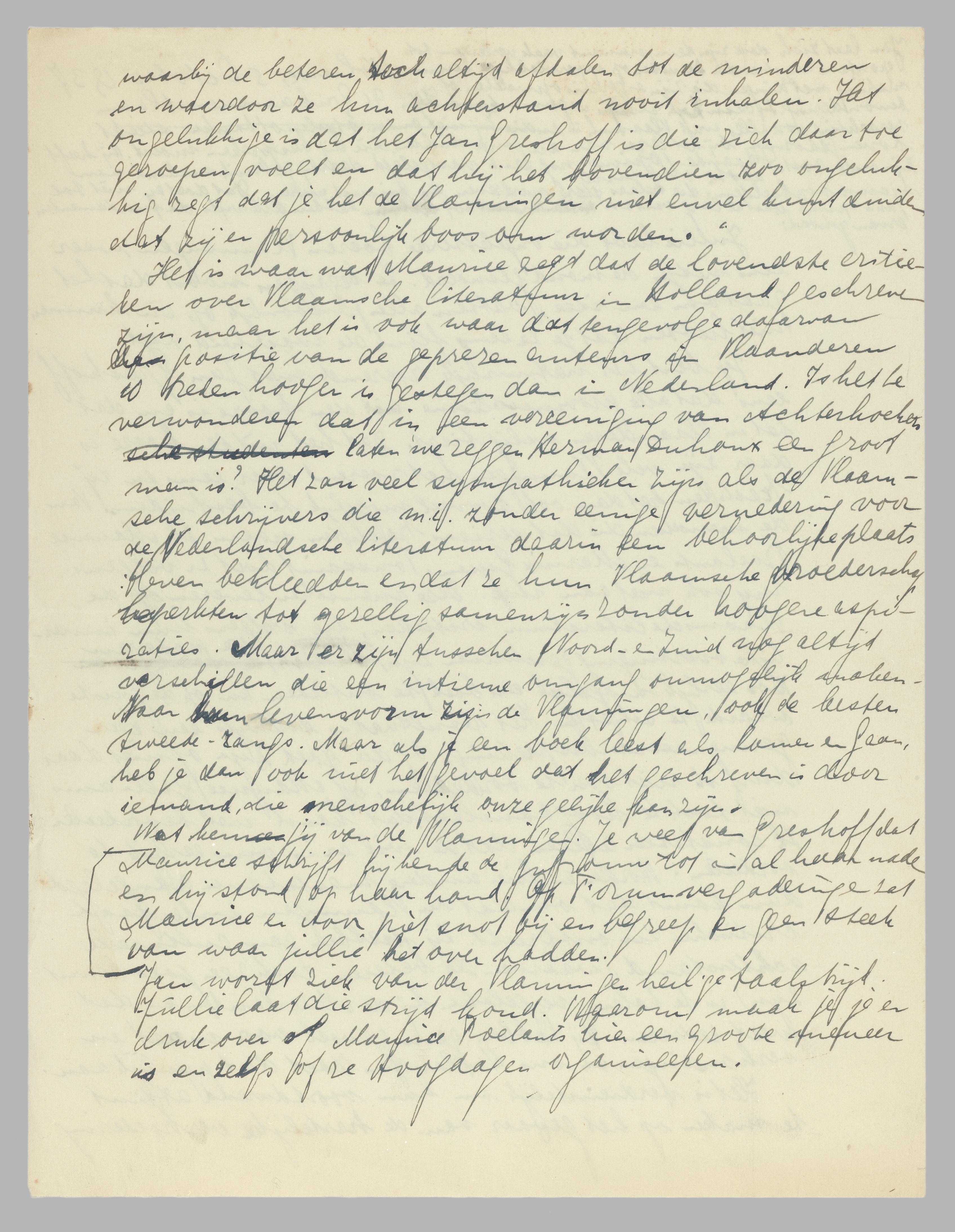 Jullie voelt niets voor de Vlaamsche zaak. Jan wordt ziek van der Vlamingen heil'gen taalstrijd en jou laat die koud. Ik zit tusschen de Vlamingen en heb sympathie voor de zaak. Ik constateer dat een man als Maurice te veel vasthoudt aan zijn moedertaal, die nog in een vrij ruw stadium verkeert. Hij is de eerste om toe te geven dat hij aan een zeker provincialisme vastzit maar hij hoort tot diegenen die er tegen strijden. [Maar ik constateer] ook dat Maurice een mensch is die niet zo heel ver van onze gevoelssfeer afstaat aangezien hij Komen en Gaan en Het Leven dat wij droomden heeft kunnen schrijven. Voor [ons] overweegt dit voor Jan het ‘hij stond op haar hand’.