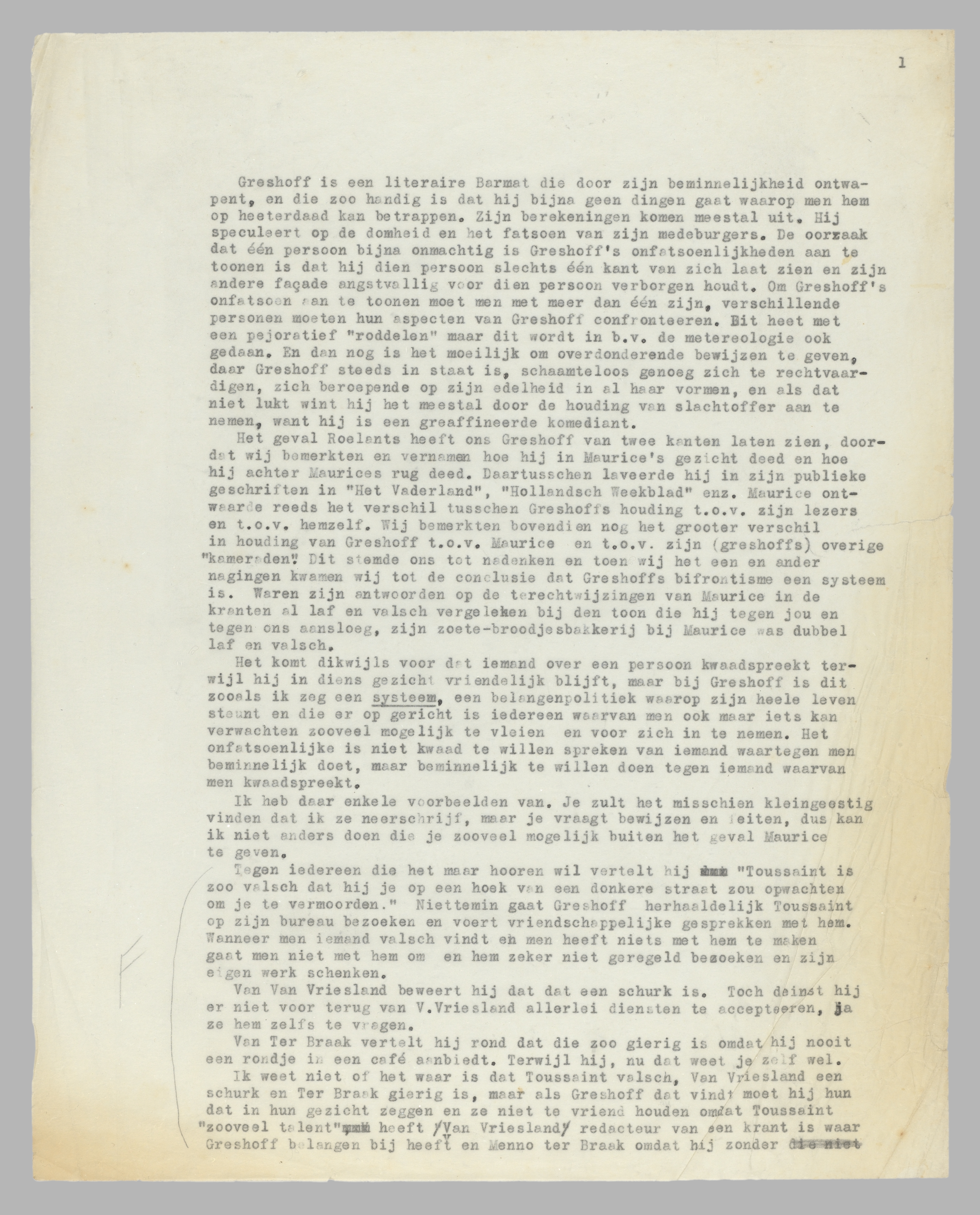 Het komt dikwijls voor dat iemand over een persoon kwaadspreekt terwijl hij in diens gezicht vriendelijk blijft, maar bij Greshoff is dit zooals ik zeg een systeem, een belangenpolitiek waarop zijn heele leven steunt en die er op gericht is iedereen waarvan men ook maar iets kan verwachten zooveel mogelijk te vleien en voor zich in te nemen. Het onfatsoenlijke is niet kwaad te willen spreken van iemand waartegen men beminnelijk doet, maar beminnelijk te willen doen tegen iemand waarvan men kwaad spreekt.