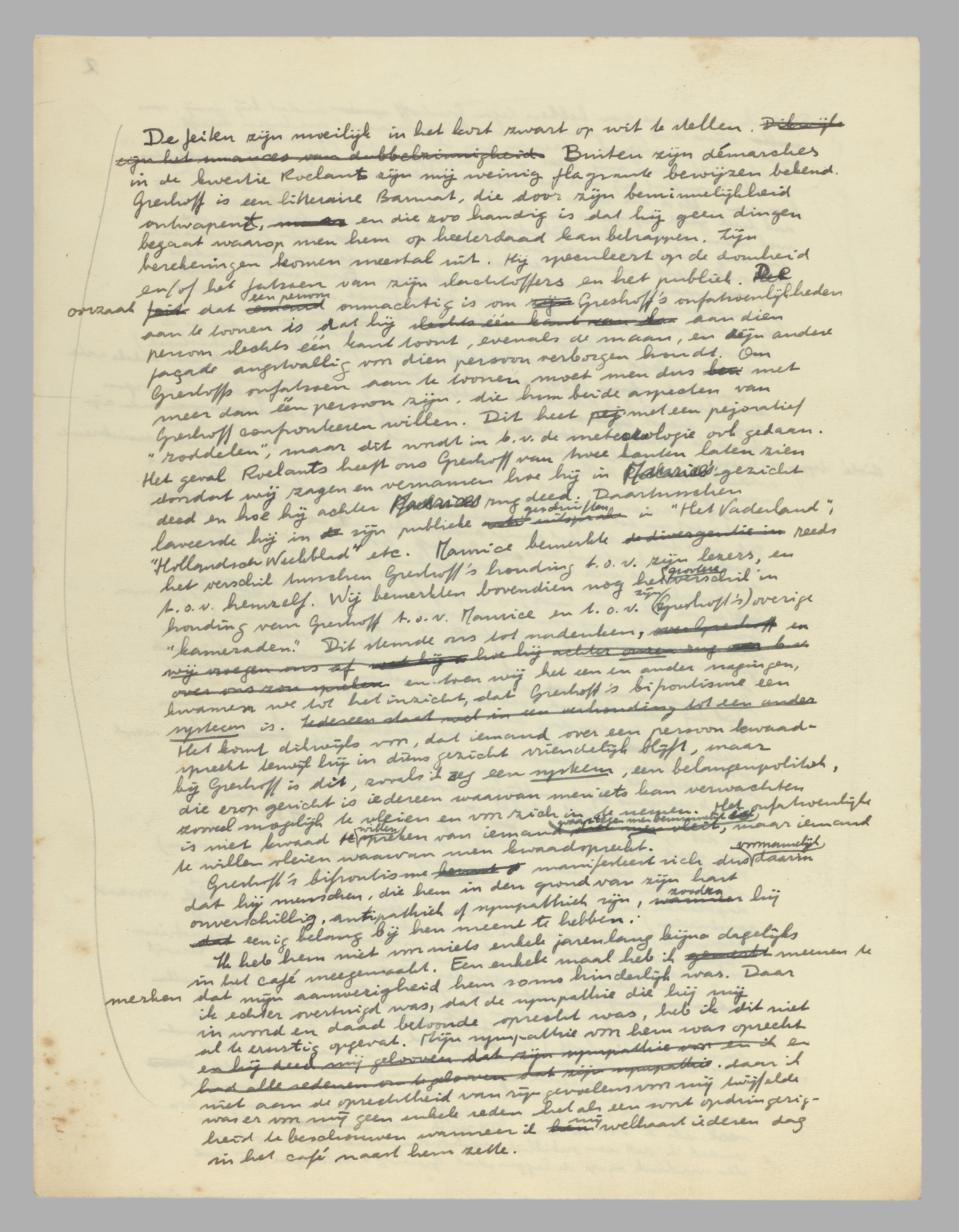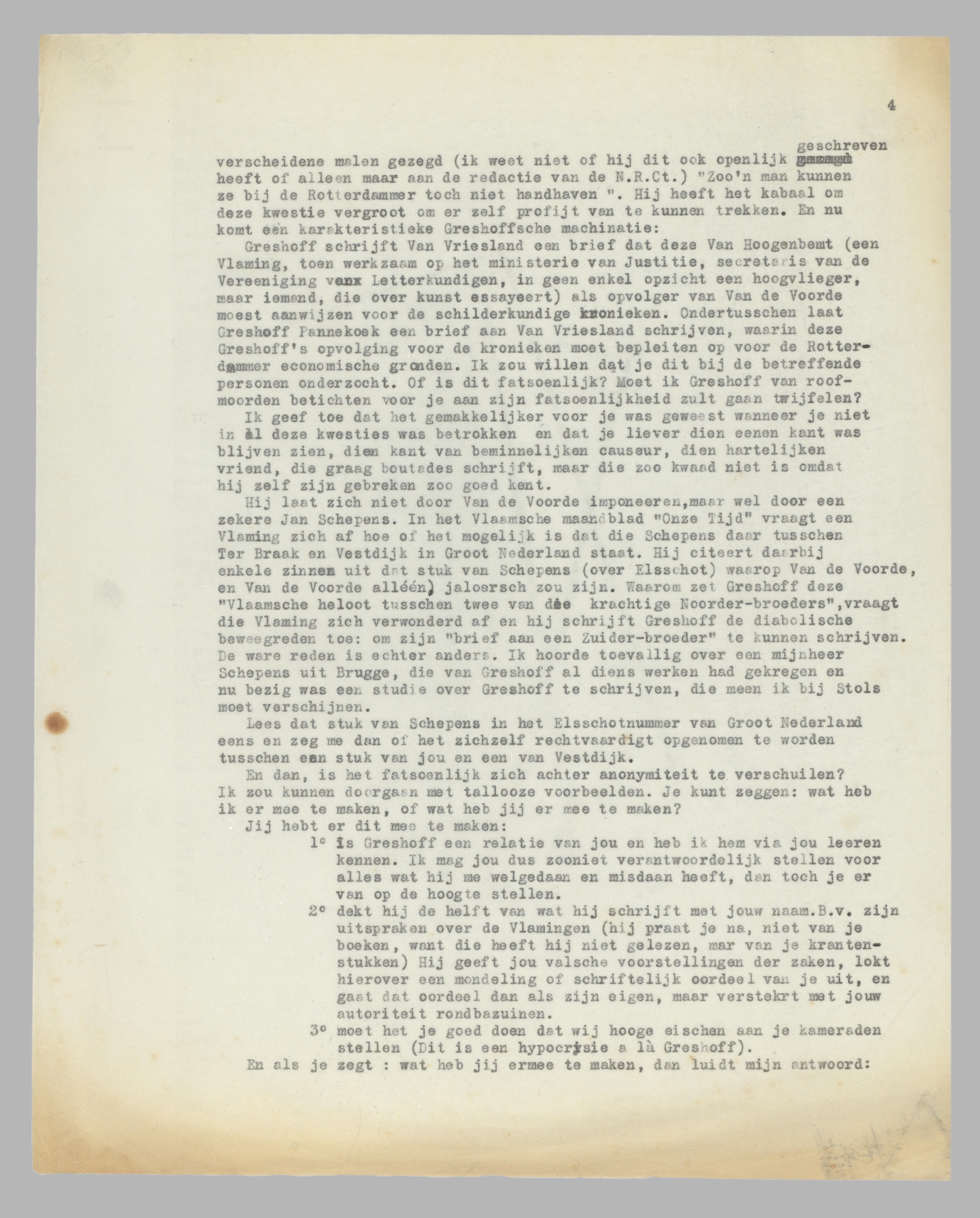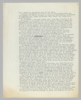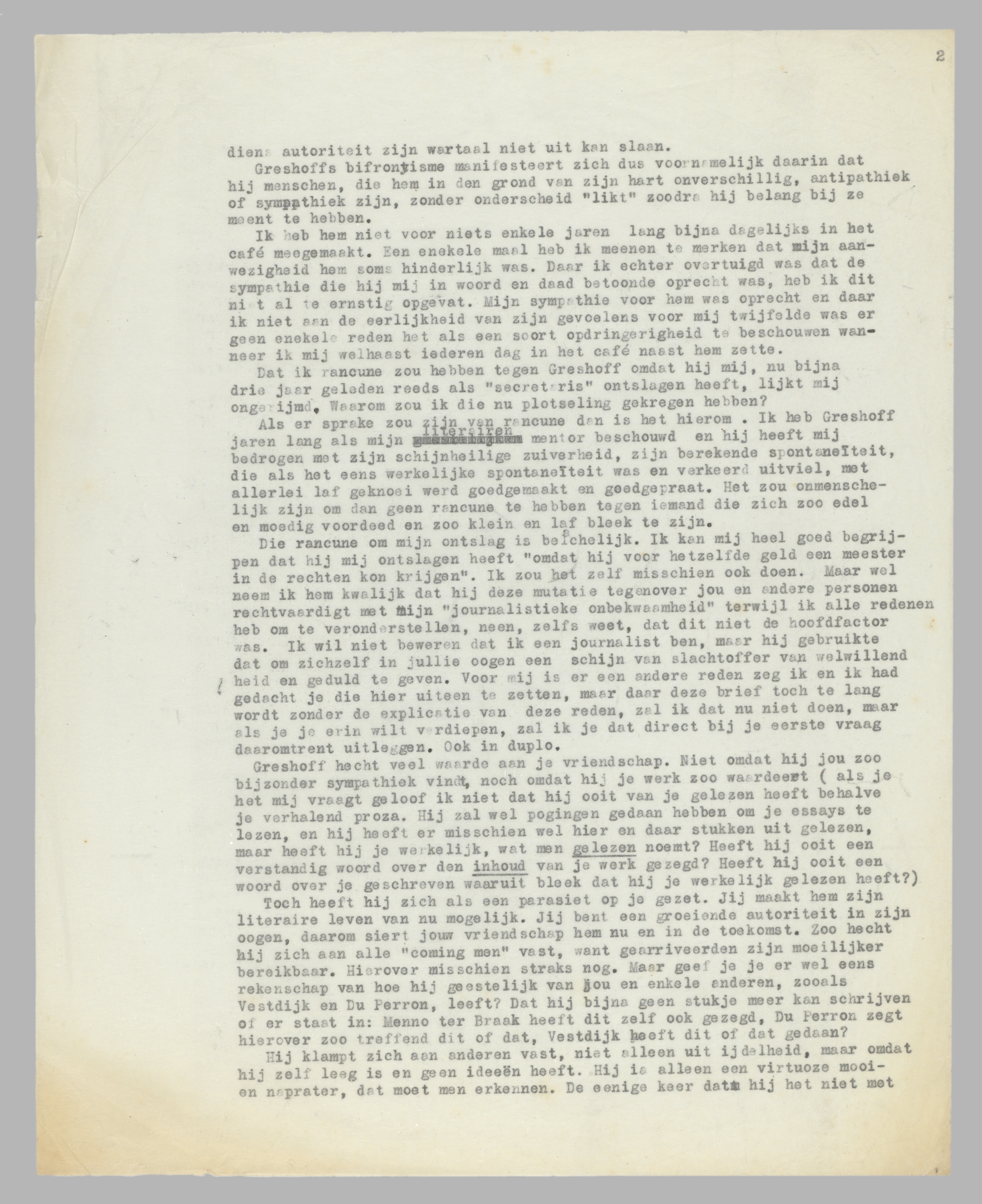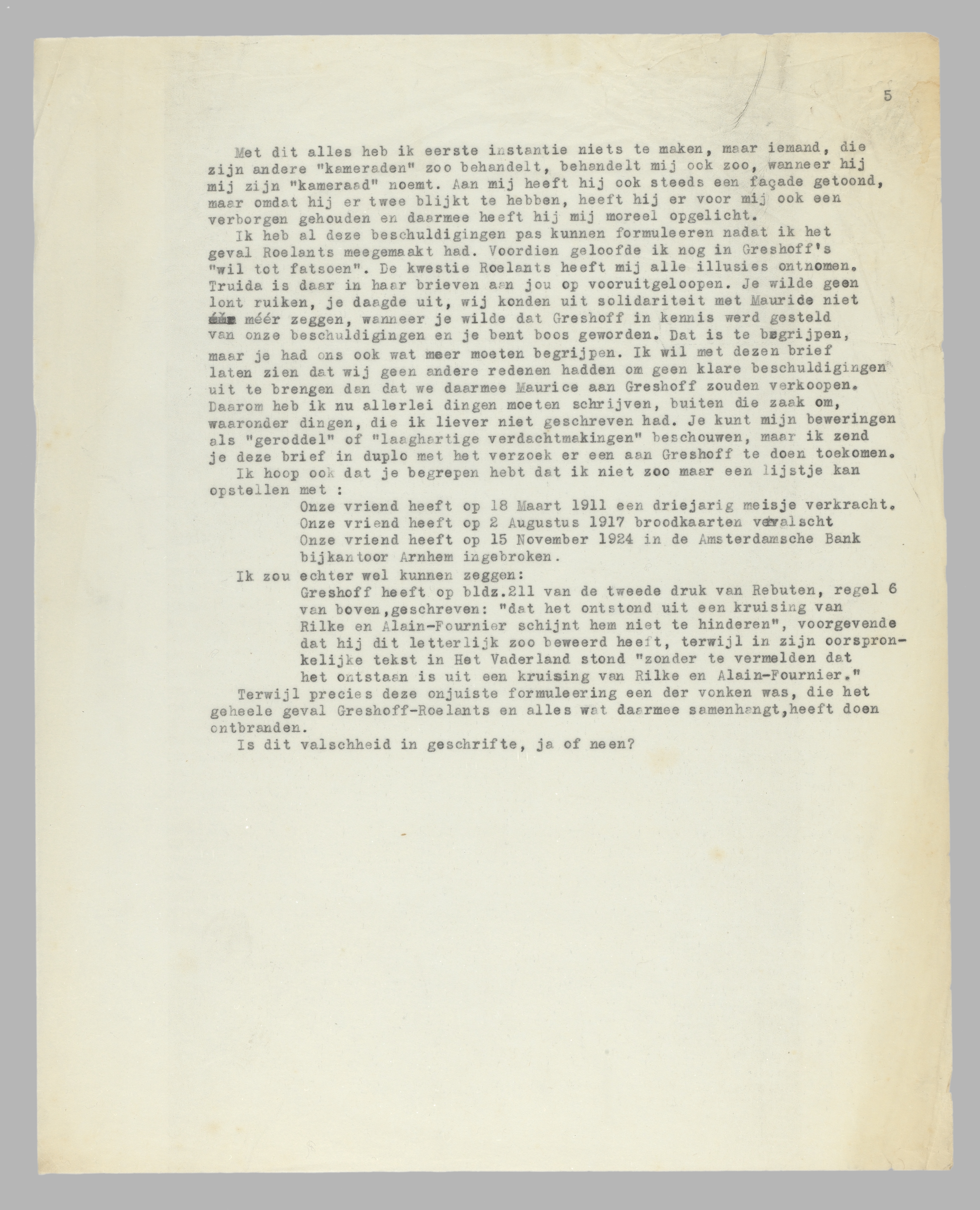 Met dit alles heb ik eerste instantie niets te maken, maar iemand, die zijn andere ‘kameraden’ zoo behandelt, behandelt mij ook zoo, wanneer hij mijn zijn ‘kameraad’ noemt. Aan mij heeft hij ook steeds een façade getoond, maar omdat hij er twee blijkt te hebben, heeft hij er voor mij ook een verborgen gehouden en daarmee heeft hij mij moreel opgelicht. Ik heb al deze beschuldigingen pas kunnen formuleeren nadat ik het geval Roelants meegemaakt had. Voordien geloofde ik nog in Greshoff's ‘wil tot fatsoen’. De kwestie Roelants heeft mij alle illusies ontnomen. Truida is daar in haar brieven aan jou op vooruitgeloopen. Je wilde geen lont ruiken, je daagde uit, wij konden uit solidariteit met Maurice niet méér zeggen, wanneer je wilde dat Greshoff in kennis werd gesteld van onze beschuldigingen en je bent boos geworden. Dat is te begrijpen, maar je had ons ook wat meer moeten begrijpen. Ik wil met dezen brief laten zien dat wij geen andere redenen hadden om geen klare beschuldigingen uit te brengen dan dat we daarmee Maurice aan Greshoff zouden verkoopen. Daarom heb ik nu allerlei dingen moeten schrijven, buiten die zaak om, waaronder dingen, die ik liever niet geschreven had. Je kunt mijn beweringen als ‘geroddel’ of ‘laaghartig verdachtmakingen’ beschouwen, maar ik zend je deze brief in duplo met het verzoek er een aan Greshoff te doen toekomen.