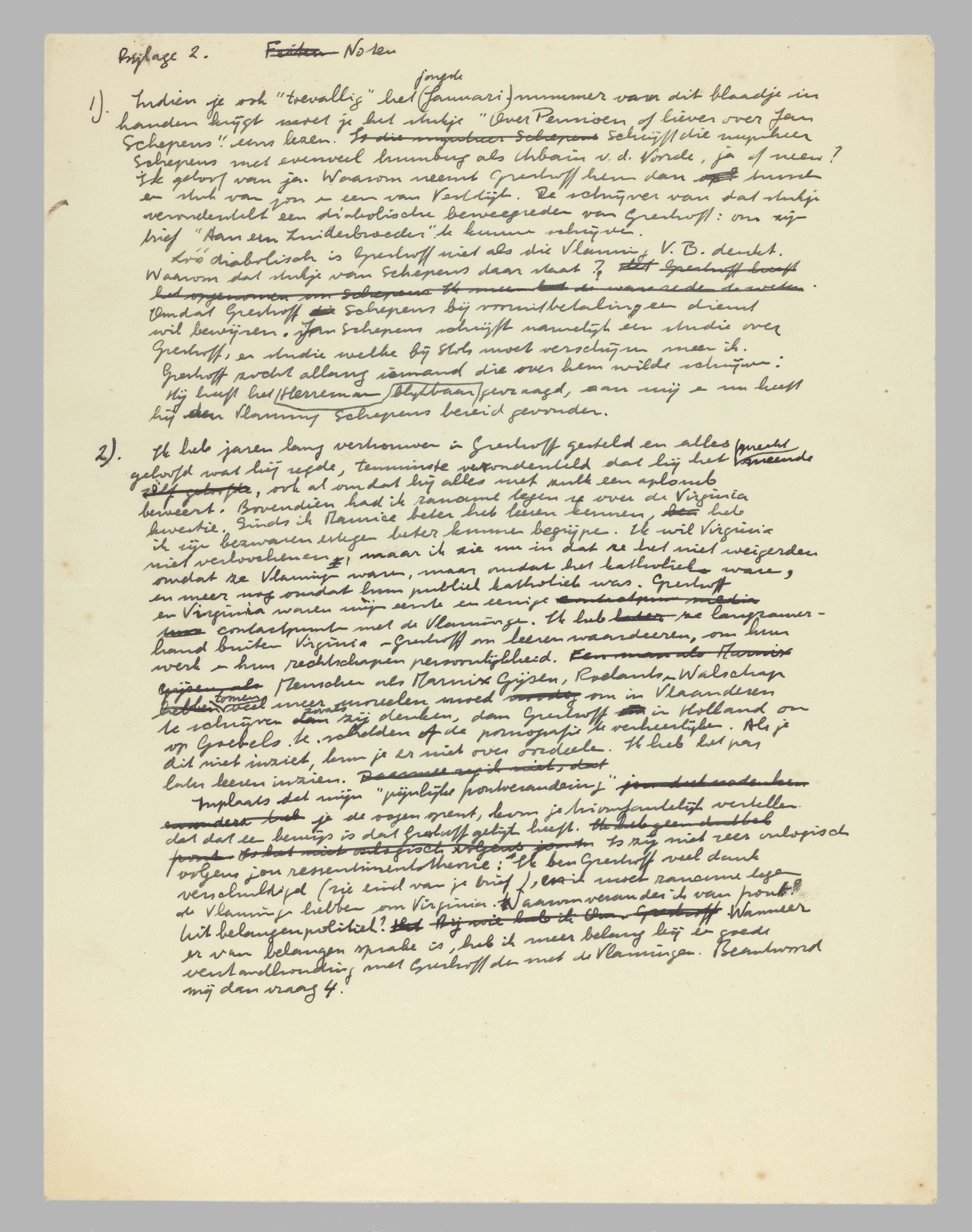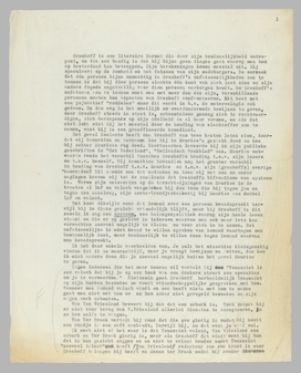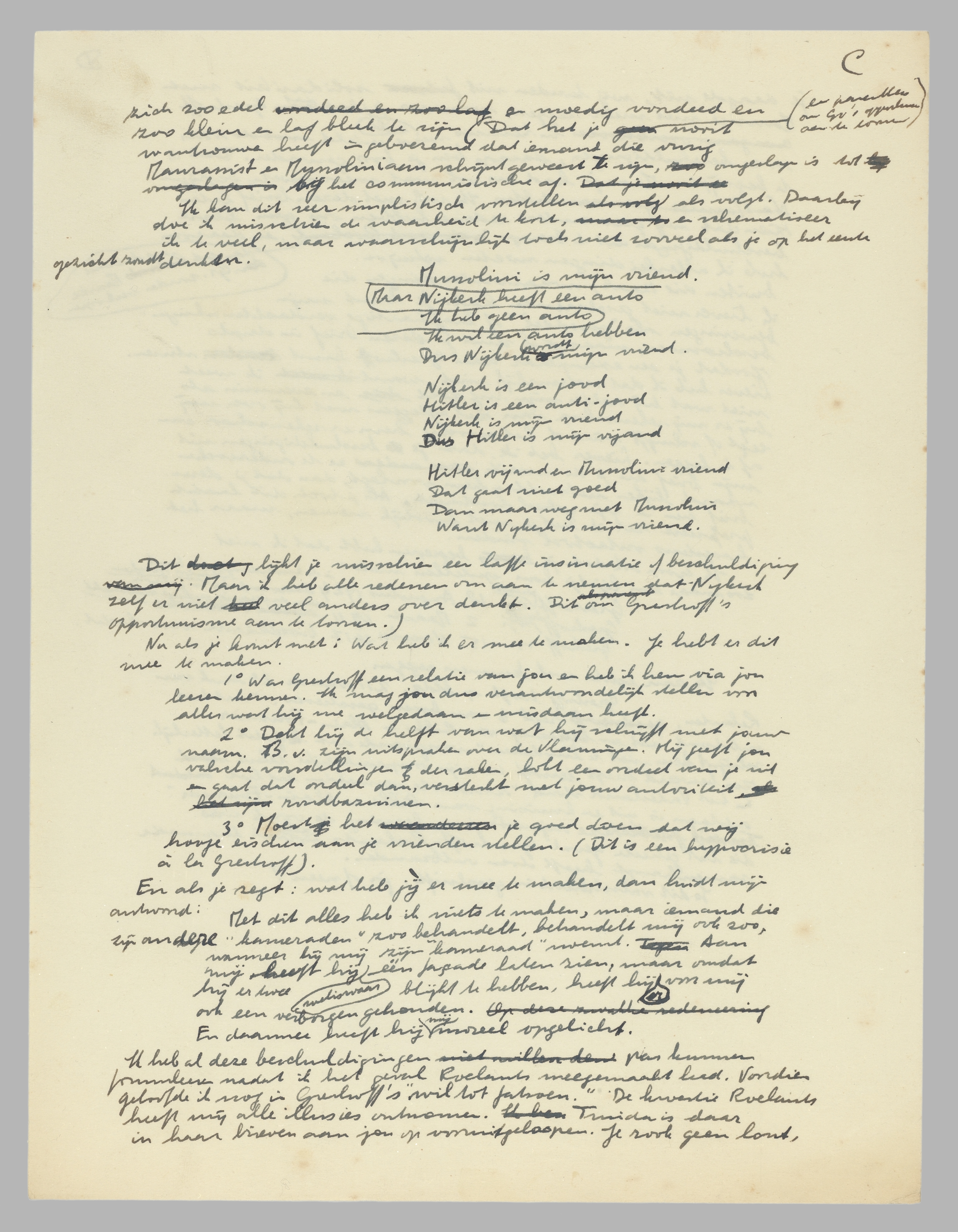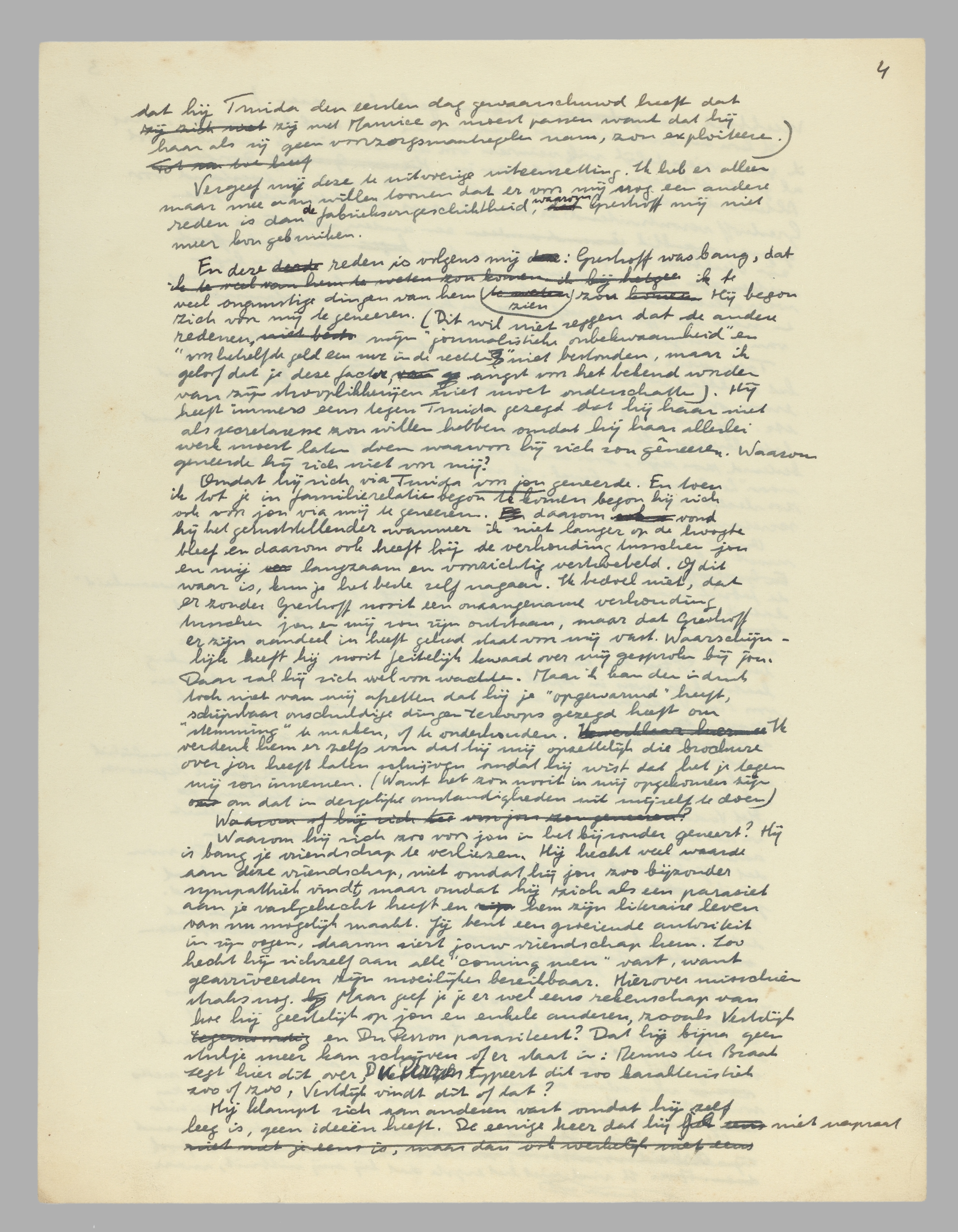 Met dit alles heb ik eerste instantie niets te maken, maar iemand, die zijn andere ‘kameraden’ zoo behandelt, behandelt mij ook zoo, wanneer hij mijn zijn ‘kameraad’ noemt. Aan mij heeft hij ook steeds een façade getoond, maar omdat hij er twee blijkt te hebben, heeft hij er voor mij ook een verborgen gehouden en daarmee heeft hij mij moreel opgelicht. Ik heb al deze beschuldigingen pas kunnen formuleeren nadat ik het geval Roelants meegemaakt had. Voordien geloofde ik nog in Greshoff's ‘wil tot fatsoen’. De kwestie Roelants heeft mij alle illusies ontnomen. Truida is daar in haar brieven aan jou op vooruitgeloopen. Je wilde geen lont ruiken, je daagde uit, wij konden uit solidariteit met Maurice niet méér zeggen, wanneer je wilde dat Greshoff in kennis werd gesteld van onze beschuldigingen en je bent boos geworden. Dat is te begrijpen, maar je had ons ook wat meer moeten begrijpen. Ik wil met dezen brief laten zien dat wij geen andere redenen hadden om geen klare beschuldigingen uit te brengen dan dat we daarmee Maurice aan Greshoff zouden verkoopen. Daarom heb ik nu allerlei dingen moeten schrijven, buiten die zaak om, waaronder dingen, die ik liever niet geschreven had. Je kunt mijn beweringen als ‘geroddel’ of ‘laaghartig verdachtmakingen’ beschouwen, maar ik zend je deze brief in duplo met het verzoek er een aan Greshoff te doen toekomen.
