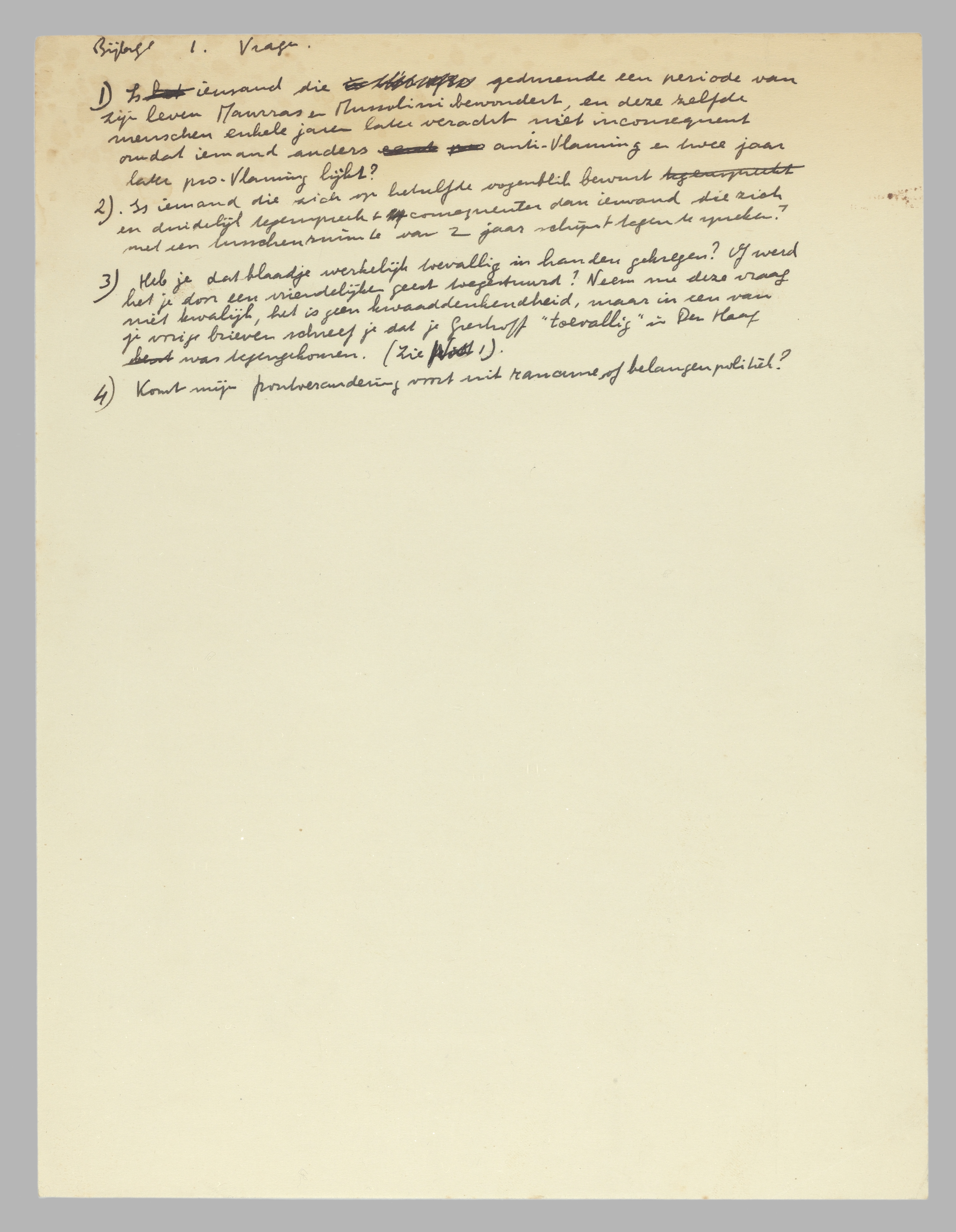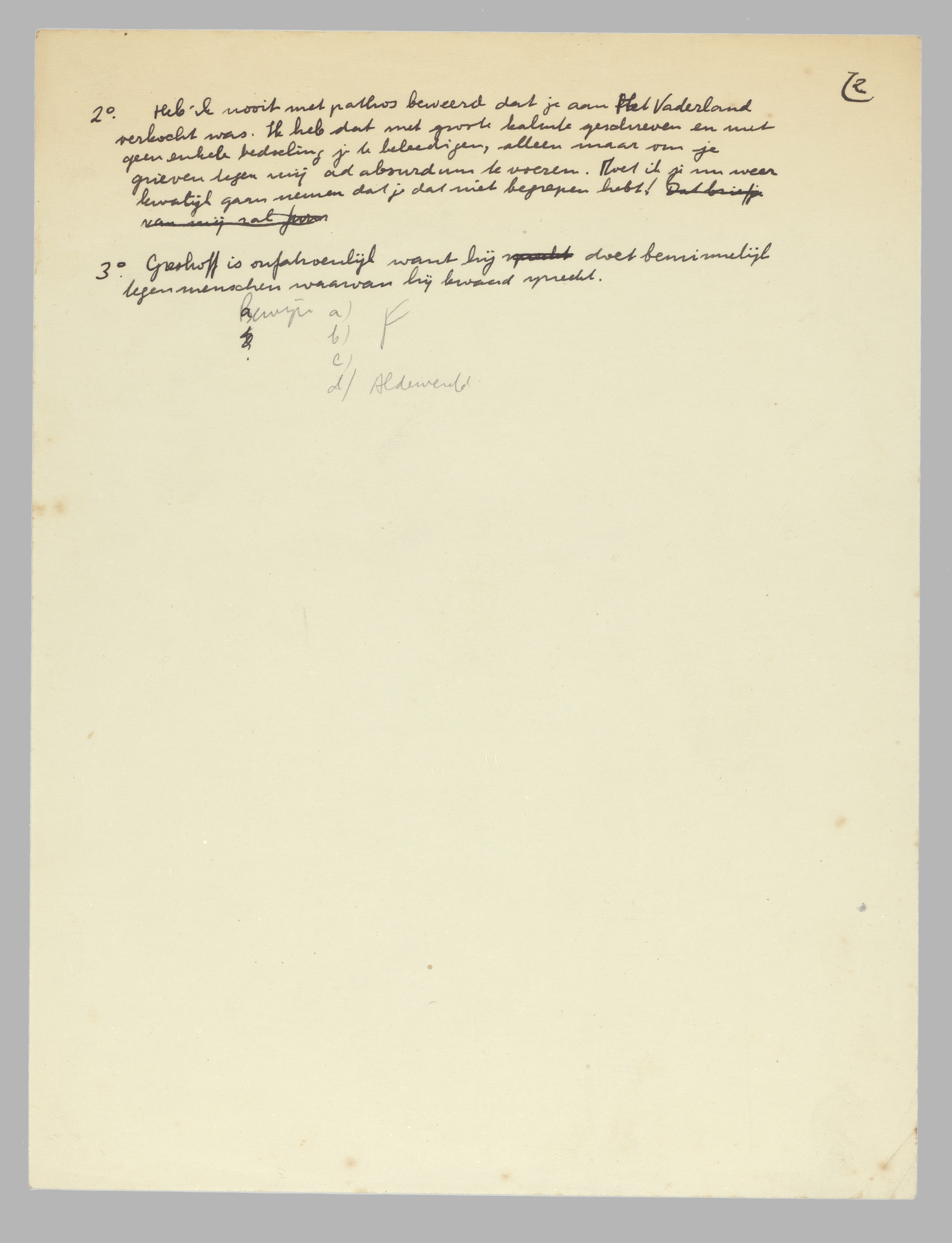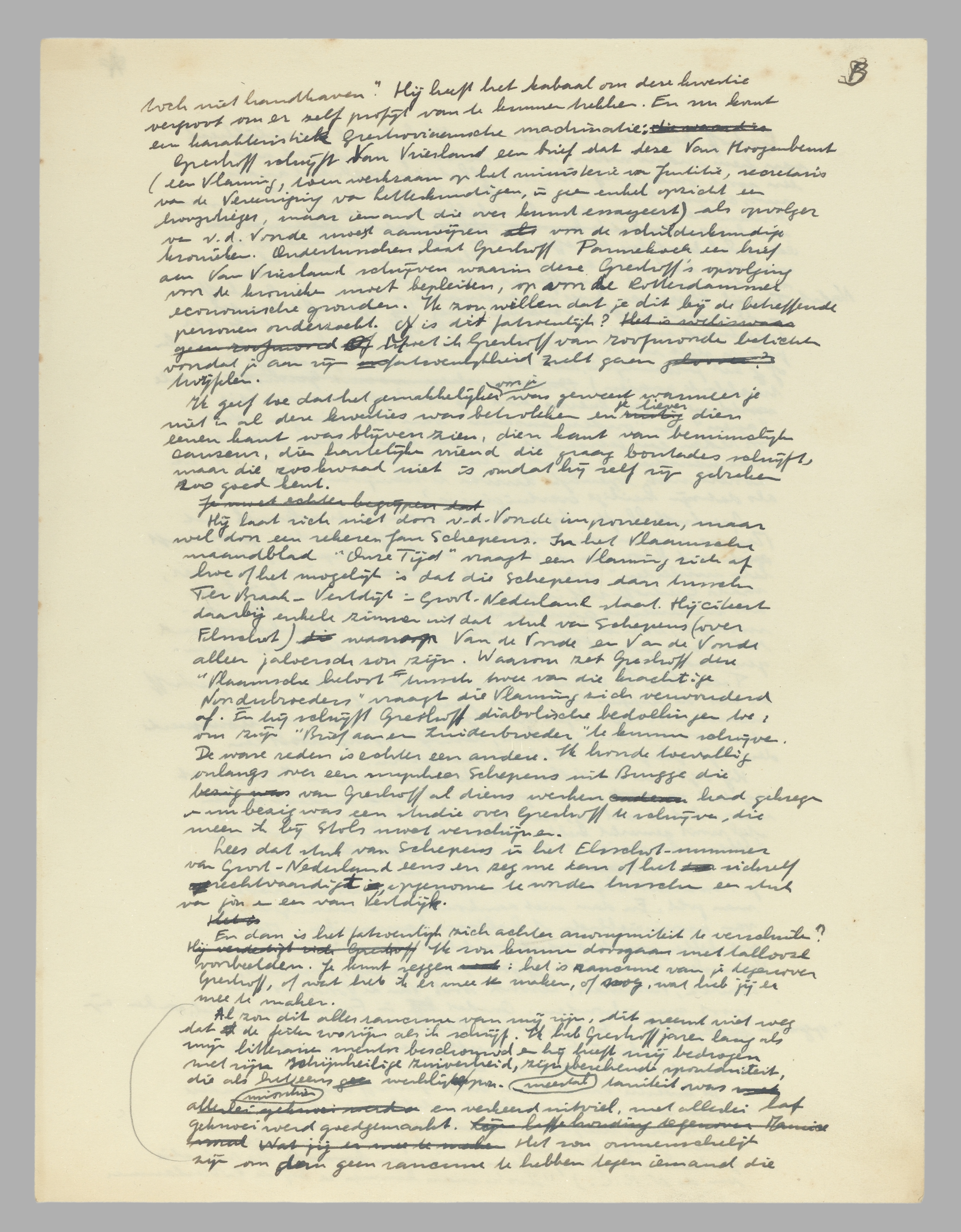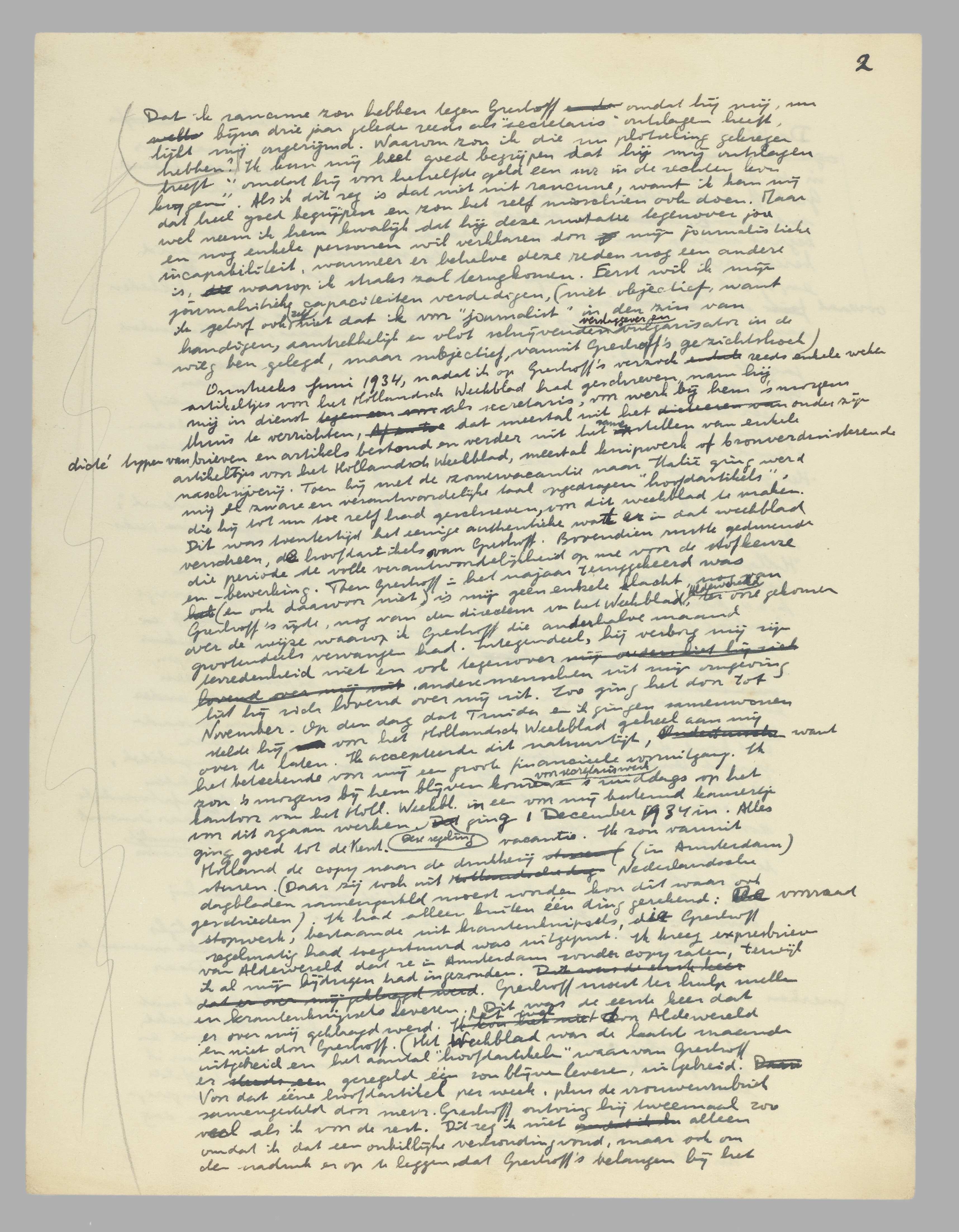 Met dit alles heb ik eerste instantie niets te maken, maar iemand, die zijn andere ‘kameraden’ zoo behandelt, behandelt mij ook zoo, wanneer hij mijn zijn ‘kameraad’ noemt. Aan mij heeft hij ook steeds een façade getoond, maar omdat hij er twee blijkt te hebben, heeft hij er voor mij ook een verborgen gehouden en daarmee heeft hij mij moreel opgelicht. Ik heb al deze beschuldigingen pas kunnen formuleeren nadat ik het geval Roelants meegemaakt had. Voordien geloofde ik nog in Greshoff's ‘wil tot fatsoen’. De kwestie Roelants heeft mij alle illusies ontnomen. Truida is daar in haar brieven aan jou op vooruitgeloopen. Je wilde geen lont ruiken, je daagde uit, wij konden uit solidariteit met Maurice niet méér zeggen, wanneer je wilde dat Greshoff in kennis werd gesteld van onze beschuldigingen en je bent boos geworden. Dat is te begrijpen, maar je had ons ook wat meer moeten begrijpen. Ik wil met dezen brief laten zien dat wij geen andere redenen hadden om geen klare beschuldigingen uit te brengen dan dat we daarmee Maurice aan Greshoff zouden verkoopen. Daarom heb ik nu allerlei dingen moeten schrijven, buiten die zaak om, waaronder dingen, die ik liever niet geschreven had. Je kunt mijn beweringen als ‘geroddel’ of ‘laaghartig verdachtmakingen’ beschouwen, maar ik zend je deze brief in duplo met het verzoek er een aan Greshoff te doen toekomen.