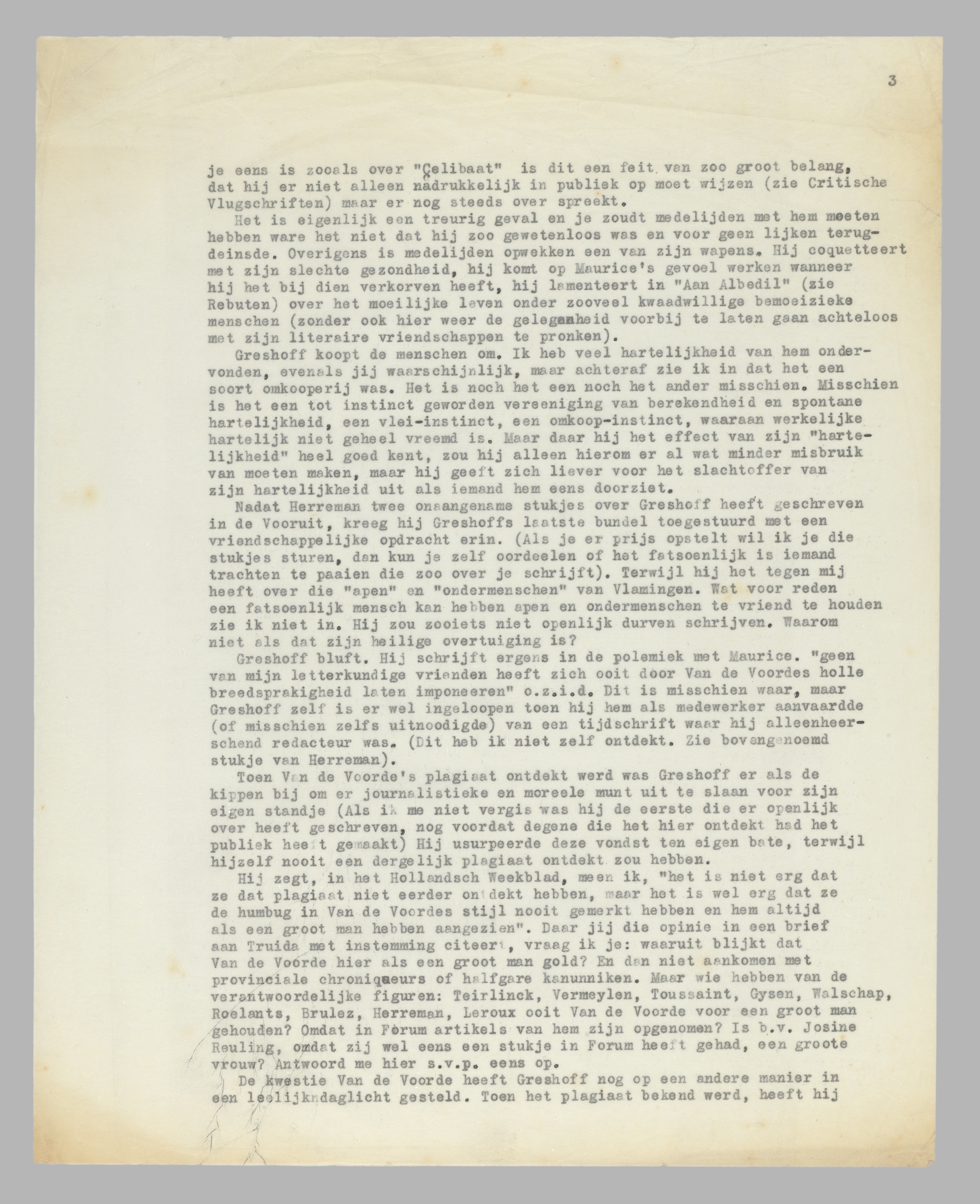 Nadat Herreman twee onaangename stukjes over Greshoff heeft geschreven in de Vooruit, kreeg hij Greshoffs laatste bundel toegestuurd met een vriendschappelijke opdracht erin. (Als je er prijs opstelt wil ik je die stukjes sturen, dan kun je zelf oordeelen of het fatsoenlijk is iemand trachten te paaien die zoo over je schrijft). Terwijl hij het tegen mij heeft over die ‘apen’ en ‘ondermenschen’ van Vlamingen. Wat voor reden een fatsoenlijk mensch kan hebben apen en ondermenschen te vriend te houden zie ik niet in. Hij zou zooiets niet openlijk durven schrijven. Waarom niet als dat zijn heilige overtuiging is?