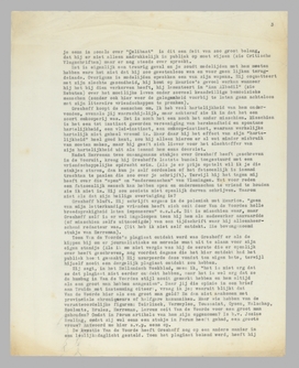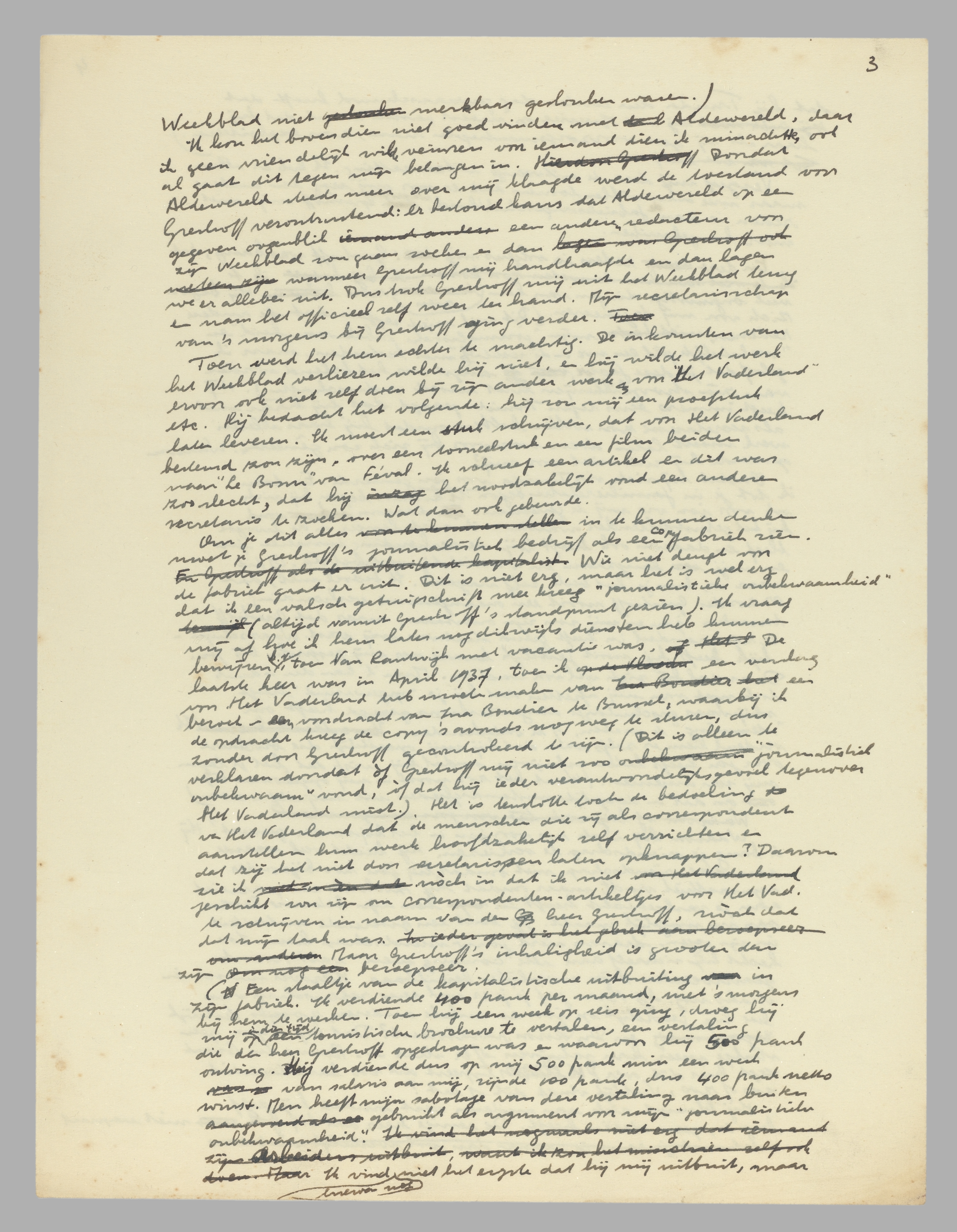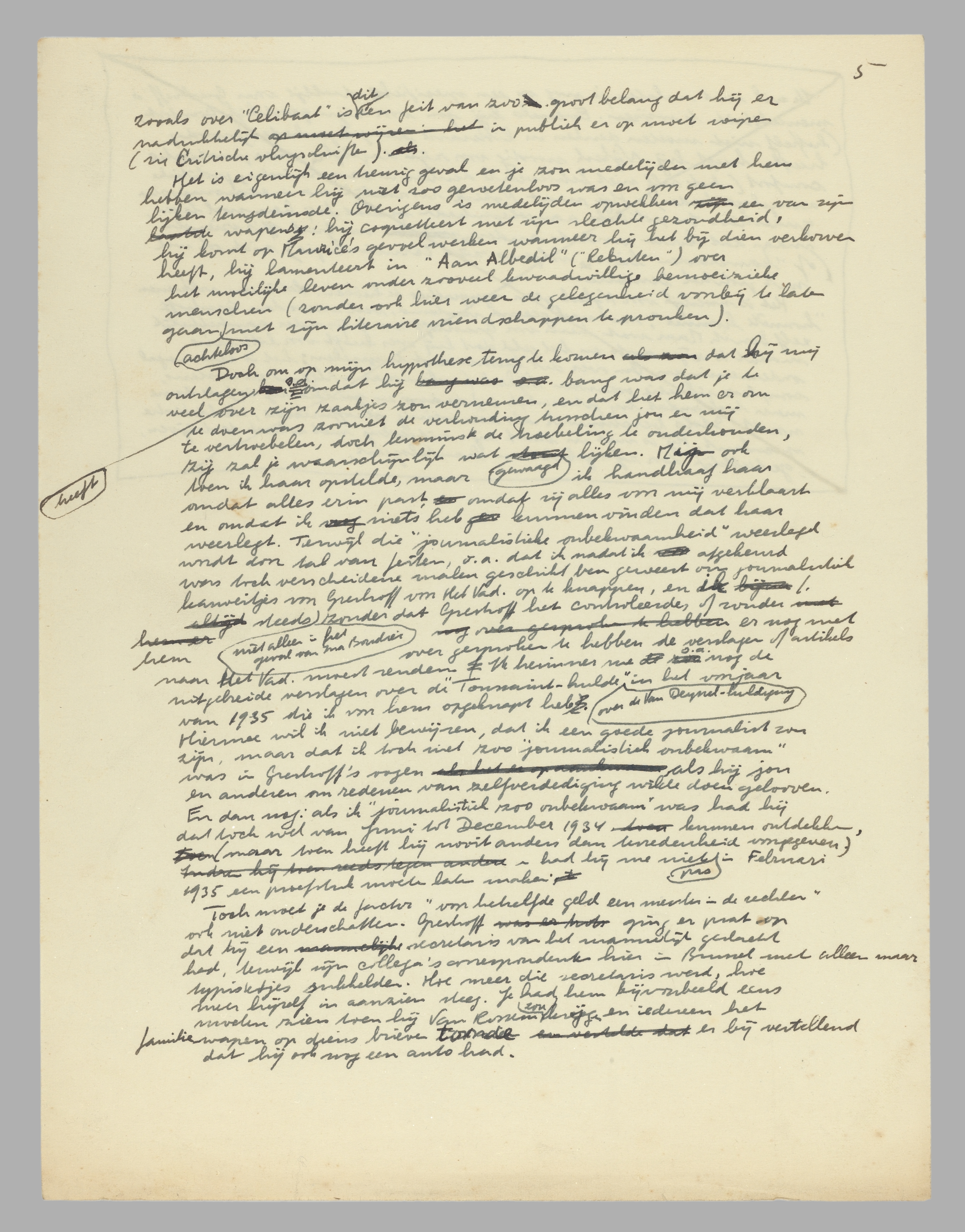 Die rancune om mijn ontslag is belachelijk. Ik kan mij heel goed begrijpen dat hij mij ontslagen heeft ‘omdat hij voor hetzelfde geld een meester in de rechten kon krijgen’. Ik zou het zelf misschien ook doen. Maar wel neem ik hem kwalijk dat hij deze mutatie tegenover jou en andere personen rechtvaardigt met mijn ‘journalistieke onbekwaamheid’ terwijl ik alle redenen heb om te veronderstellen, neen, zelfs weet, dat dit niet de hoofdfactor was. Ik wil niet beweren dat ik een journalist ben, maar hij gebruikte dat om zichzelf in jullie oogen een schijn van slachtoffer van welwillendheid en geduld te geven. Voor mij is er een andere reden zeg ik en ik had gedacht je die hier uiteen te zetten, maar daar deze brief toch te lang wordt zonder de explicatie van deze reden, zal ik dat nu niet doen, maar als je je erin wilt verdiepen, zal ik je dat direct bij je eerste vraag daaromtrent uitleggen. Ook in duplo.
