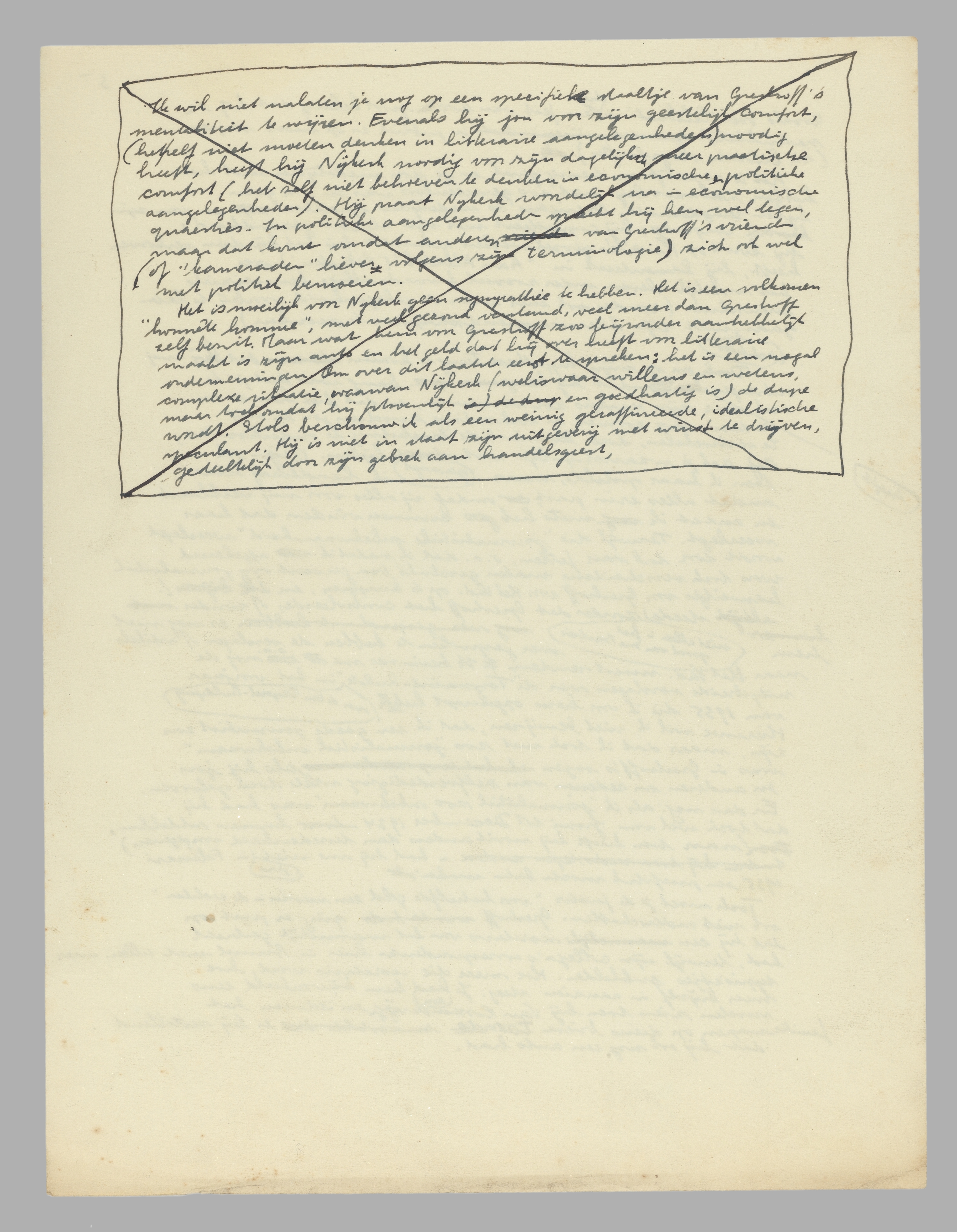 Greshoff hecht veel waarde aan je vriendschap. Niet omdat hij jou zoo bijzonder sympathiek vindt, noch omdat hij je werk zoo waardeert (als je het mij vraagt geloof ik niet dat hij ooit van je gelezen heeft behalve je verhalend proza. Hij zal wel pogingen gedaan hebben om je essays te lezen, en hij heeft er misschien wel hier en daar stukken uit gelezen, maar heeft hij je werkelijk, wat men gelezen noemt? Heeft hij ooit een verstandig woord over den inhoud van je werk gezegd? Heeft hij ooit een woord over je geschreven waaruit bleek dat hij je werkelijk gelezen heeft?)