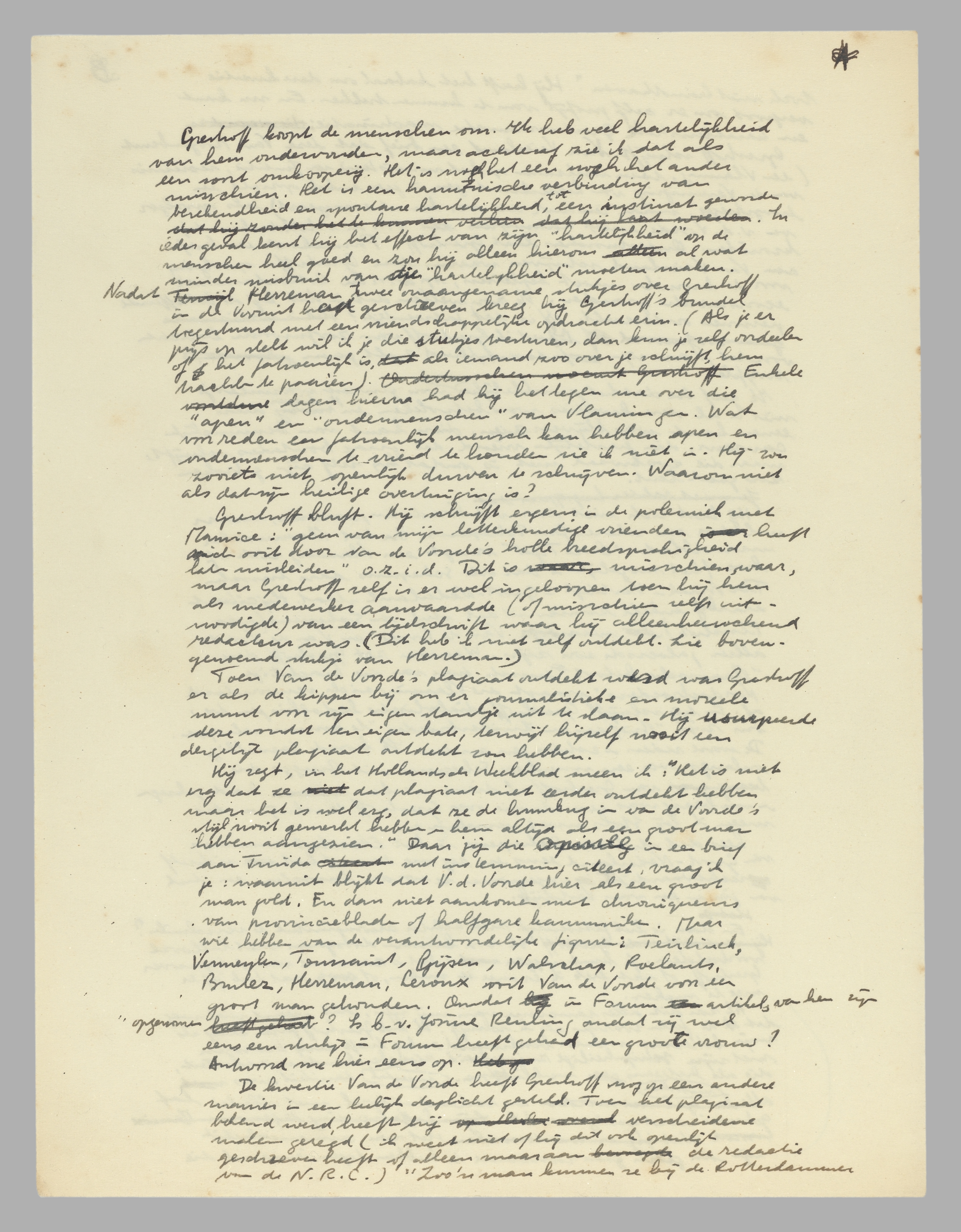 De kwestie Van de Voorde heeft Greshoff nog op een andere manier in een leelijk daglicht gesteld. Toen het plagiaat bekend werd, heeft hij verscheidene malen gezegd (ik weet niet of hij dit ook openlijk geschreven heeft of alleen maar aan de redactie van de N.R.Ct.) ‘Zoo'n man kunnen ze bij de Rotterdammer toch niet handhaven’. Hij heeft het kabaal om deze kwestie vergroot om er zelf profijt van te kunnen trekken. En nu komt een karakteristieke Greshoffsche machinatie: